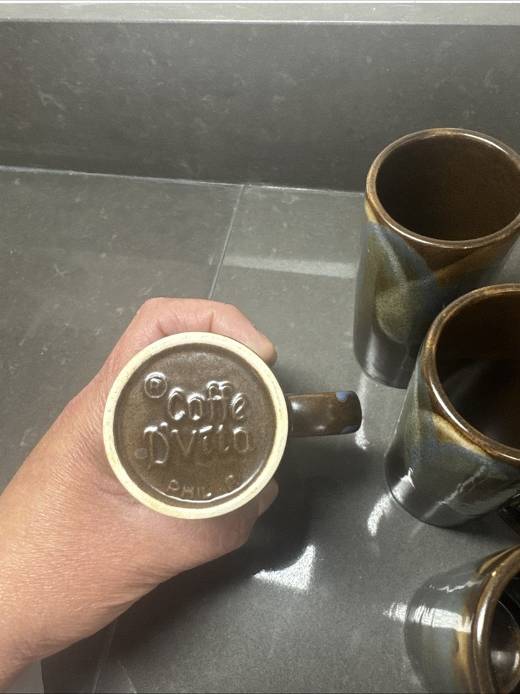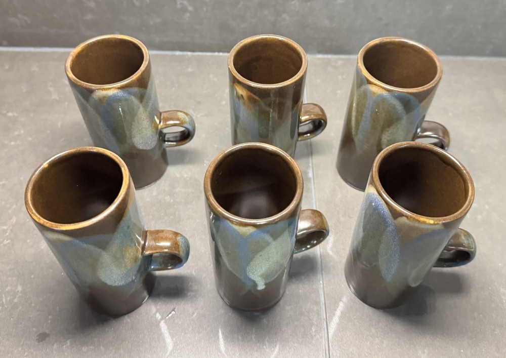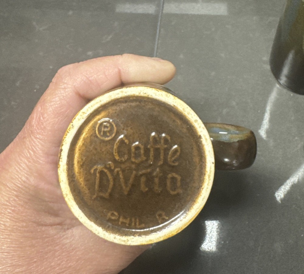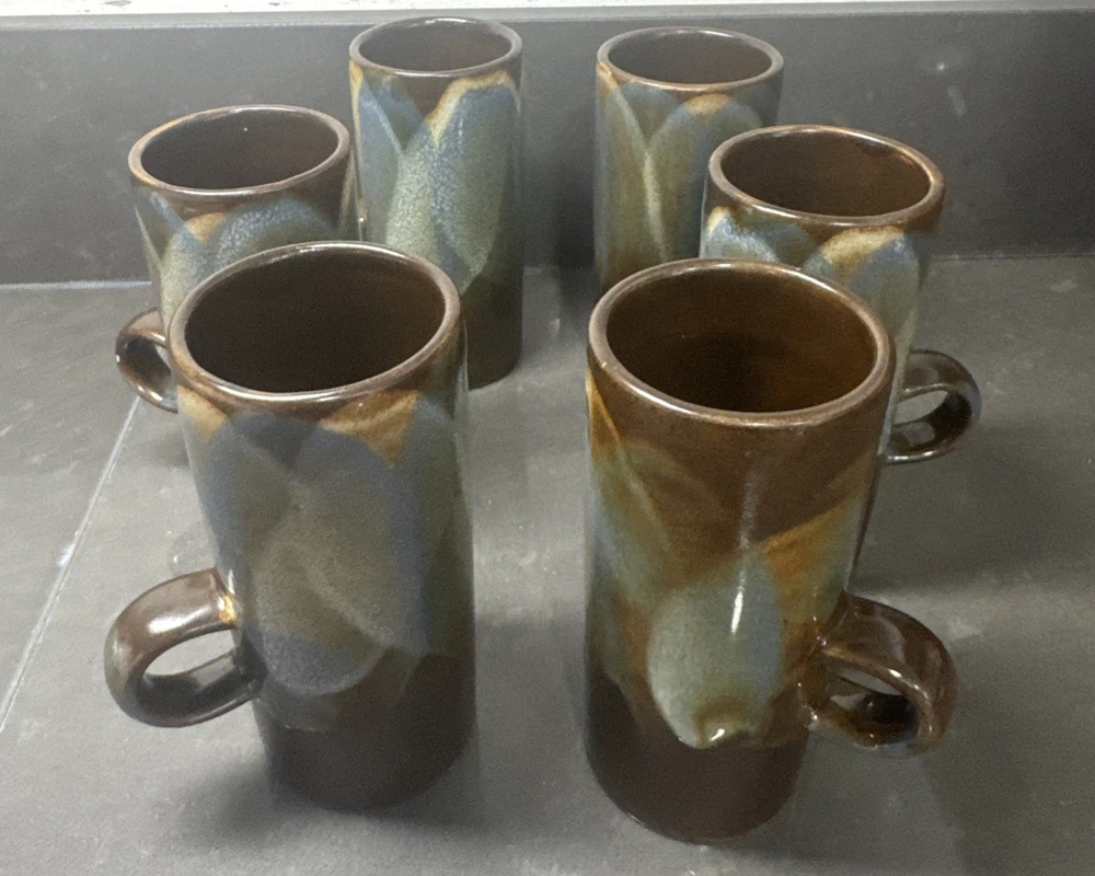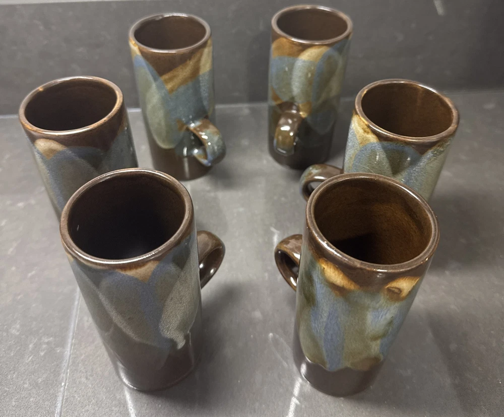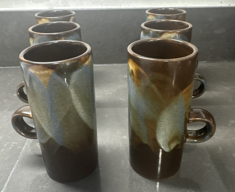 This set of six Caffe D'Vita stoneware mugs is perfect for any hot or cold beverage. The unique drip glazed design and retro style make them perfect for any occasion. Each mug has a 4 oz capacity and is made of high-quality stoneware. The mugs were manufactured in the 1970s and are in excellent condition. They are perfect for collectors or anyone who loves retro kitchenware. The multicolor design is sure to add a touch of vintage charm to any kitchen or dining room. Get your hands on this one-of-a-kind set of espresso cups today!