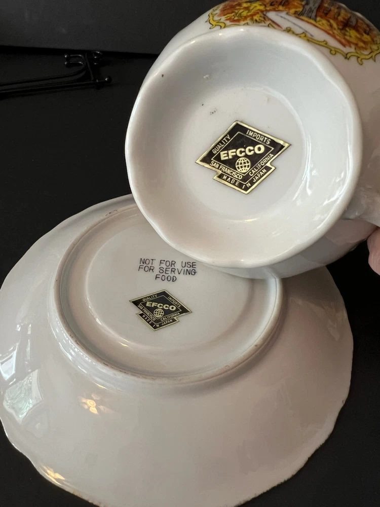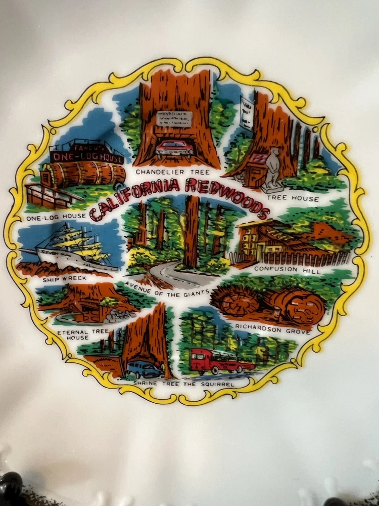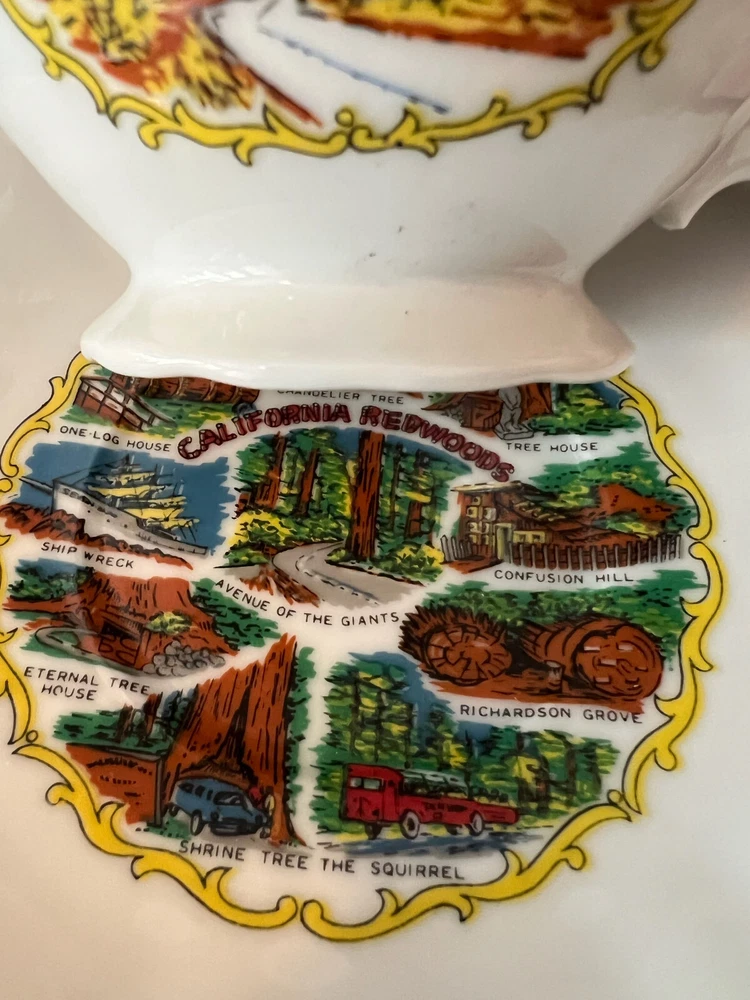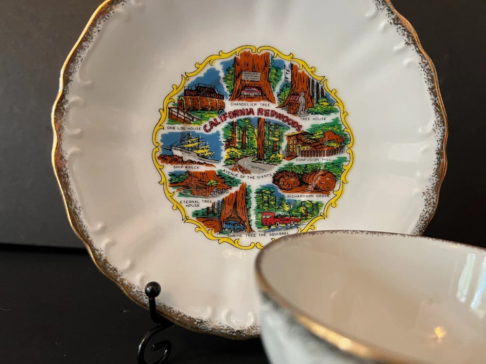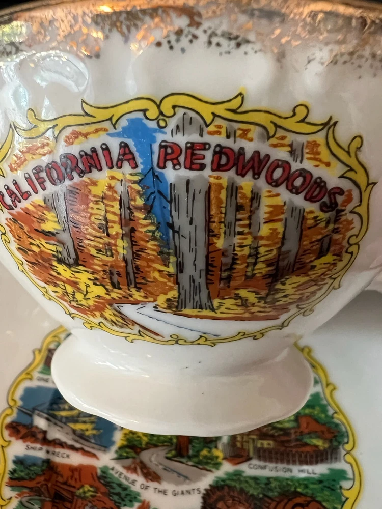 Vintage California Redwoods Souvenir Tea Cup And Saucer Set-Japan. Nice condition no chips or cracks . Cup stands about 2.25 inches high and the Saucer is about 6.25 wide . It is heavier 110z so it will need the 2 pounds of shipping sorry . Thanks for looking