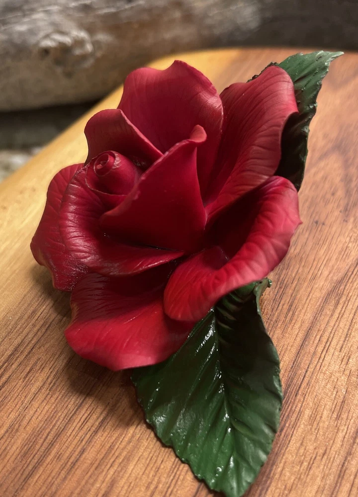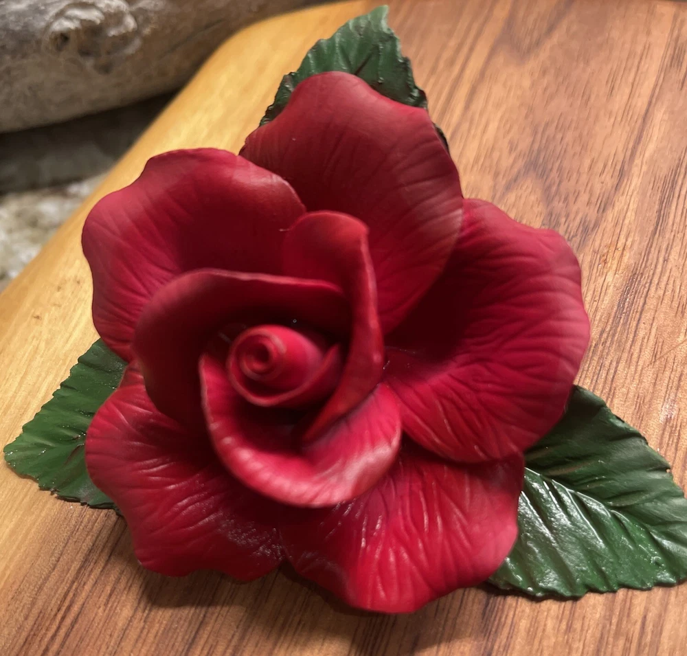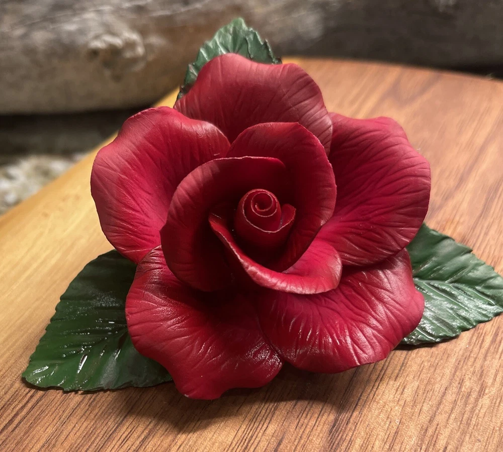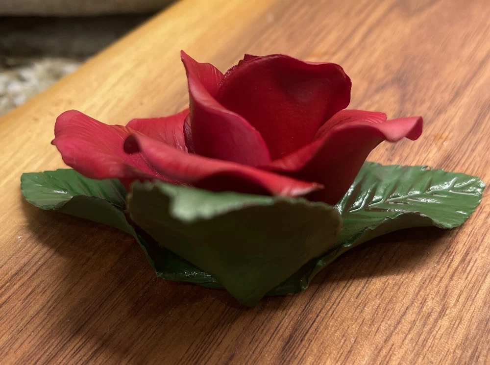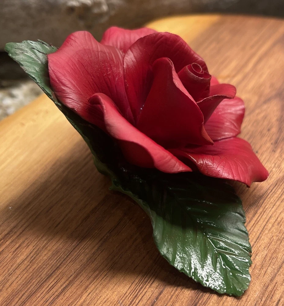 Stunning red rose with three leaves. Delicate and exquisitely crested red rose. Capodimonte porcelain made in Italy. Perfect condition as a gift for a loved one , or for yourself!