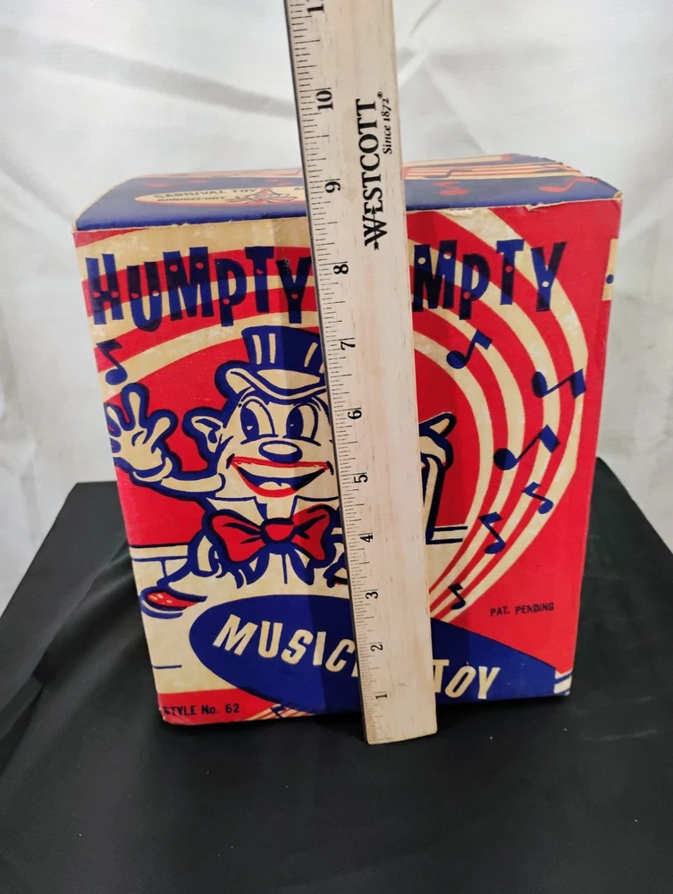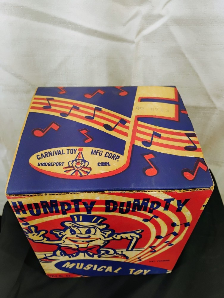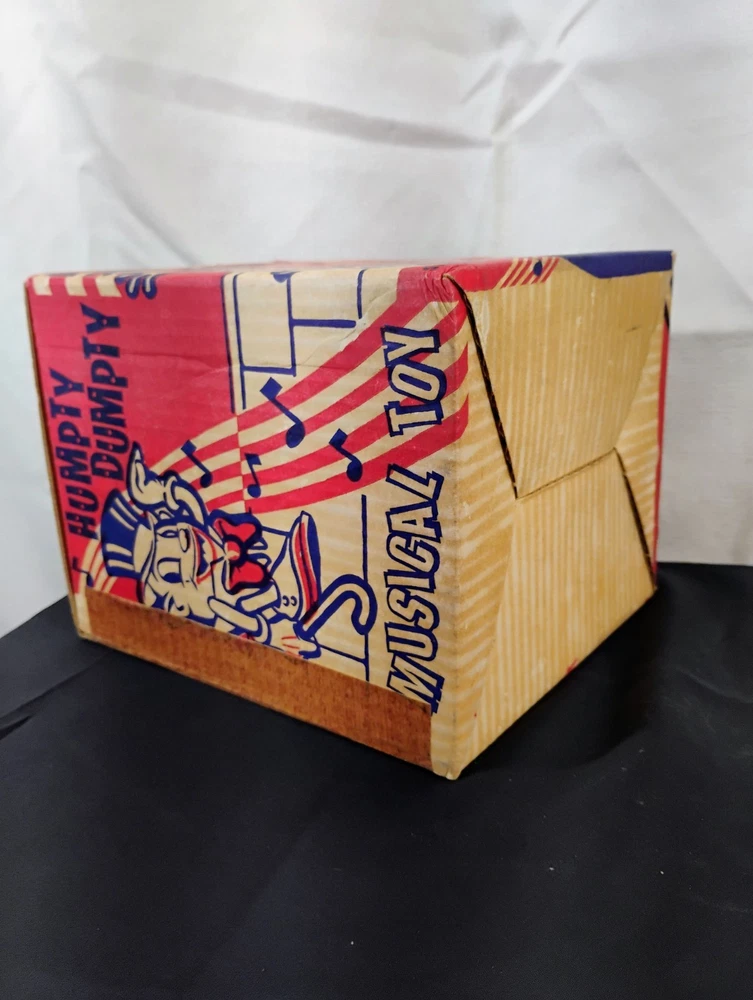 The Vintage Carnival Toy Musical Humpty Dumpty Toy Box is a nostalgic piece that would have once contained a toy meant to spin and play music based on the classic nursery rhyme. This collectible item is a perfect addition for collectors of vintage and antique toys, especially those interested in musical toys from carnivals or amusement parks. The box alone adds value to any collection and serves as a great reminder of simpler times and childhood memories. Thank you for visiting my listing today and thank you for your interest in this item! My goal is to have a pleasant transaction resulting in a satisfied customer. I hope any transaction between us leaves you with a feeling of confidence knowing you can trust me and the items I offer here. *Most if not all my listings are set to accept offers. Feel free to send an offer and I will be happy to consider it!! *Please contact me with any questions or concerns and I will be happy to help. *Always examine the photos carefully, and if in doubt, email me with any questions you may have. *Please note that condition statements are offered as a guide only. They will always be somewhat subjective and reflect our opinion, which may not necessarily agree with someone else's opinion. PLEASE READ: I aim to please and I want my buyers to have a positive transaction with me. If you have questions, concerns, or special requests related to any of my items I hope you will contact me so we can work them out to your satisfaction. I sell my items to give you a great item at a decent price while making a little profit at the same time. If you feel the item you are interested in is too pricey do not hesitate to send me a fair offer and I will consider it. My goal is to satisfy your needs and mine so both parties can benefit. SHIPPING: If you prefer a different shipping method or company please contact me and I will do all I can to make that happen. If you have concerns or requests about the packaging of your item contact me and I will do all I can to accommodate them. Shipping costs are based on location in each state or country, the costs always differ. After I have received your payment I will ship your item out within 3 business days or less excluding weekends and holidays. BEFORE PURCHASING & BIDDING: **Please see all the pictures. I do not have great photography skills but I try to get the most accurate photos I can. If you are unsure about something you see in a photo contact me so I can do what I am able to answer your concern about the item. **I cannot stress enough that if you have any questions or concerns please contact me before purchasing and bidding. Communication can solve so much. **As a customer myself, I understand the meaning of customer satisfaction and my goal is to have nothing but satisfied customers. If you are not unsatisfied with your purchase I ask that you please contact me so I can take care of your issue. My goal is for you to be 100% satisfied. INTERNATIONAL BUYERS WELCOMED - PLEASE NOTE: I welcome International buyers! Please be aware that any custom/duties/taxes that the parcel might incur once it is out of the USA are the responsibility of the buyer. Please check with your country's customs office to determine what these additional costs will be prior to bidding or buying. Please refer to the eBay Site Map for more information if needed.
