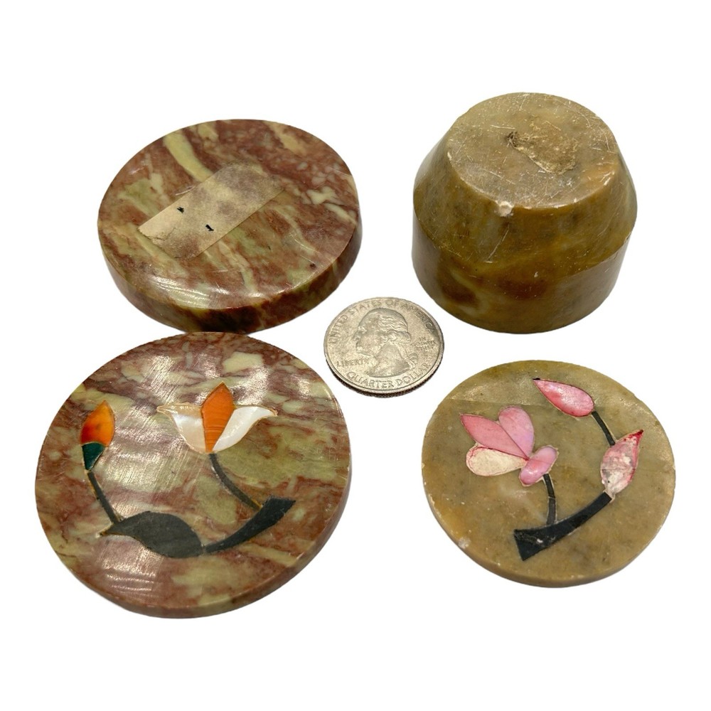 TWO TRINKET BOXES A terrific lot miniature soapstone trinket boxes made with intricate detail. Items show no observed damage. Expect age appropriate wear but nothing that takes away from their charm. Please see all images for further details. Be sure to see all our other items for possible bundle and shopping deals! Will pack with extra care and attention that vintage items require. Quick shipping guaranteed. Returns accepted at buyer’s expense. Display boxes and props not included unless otherwise noted. Own this lovely lot! We are a reputable seller! Check out our reviews to see what customers say about our products and service. You won’t regret trusting Fairfield for your online purchase.