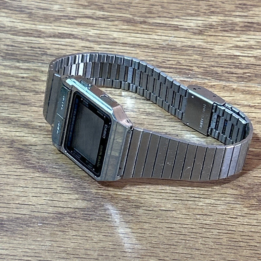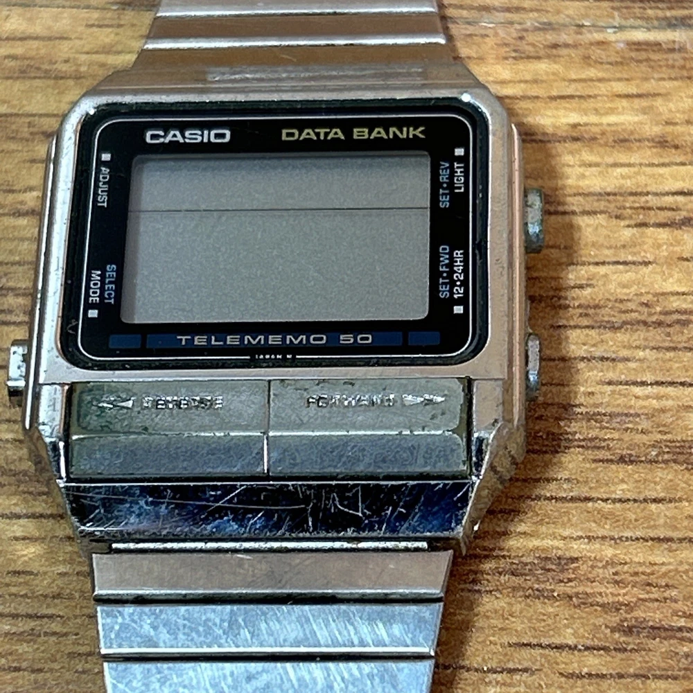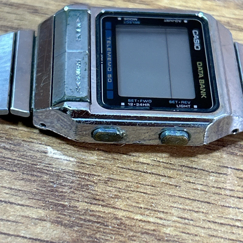 This vintage Casio DB-500 TELEMEMO 50 DATA BANK watch is a rare find for watch collectors and enthusiasts. Made in Japan, this wristwatch features a digital display, quartz movement, and a two-piece strap. The silver bezel color, Arabic numerals, and luminous dial make for a classic and sporty look. This Casio Databank model comes with a variety of features such as a date indicator, day/night indicator, world time, and a chronometer. It is also water-resistant, has a mineral crystal, and an easy-to-read large numeral display. Although it needs a battery, this limited edition watch is in great condition and is a must-have for any watch lover. need a new battery Does not include box or some other accessories ONLY comes with what's pictured. Please review pictures prior to purchase. We apprecdiate all business and would recommend sending a message if any issue or concern comes up. Thanks!”