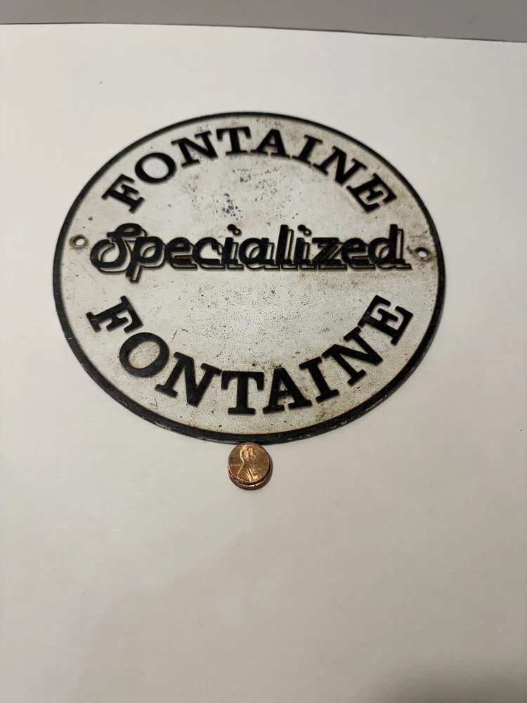 This vintage Fontaine specialized sign is a must-have for any collector. Made of durable cast aluminum, this sign is a unique piece of memorabilia that will add character to any collection. Perfect for display in a man cave, garage, or any other space dedicated to vintage advertising, It measures approximately 8 1/4” in diameter and is in good condition with normal wear. See photos for condition.