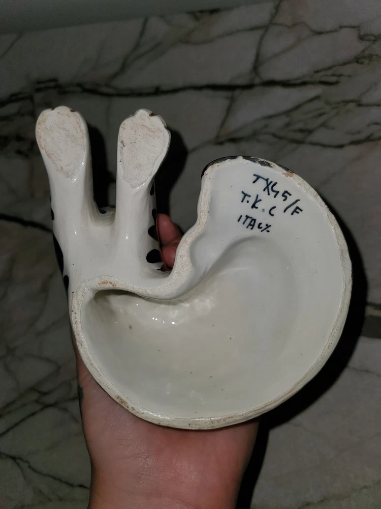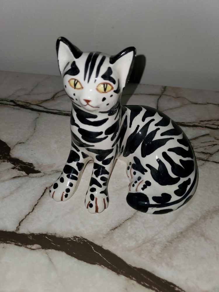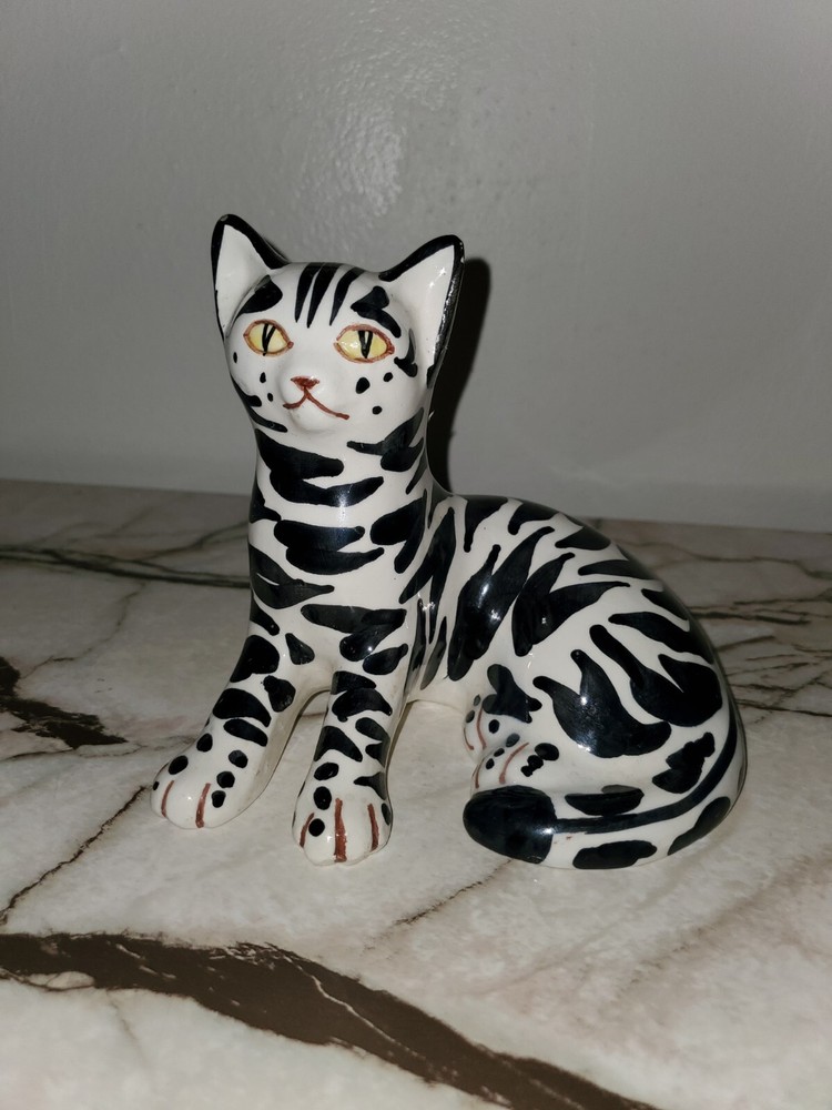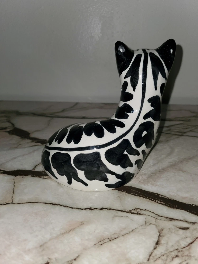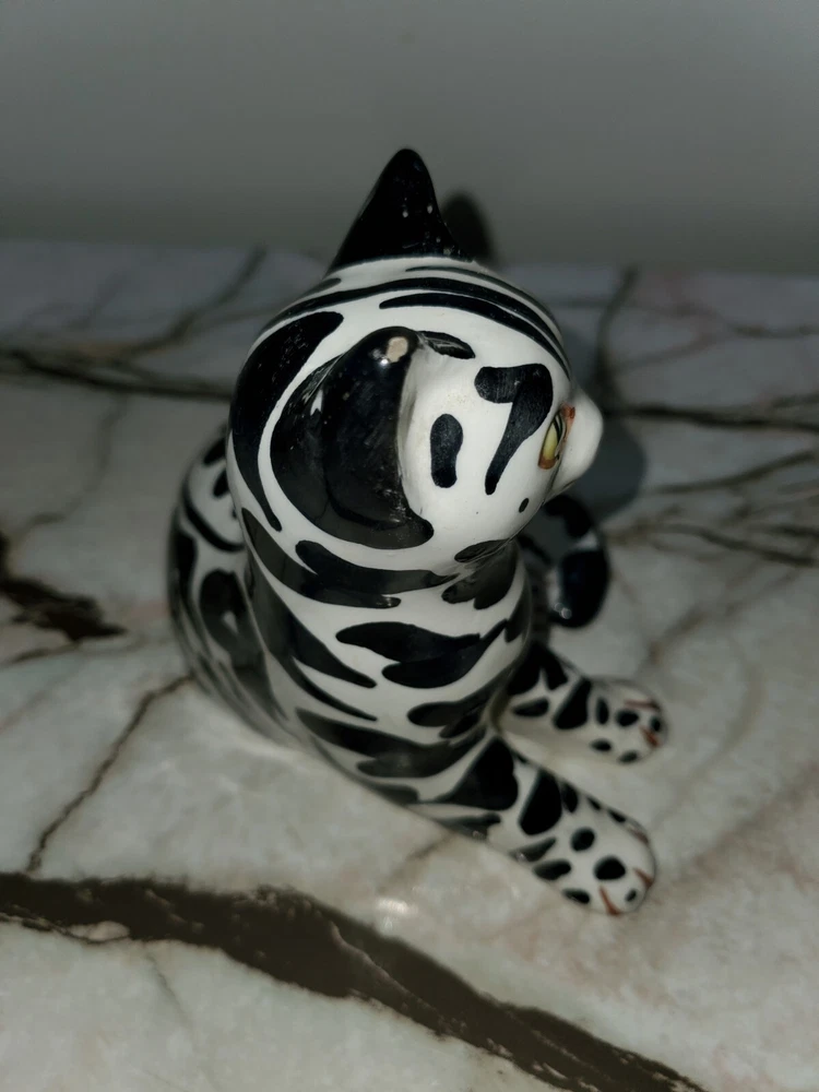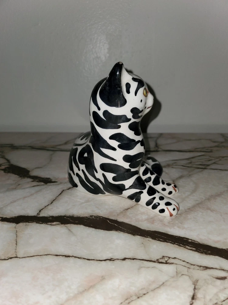 Hand painted ceramic cat figurine features a bold black and white spotted and striped pattern reminiscent of a leopard or zebra. This mid-century style piece was crafted in Italy and serves as a striking decorative accent for a shelf or mantel. The stylized feline form includes hand-detailed facial features with yellow eyes and a seated posture. Measurements: • Height: 4.75" Condition: Vintage pre owned condition. There is a small chip on the tip of the left ear and minor surface wear consistent with age. No other cracks or repairs noted. Details: Material: Ceramic Color: Black, White, Yellow Era: Vintage (pre-2007) Origin: Italy Labels/Signatures: Hand marked TX45/F T.K.C. ITALY on the underside. All items are vintage or pre owned and may show age related wear. Photos are part of description. Minor imperfections and production variations are normal in vintage pieces.