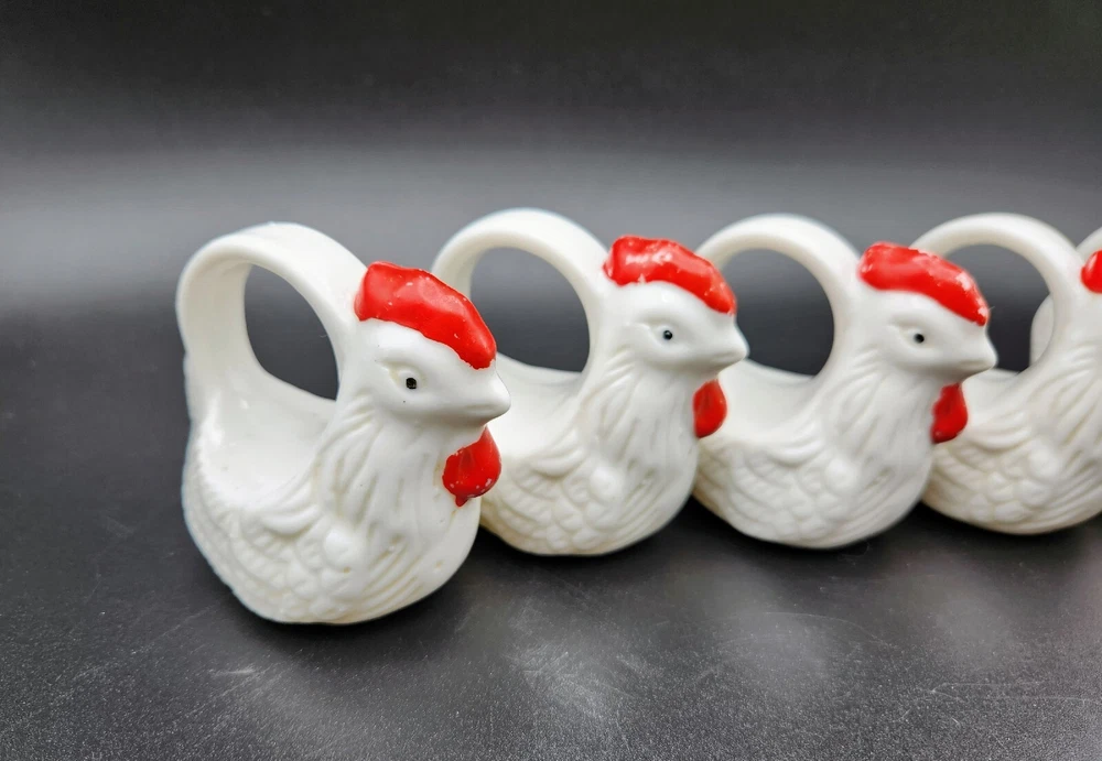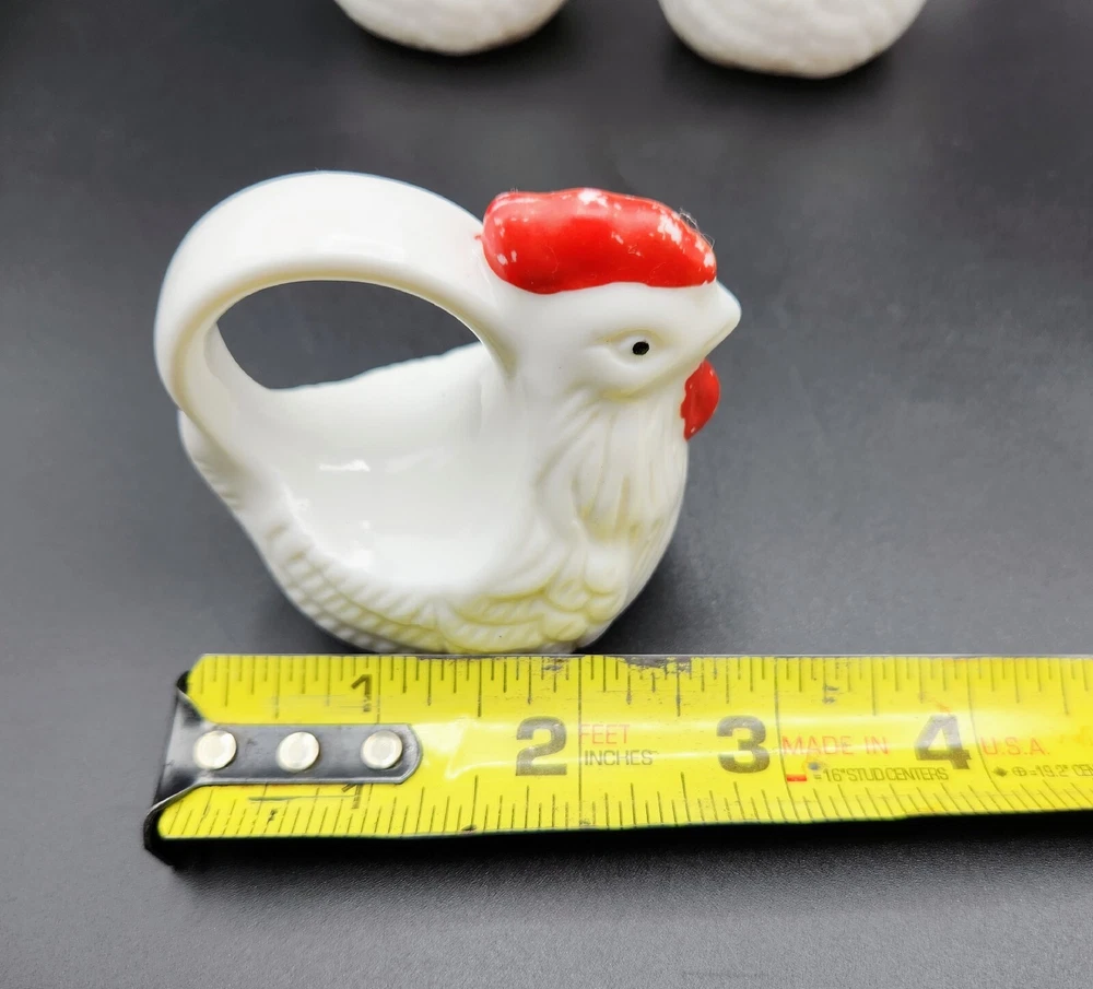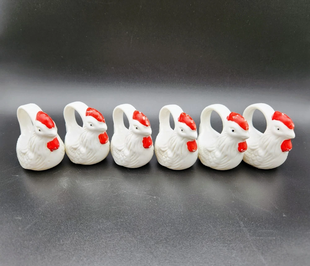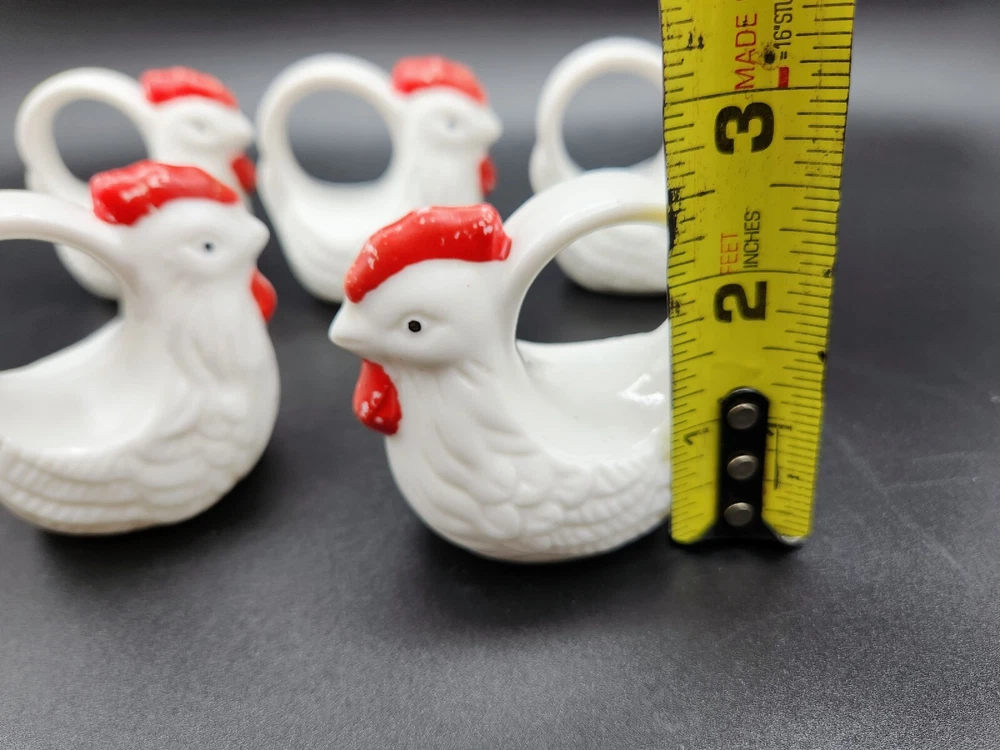 Vintage Ceramic Rosenthal-Netter Rooster Chicken Napkin Ring Holders Set of 6. No chips or cracks but they do have paint loss of each one. The paint loss adds to the character of these napkin holders. My mom used them as decor, she had them zip-tied together in a circle staged with the Rosenthal Netters Rooster Chicken Pitcher, so cute. But this listing is only for the napkin holders, doesn't include the pitcher. Shipped with USPS Economy Mail. Measurements: 2 3/4" Width 1 3/4" Depth 2 1/2" Height I only ship within the United States. As soon as payment has been received by eBay, then I will ship the item out. Thank you!