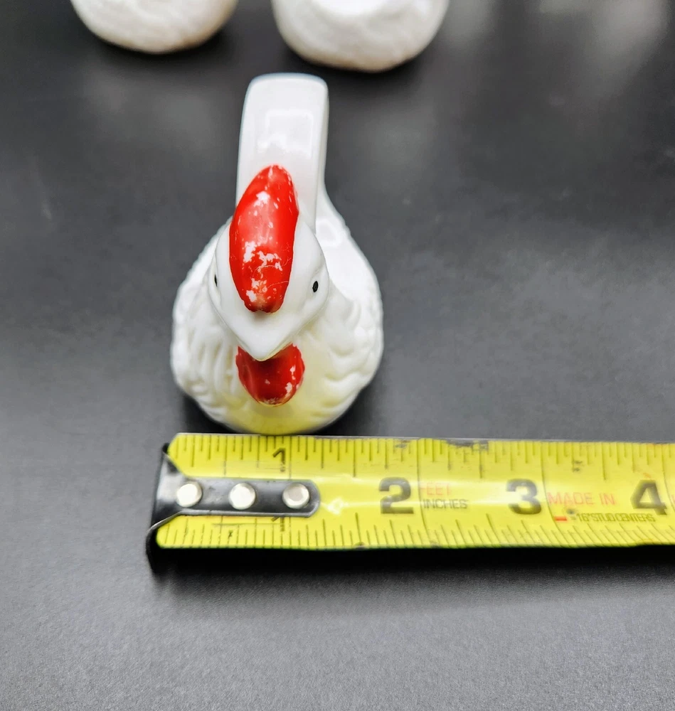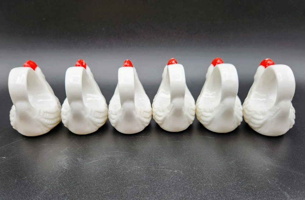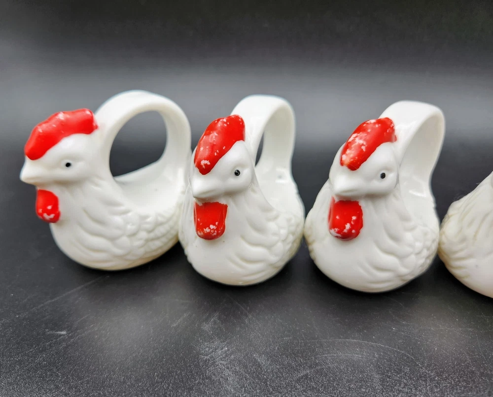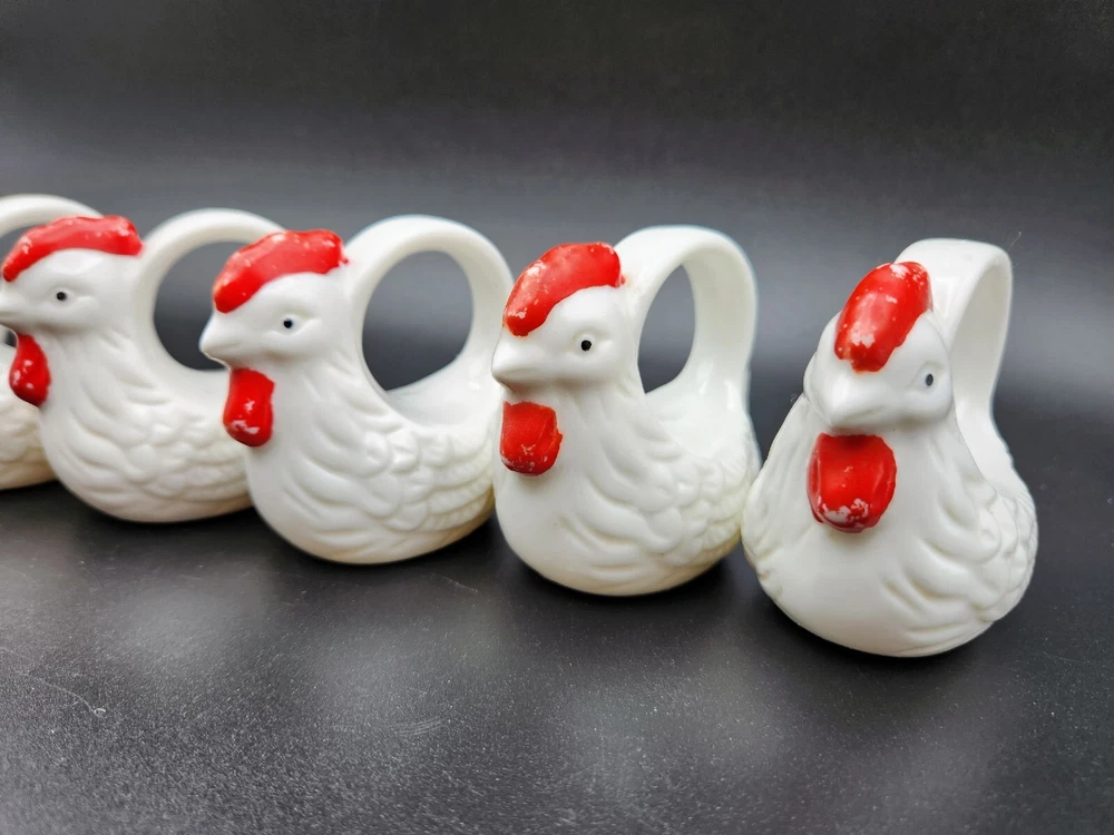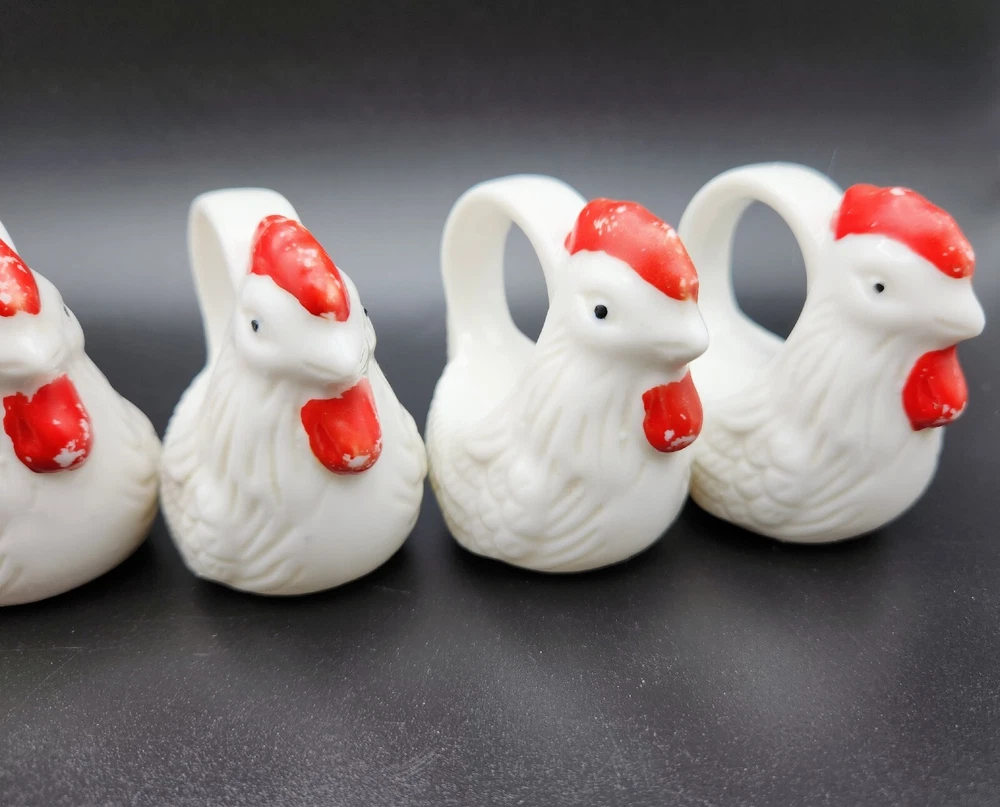 Vintage Ceramic Rosenthal-Netter Rooster Chicken Napkin Ring Holders Set of 6. No chips or cracks but they do have paint loss of each one. The paint loss adds to the character of these napkin holders. My mom used them as decor, she had them zip-tied together in a circle staged with the Rosenthal Netters Rooster Chicken Pitcher, so cute. But this listing is only for the napkin holders, doesn't include the pitcher. Shipped with USPS Economy Mail. Measurements: 2 3/4" Width 1 3/4" Depth 2 1/2" Height I only ship within the United States. As soon as payment has been received by eBay, then I will ship the item out. Thank you!