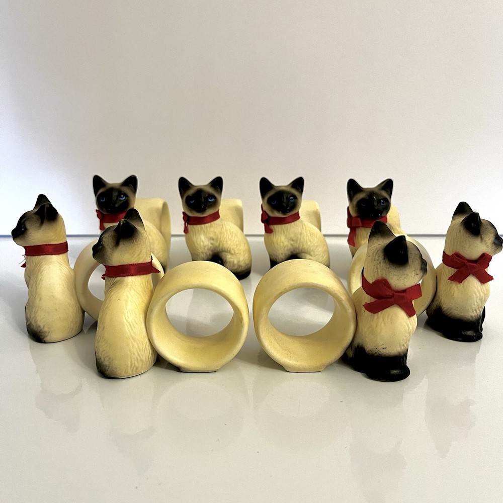 Vintage Set of 8 Siamese cat napkin rings Material - Ceramic/ Porcelain Made in Korea Measurement - H - 2.5" L 2.5" W 1" Black and White cats with red bow and blue eyes Very good condition for vintage product. No chips, cracks or damage. Minor ware and dirt