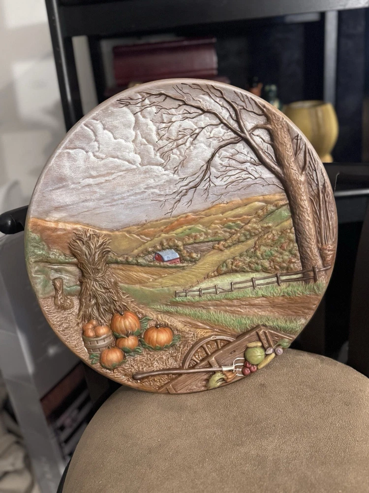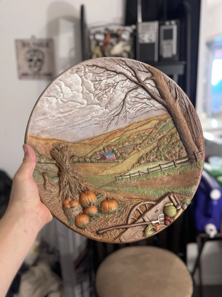 This beautiful fall festive plaque would make a great decor piece for your living room, dining room, or kitchen! Hand pained and signed from the late 1900’s. Large Ceramic Wall Hanging Fall Art Decor Farm Scene Hand Painted & Signed