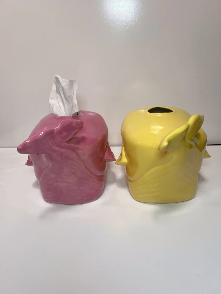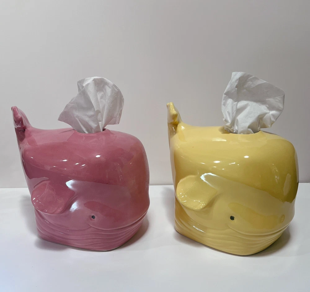 Whale whale whale… LOOK WHAT WE HAVE HERE! I have TWO vintage ceramic whale tissue box covers!Florida found!🧡🐳🐳🩷 Price includes BOTH whales. ✨ 9” long from head to tail || 7.5” tall || 7” wide 🌞 15+ years established antiques/vintage selling and shipping/handling fragiles. Overall in fantastic condition! *There is a tiny imperfection on the bottom of both whales.* Yellow whale has a hair line crack at the bottom on his booty. Pink whale has a chip on the inner bottom, in an area where it won’t be seen. ALL SALES FINAL. Thanks for looking!✨
