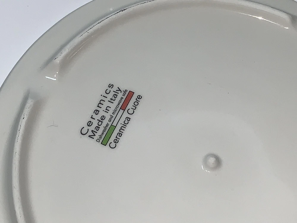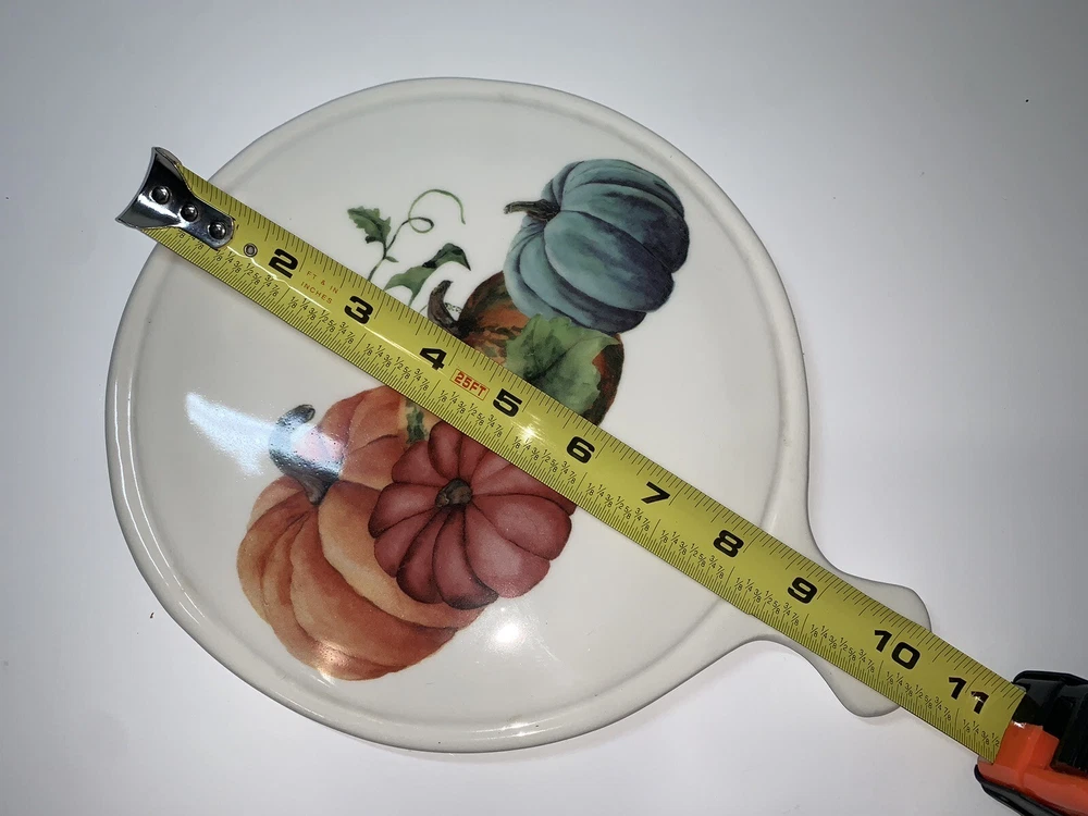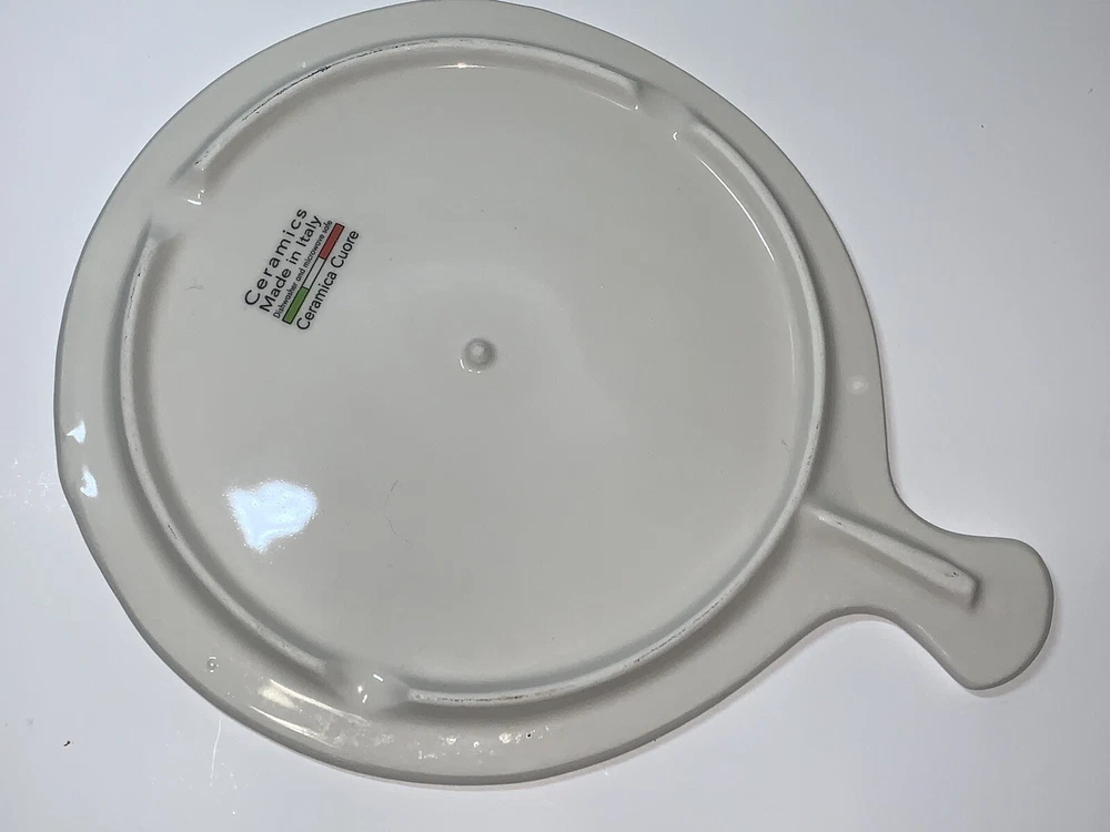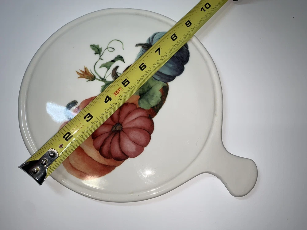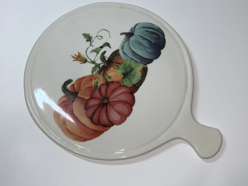 This vintage ceramic cheese plate by Ceramica Cuore is perfect for your Thanksgiving celebration. With a beautiful pumpkin pattern and a glossy finish, it adds a decorative touch to your farmhouse style. Made in Italy using pottery production technique, this cheese plate has a diameter of 8.5 inches and a height of 10 inches. The set includes a cutting board and trivet, and it is in excellent condition. This cheese plate is a contemporary original and is perfect for serving cheese and crackers to your guests. Celebrate the holiday season with this beautiful piece of decor. **See photos! Great condition with a little wear on the feet but not too noticeable.