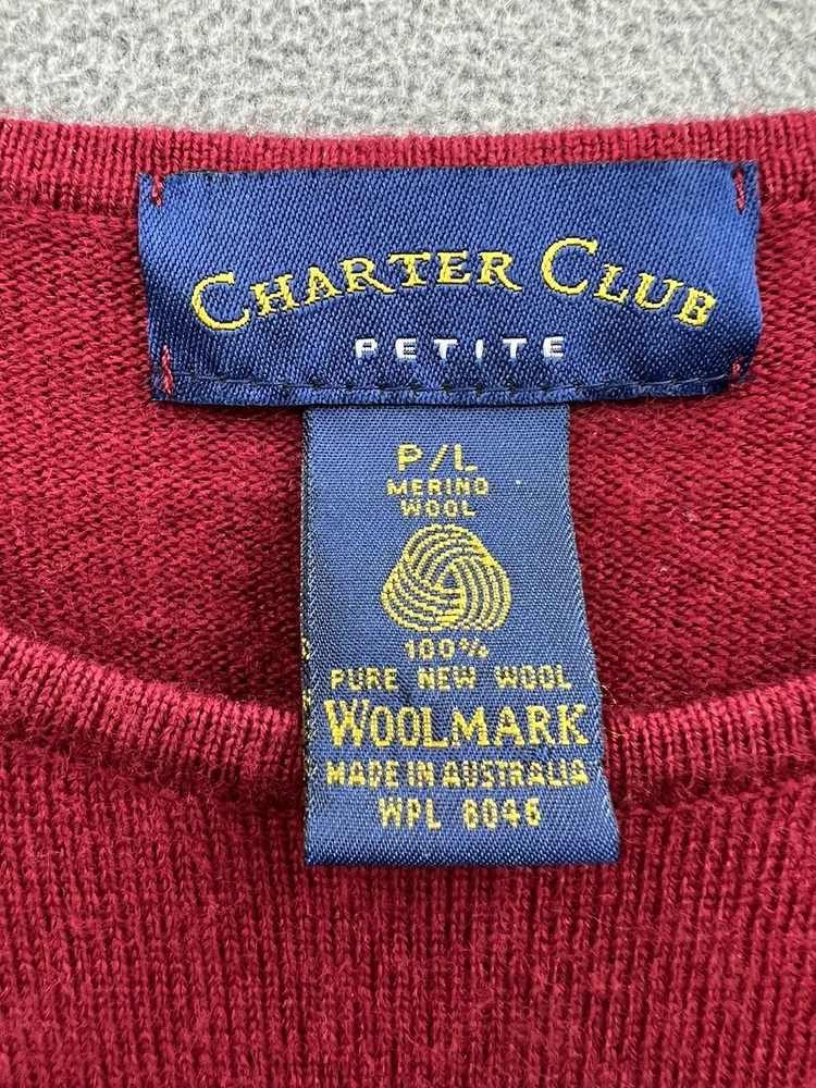 This Vintage Charter Club Woolmark Women’s Petite Large Red Sweater is made of 100% wool and features a solid pattern with a tight-knit style. The long-sleeved pullover has a classic fit, a crew neck, and is suitable for various occasions such as travel, casual outings, workwear, and business. The woolen material makes it a great choice for the winter, fall, and spring seasons. This sweater comes in size PL, is branded by Charter Club, and is meant for women who prefer the petite size type.