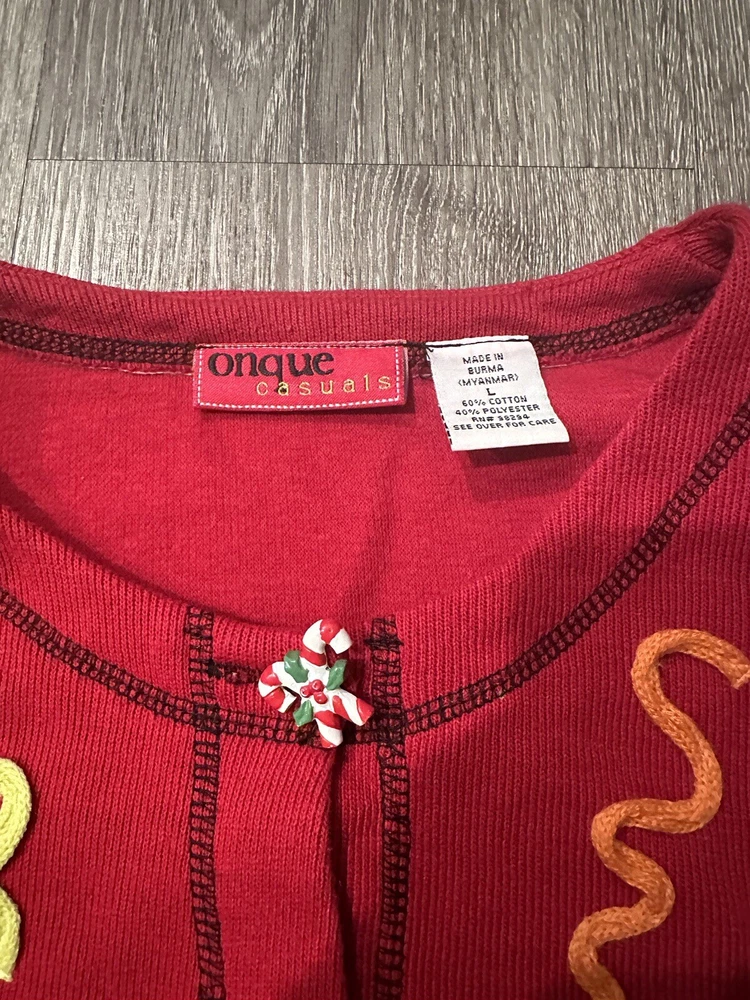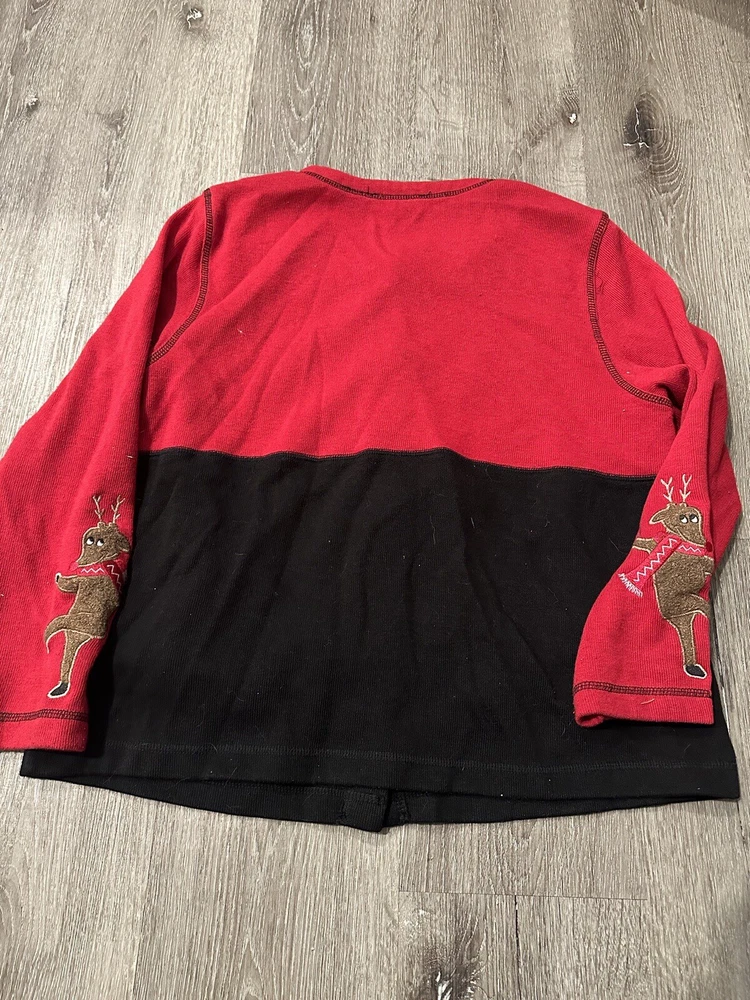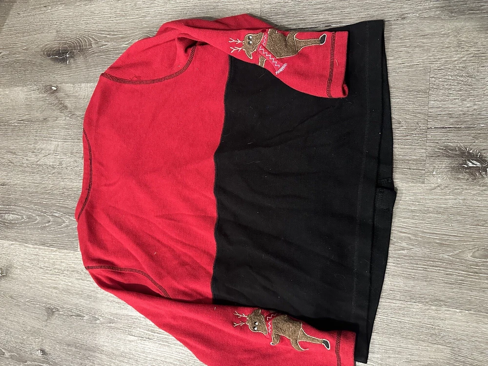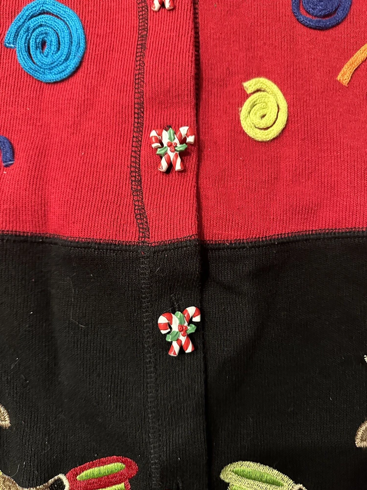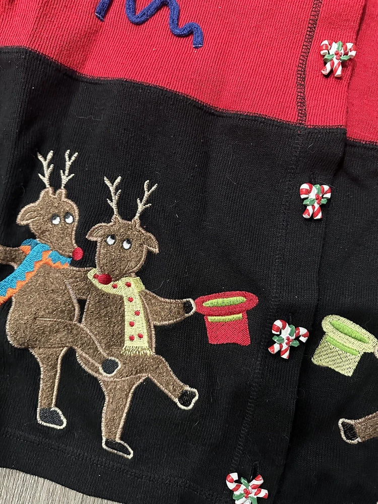 Immerse yourself in the festive spirit with this Vintage Christmas Cardigan, a cozy addition to your holiday wardrobe. Adorned with dancing reindeers and candy cane buttons, it captures the joy and merriment of the season. Crafted for those who appreciate retro style, this piece is a delightful nod to classic Christmas past. The cardigan is a size large, offering ample comfort and a relaxed fit, perfect for holiday gatherings or casual outings. Its charming design and warm appeal make it a timeless piece for your collection, ensuring you stay cozy and stylish throughout the holiday season.