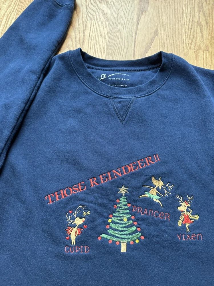 Vintage Christmas Reindeer Sweatshirt in a Women’s Size Medium This pullover sweatshirt is a perfect example of Y2K GrannyCore. It is in excellent condition with very high-quality embroidery of each reindeer and its name. Has double sided graphics so you can see them coming and going. The sweatshirt is very soft and has been washed so it will arrive at your home fresh and clean. Ships from the Midwest.