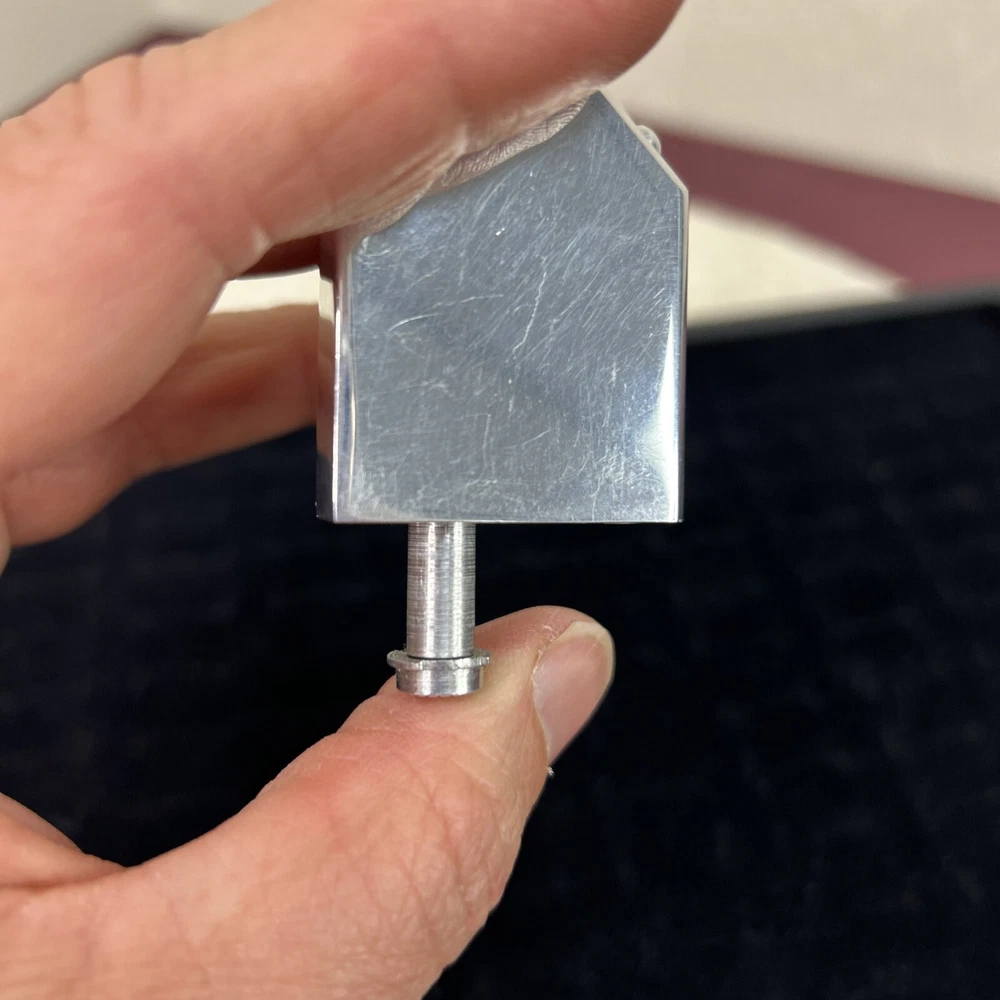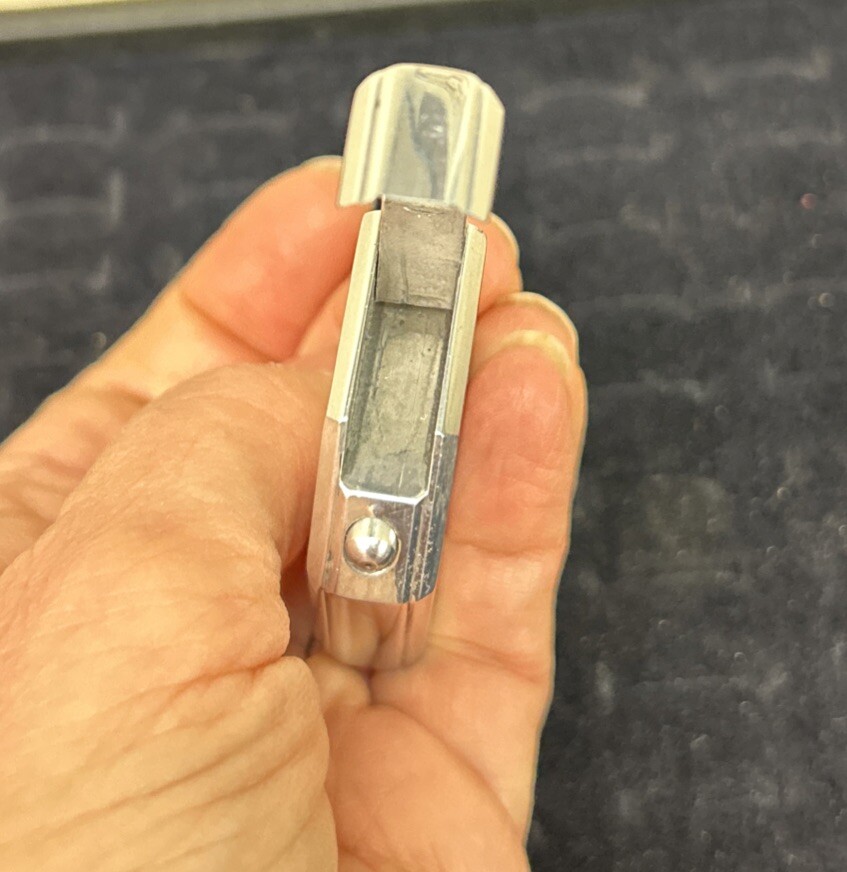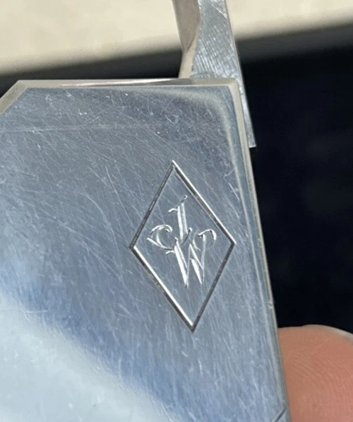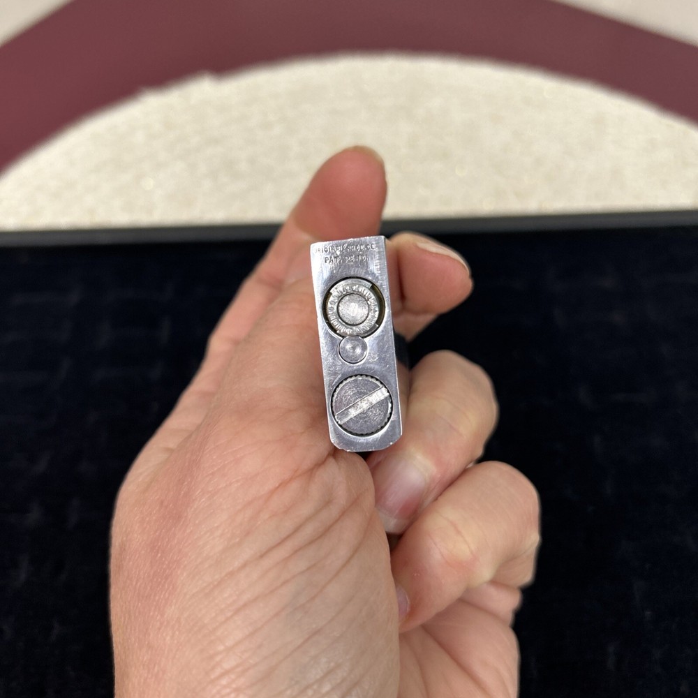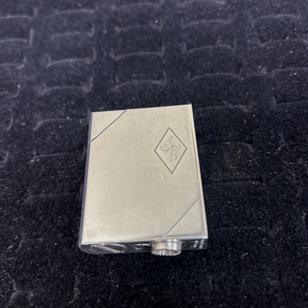 This is a very unique perfume atomizer. It is chrome and can be passed off as a lighter. The bottom pump comes out from the base and it’s easily tucked back inside and twisted slightly to hold in place . There is a screw on the bottom where you open it and fill from there just like you would a lighter . It is monogrammed with a JW. It measures 1.75 inches long by 1.35 inches wide. Surface scratches but otherwise in great condition.