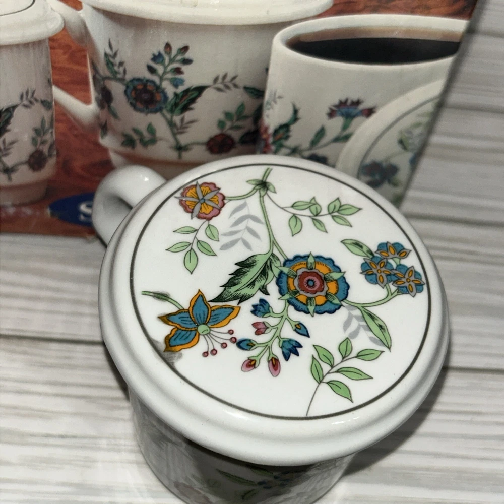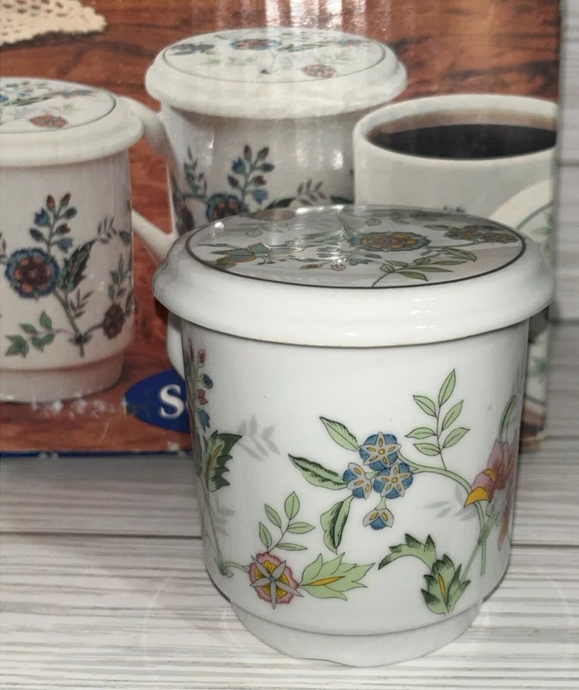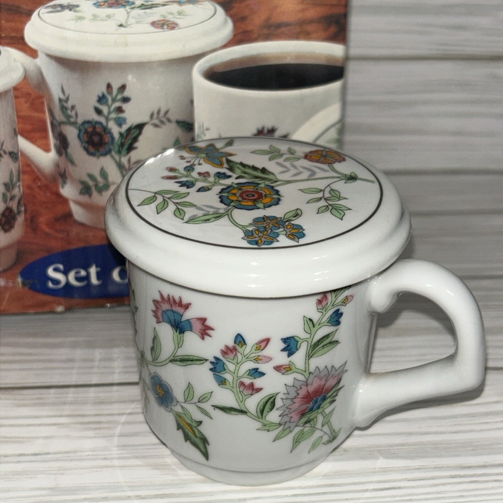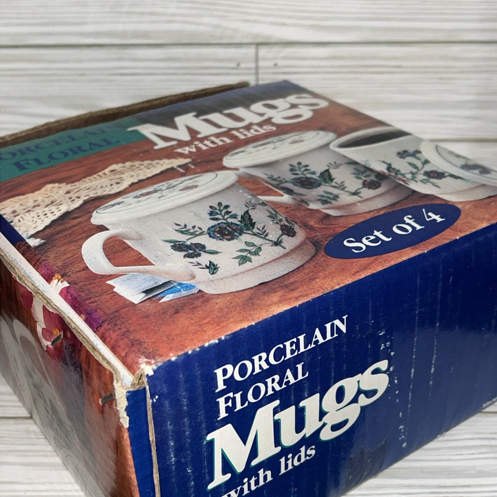 Vintage Circa 1998 NIB NOS Tea Mugs Cups With Lids Floral Porcelain Set Of 4 These Are New The Box Has Some paper missing and some damage but cups are all in new condition have never been used made in Georgia USA Very Cute Set