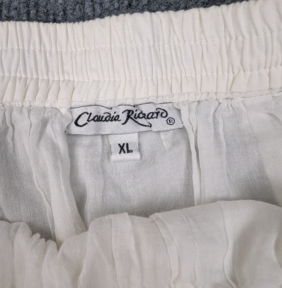 Brand: Claudia Richard Type: Skirt Department: Women Size: XL Color: White Material: 100% Cotton Style: Tiered Maxi Skirt Features: Elastic Waist, Drawstring, Embroidered Panels, Ruffled Hem Pattern: Solid with Embroidery Made In: India Care Instructions: See care label Occasion: Casual, Boho, Resort Condition: Pre-owned