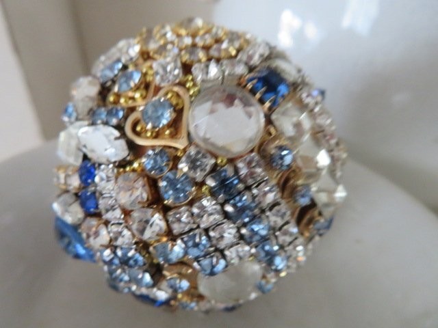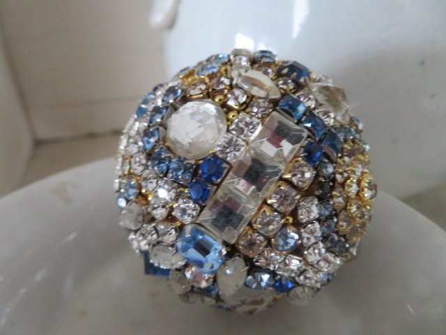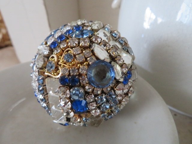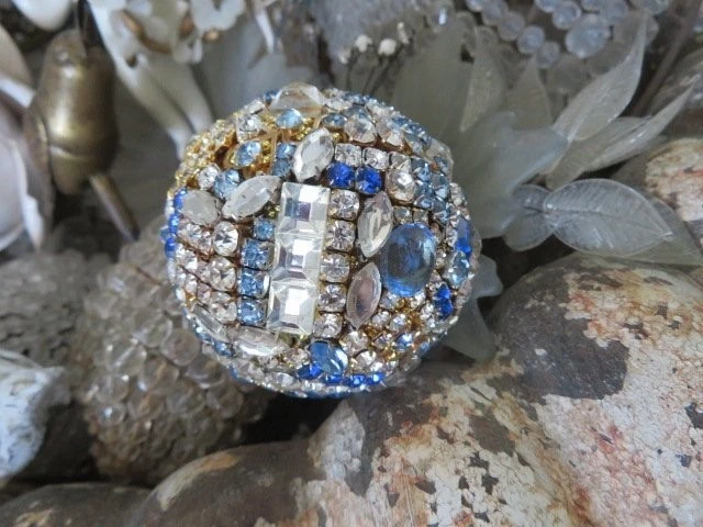 Breathtaking Rhinestone Decorative BALL Clear & BLUE Vintage RHINESTONES JEWELRY PLEASE SCROLL ALL THE WAY DOWN TO SEE ALL THE PHOTOS. THIS IS AN EXQUISITE JEWELED DECORATIVE BALL THAT IS MADE WITH VINTAGE RHINESTONES AND JEWELRY THAT IS A ONE OF A KIND. This is very well made and with a unique and stunning design. It was made using salvaged vintage jewelry, rhinestones in blues and clear. Measurements are about 2 1/4" THIS IS FOR THE RHINESTONE BALL ONLY. Buyer to pay shipping and insurance of $10.00 to the lower 48 states. Hawaii, and Alaska may email for a shipping quote and to see if it can be shipped to you. Local pick up is available. BE SURE TO CHECK BACK ON SHABBYTOWNUSA AUCTIONS OFTEN! See my other listings for more great items! Buyer to pay shipping and insurance. txzj pxzj1036 txzj-12
