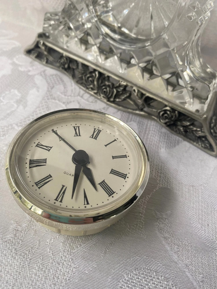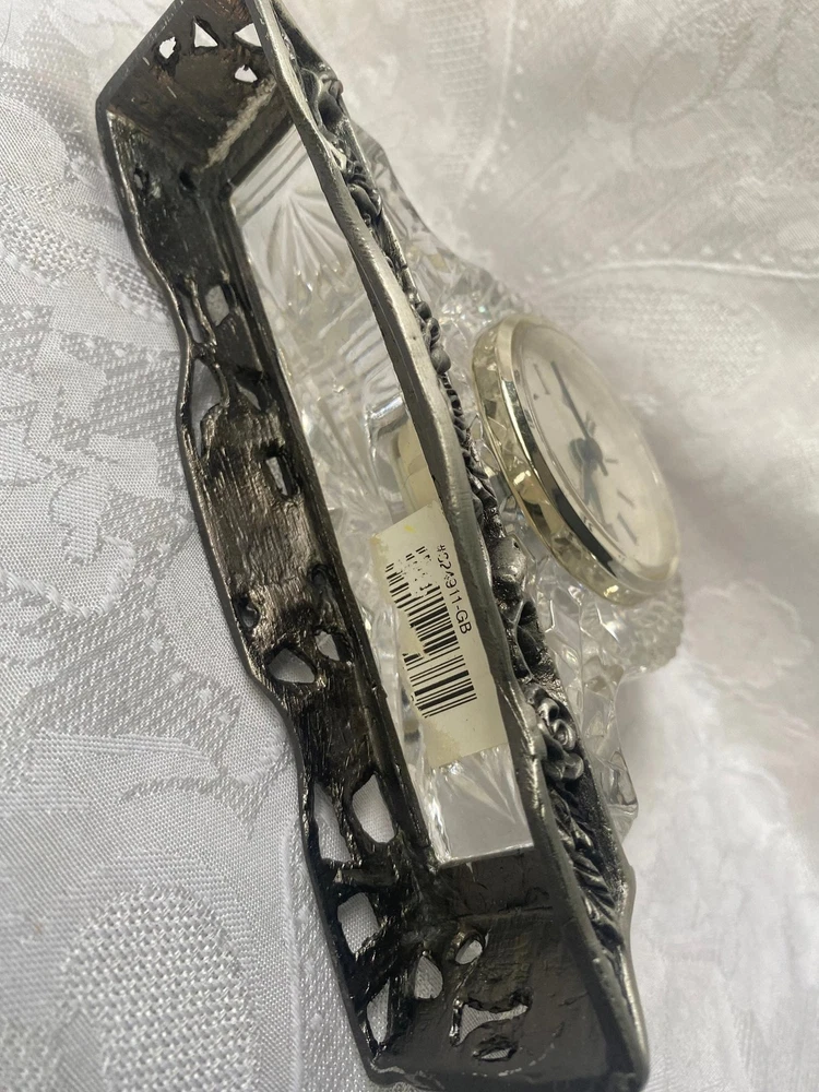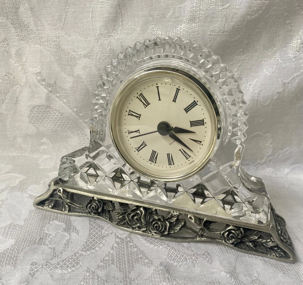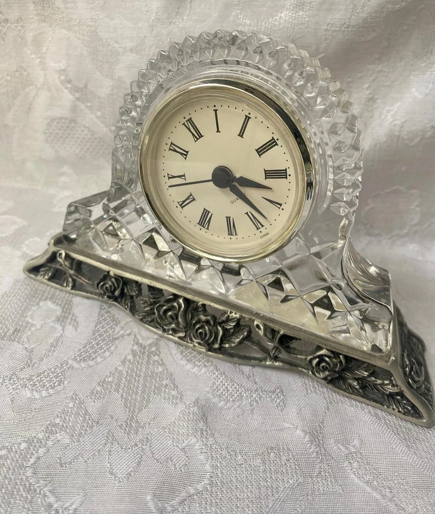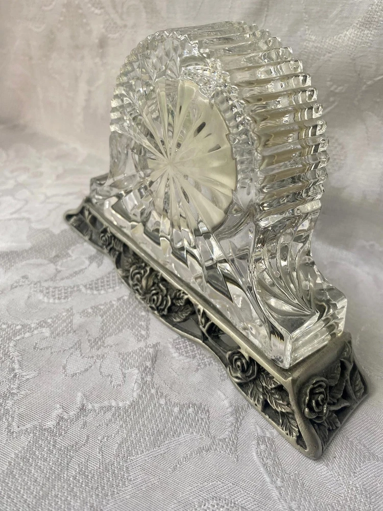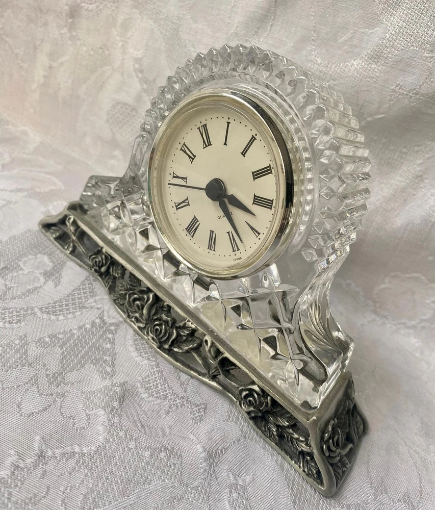 Vintage Clear Cut Glass Mantle Clock with Iron Rose Accents 7x5 Not tested- middle pops out easily for batteries Item is preloved and may have minimal signs of wear- please inspect all photos before purchasing