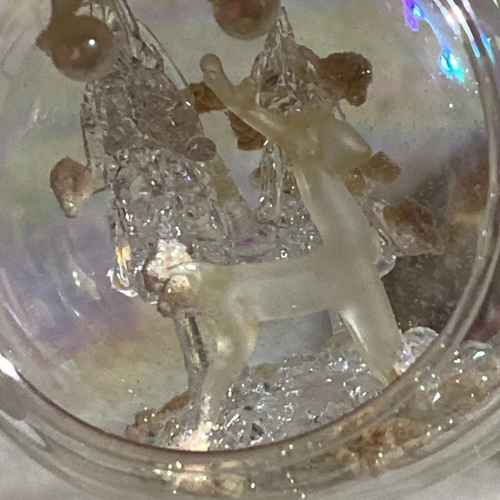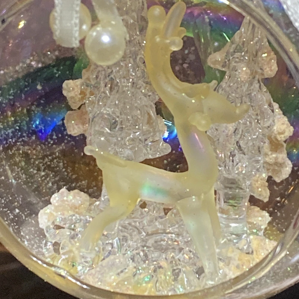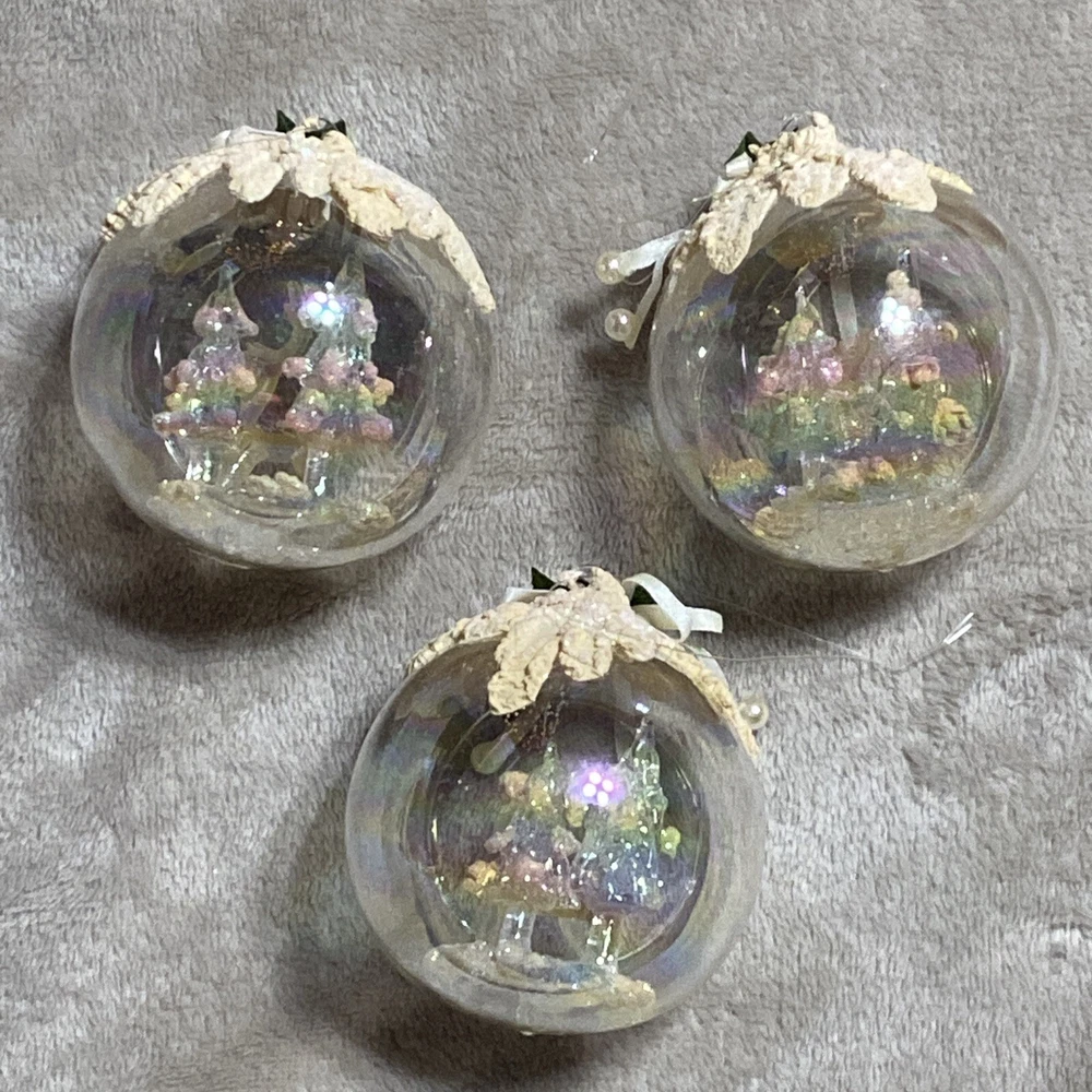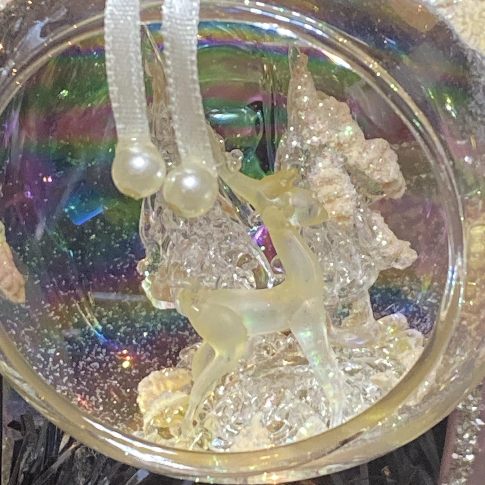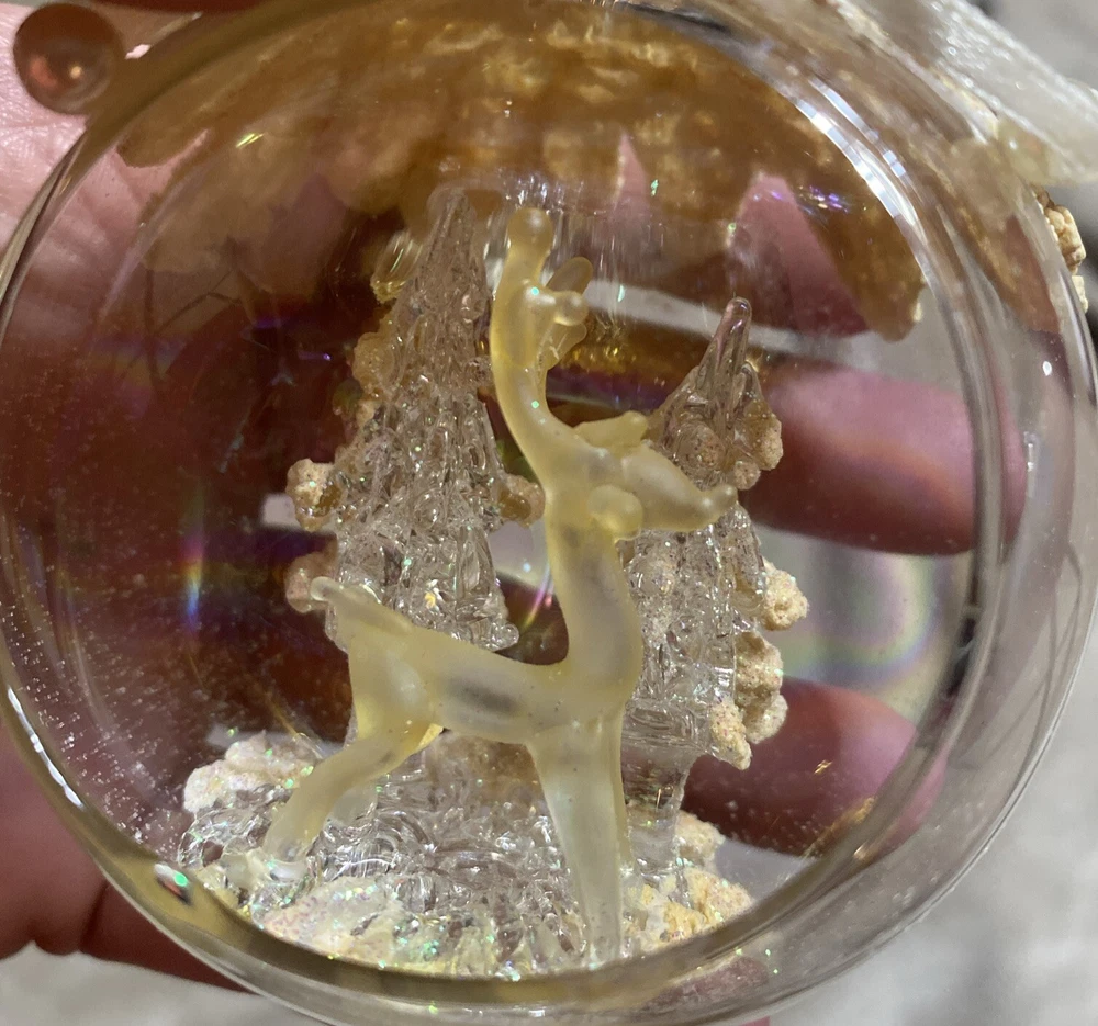 Beautiful blown glass diorama ornaments! The glass throws a rainbow of pastels onto the diorama inside making the trees look colorful. Each ornament has 2 trees and an iridescent deer inside on a decorated “ground”. The tops are also decorated with ribbons and sparkle. One top has a Pearl that fell off but it is still in the box. They all have a box for storage. They are quite magical!