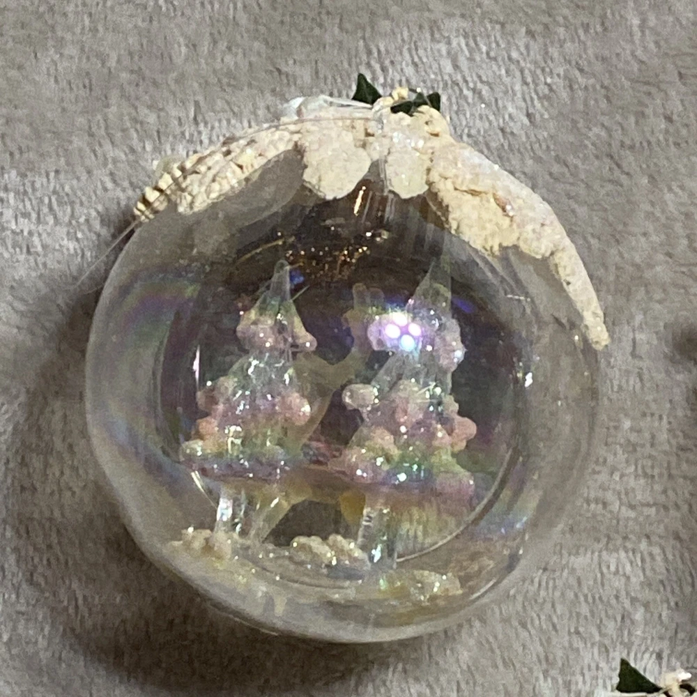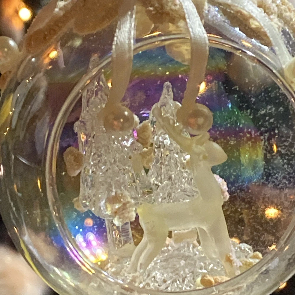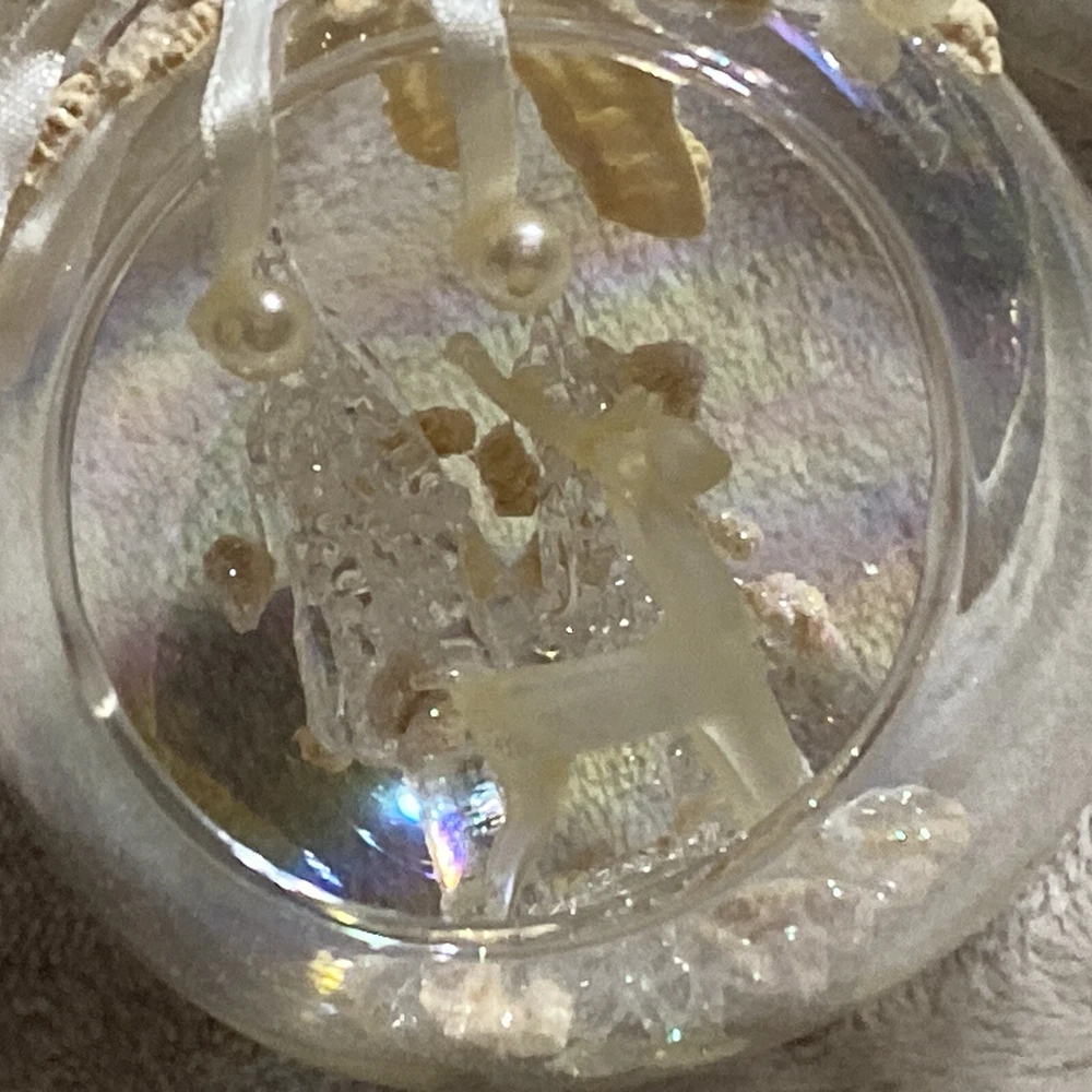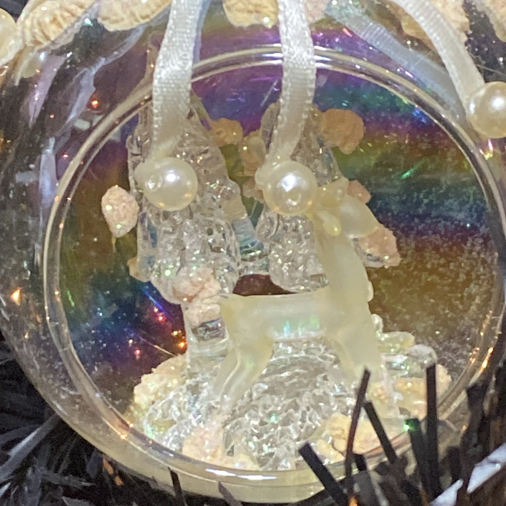 Beautiful blown glass diorama ornaments! The glass throws a rainbow of pastels onto the diorama inside making the trees look colorful. Each ornament has 2 trees and an iridescent deer inside on a decorated “ground”. The tops are also decorated with ribbons and sparkle. One top has a Pearl that fell off but it is still in the box. They all have a box for storage. They are quite magical!