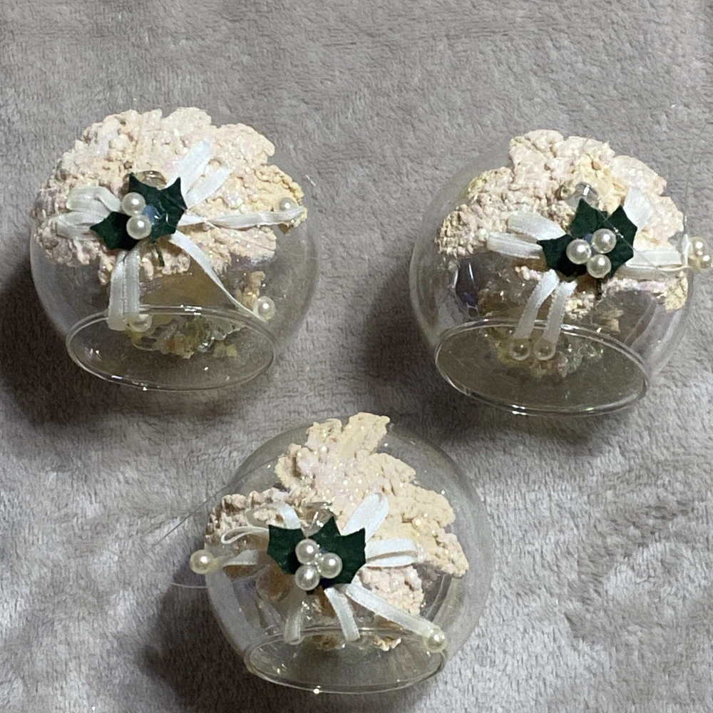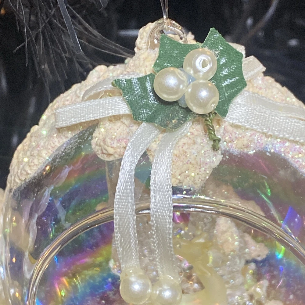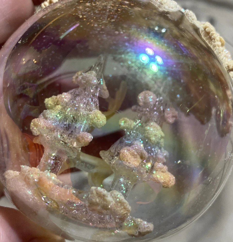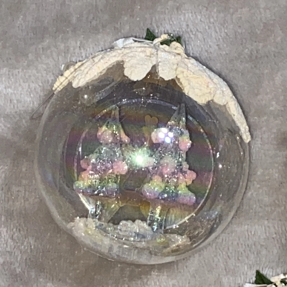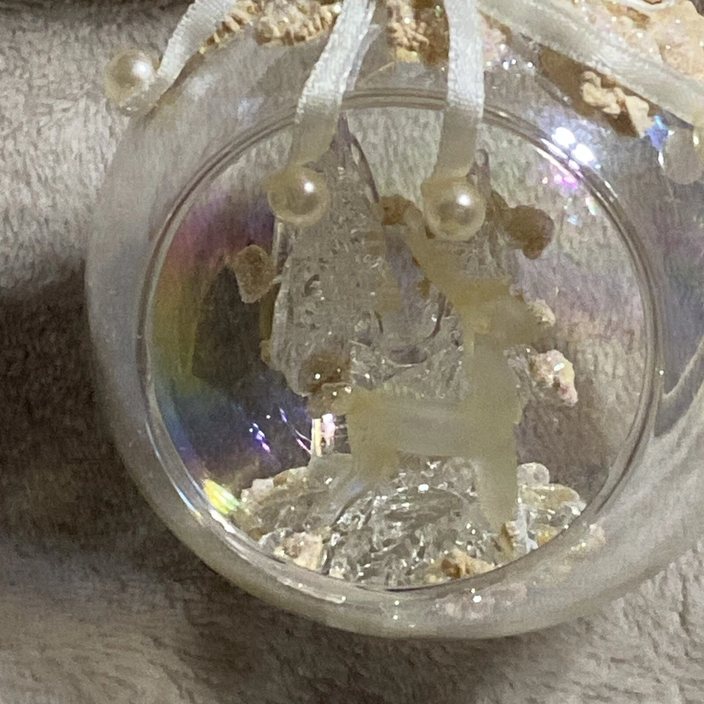 Beautiful blown glass diorama ornaments! The glass throws a rainbow of pastels onto the diorama inside making the trees look colorful. Each ornament has 2 trees and an iridescent deer inside on a decorated “ground”. The tops are also decorated with ribbons and sparkle. One top has a Pearl that fell off but it is still in the box. They all have a box for storage. They are quite magical!