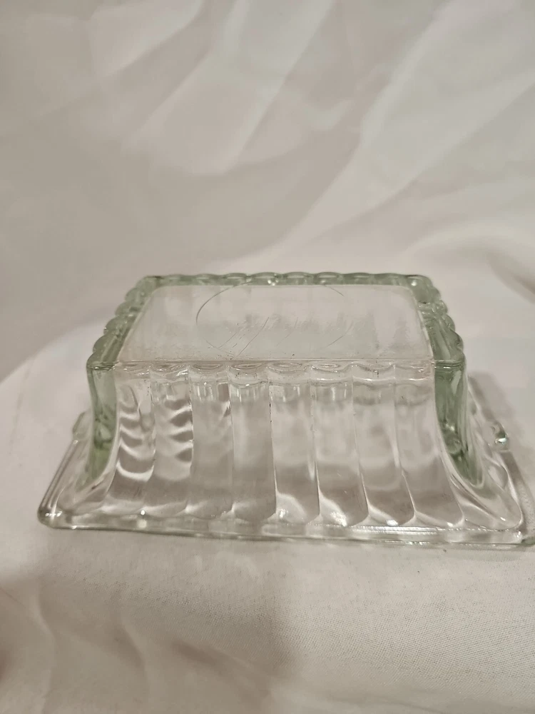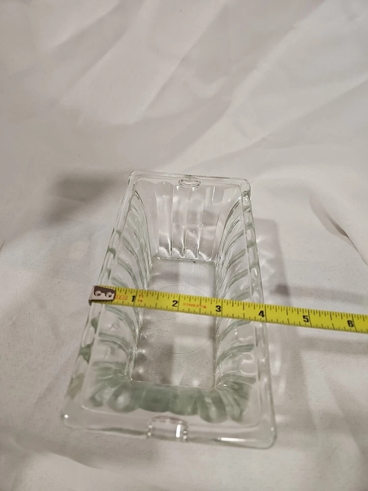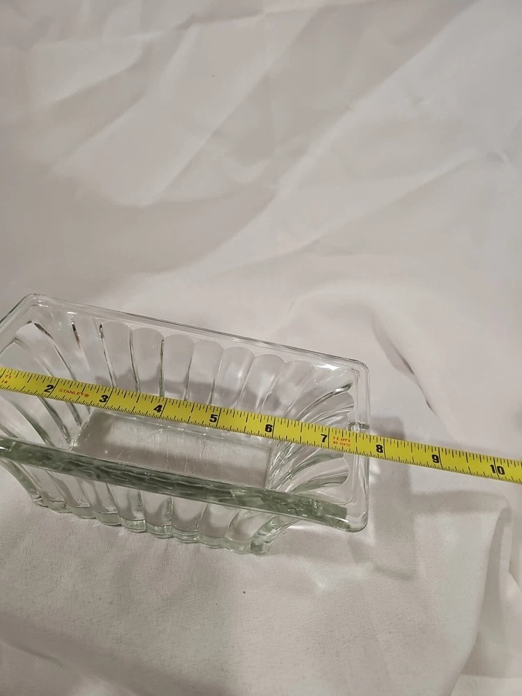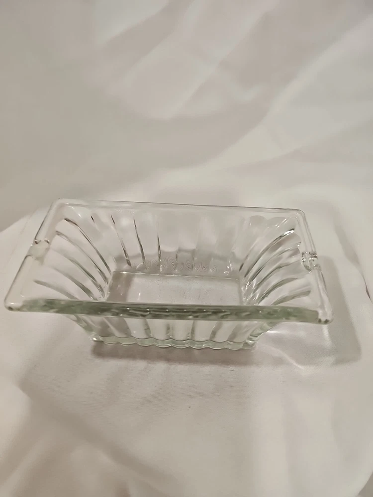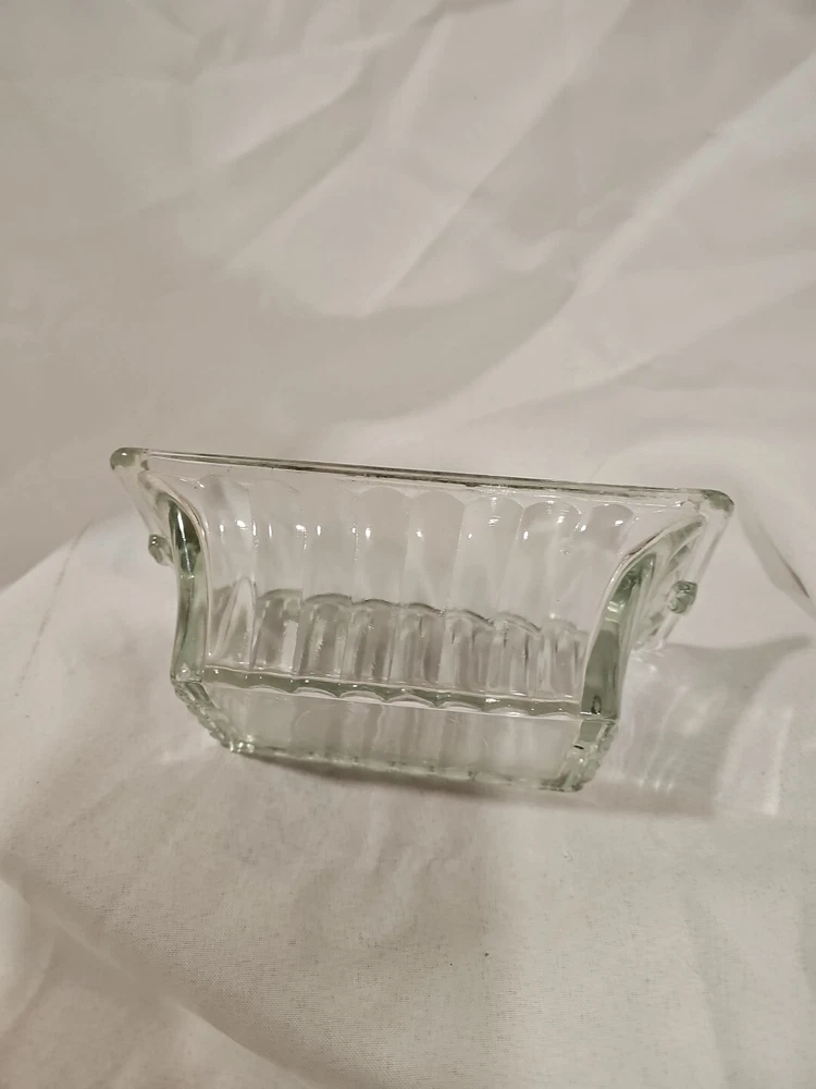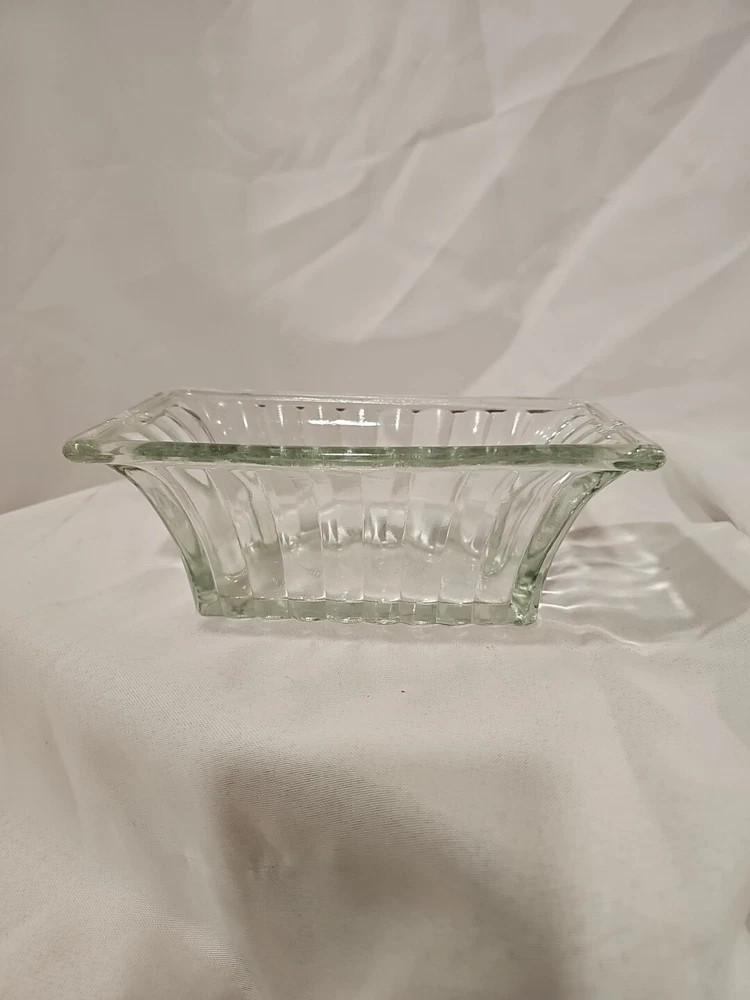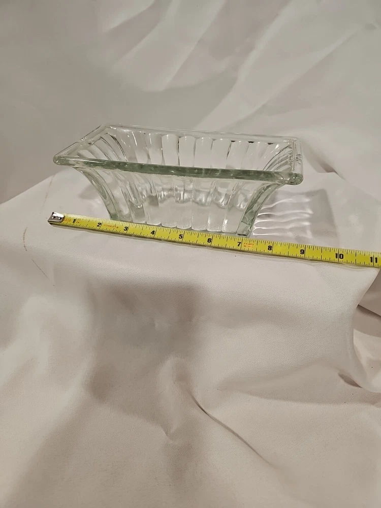 This is a vintage clear ribbed glass rectangular relish dish that can also function as a planter. It is unmarked, made of crystal, and weighs 2 lbs. This antique dish features a single compartment and has a timeless design perfect for serving or displaying small items.