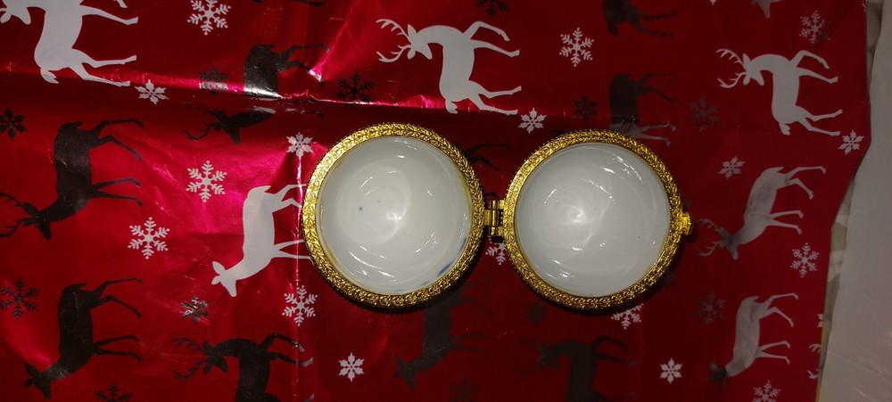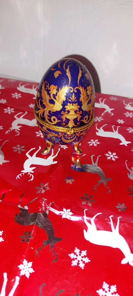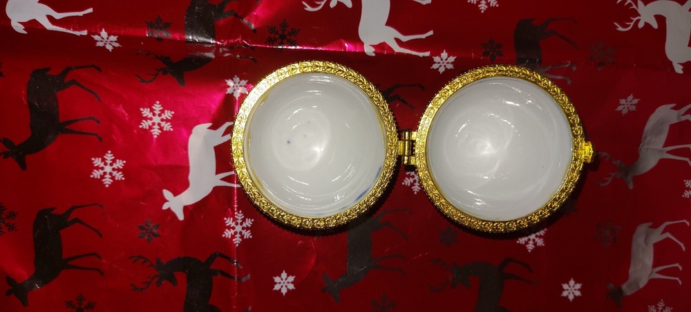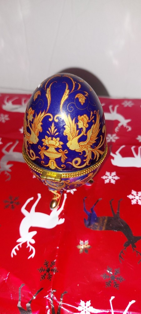This vintage Victorian-style trinket box is crafted from cobalt blue glazed porcelain in an oval shape, measuring 5.25 inches in length. Adorned with a delicate floral pattern, the hinged box features a white interior with a hook & loop closure. Suitable for decor or as a keepsake, this small box is perfect for teens and adults who appreciate art-themed collectibles. Easy to care for by cleaning with a damp cloth, this unique piece adds a touch of elegance to any room.