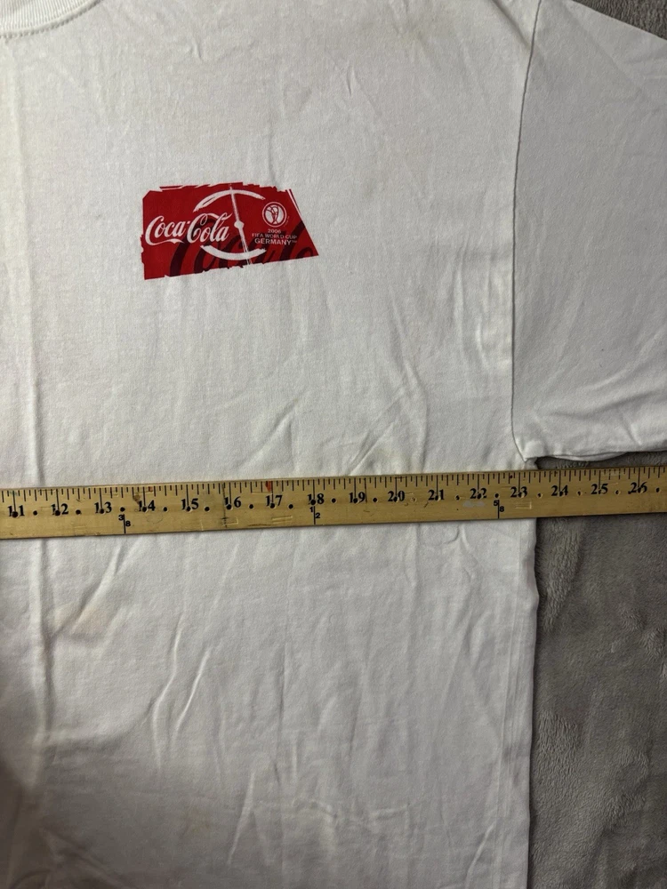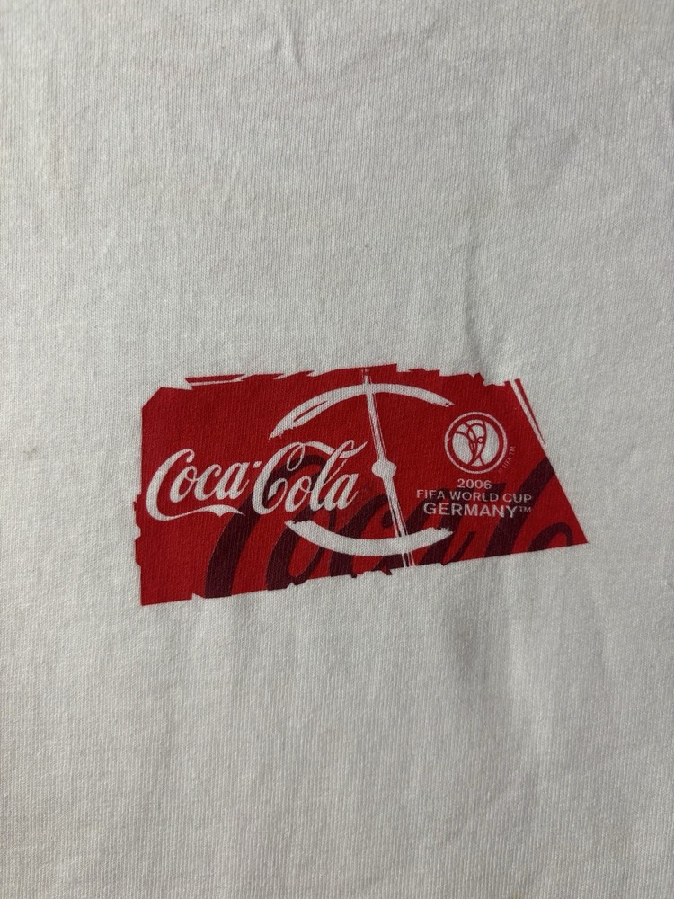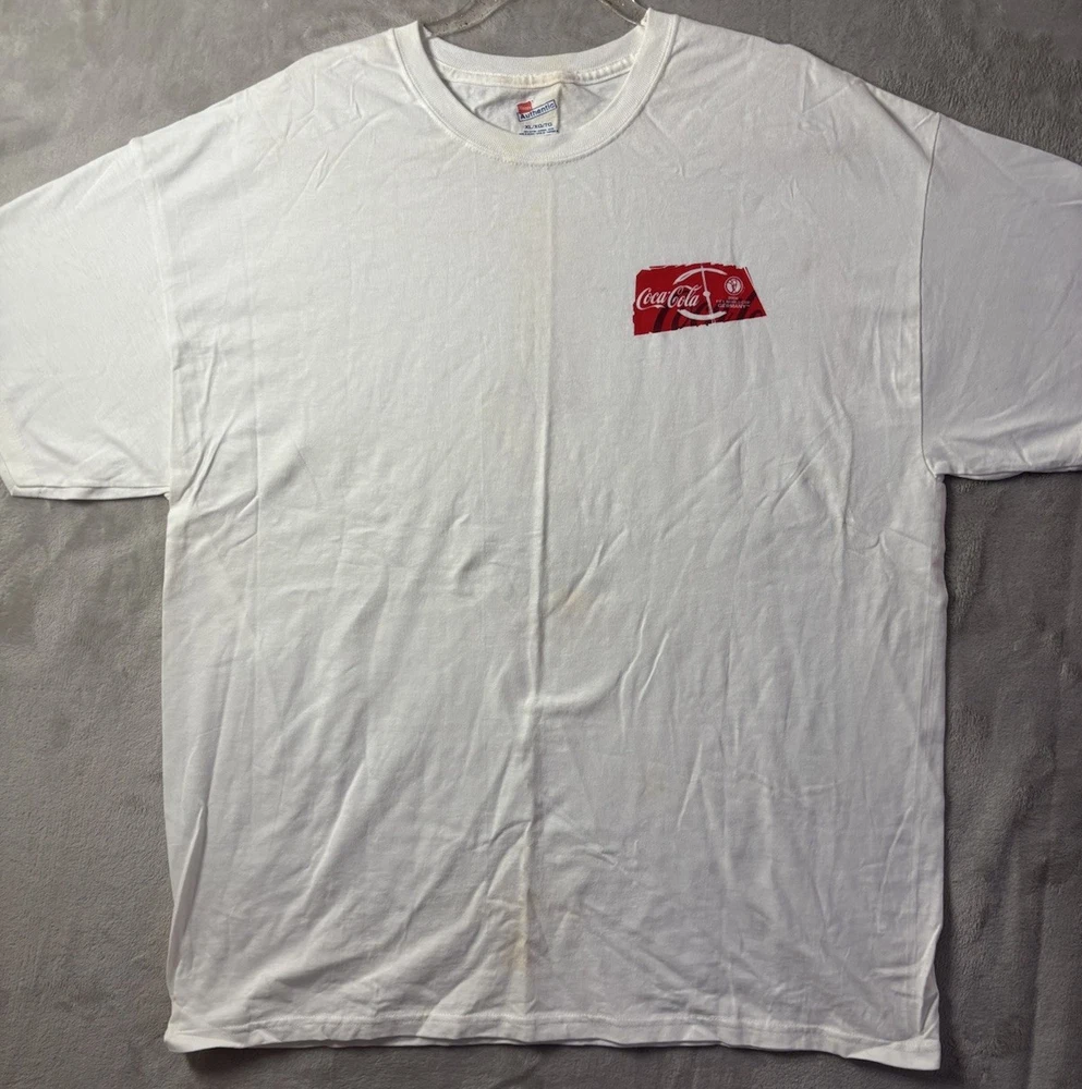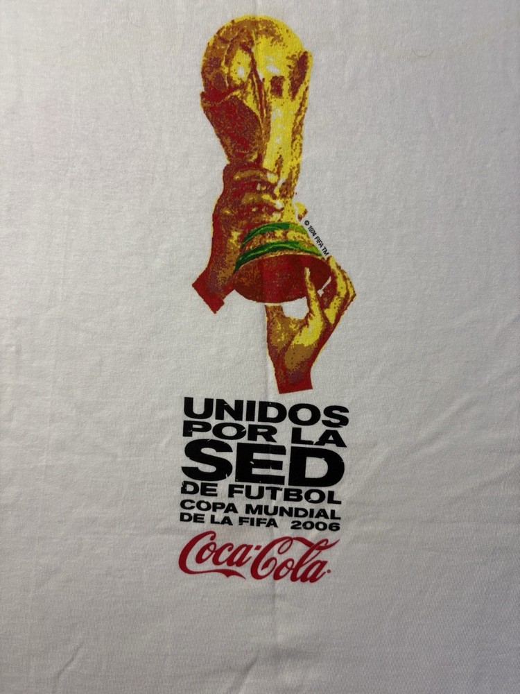 Vintage Coca-Cola FIFA World Cup 2006 Men’s XL Hanes Soccer Futbol T-Shirt This vintage promotional T-shirt was released for the 2006 FIFA World Cup in Germany and sponsored by Coca-Cola. The front features the iconic World Cup trophy graphic with Spanish text reading “Unidos Por La Sed De Futbol,” while the back includes Coca-Cola branding alongside the official 2006 World Cup Germany logo. A standout early-2000s sports promo piece that blends global soccer culture with classic advertising memorabilia. Features • 100% cotton Hanes “Authentic” tag blank • Double-sided screen printed graphics • Official 2006 World Cup promotional design • Classic early-2000s fit and feel • Short sleeve crew neck construction • Men’s size XL Condition Pre-owned vintage condition with light normal wear from age. There is a very faint discoloration near the collar area that is only noticeable upon close inspection and does not stand out when worn. No holes or tears. Please review all photos carefully. Measurements Please see photos for measurements to ensure proper fit. Please Note Color may vary slightly due to lighting and screen settings. Customer Satisfaction We strive to provide accurate descriptions, clear photos, and a smooth buying experience. Feel free to reach out with any questions before purchase. Authenticity Statement We carefully inspect all branded items and only sell genuine merchandise. Shipping Items are shipped promptly and securely packaged to ensure safe delivery. Thanks for checking out our store — be sure to browse for more vintage finds and unique pieces!