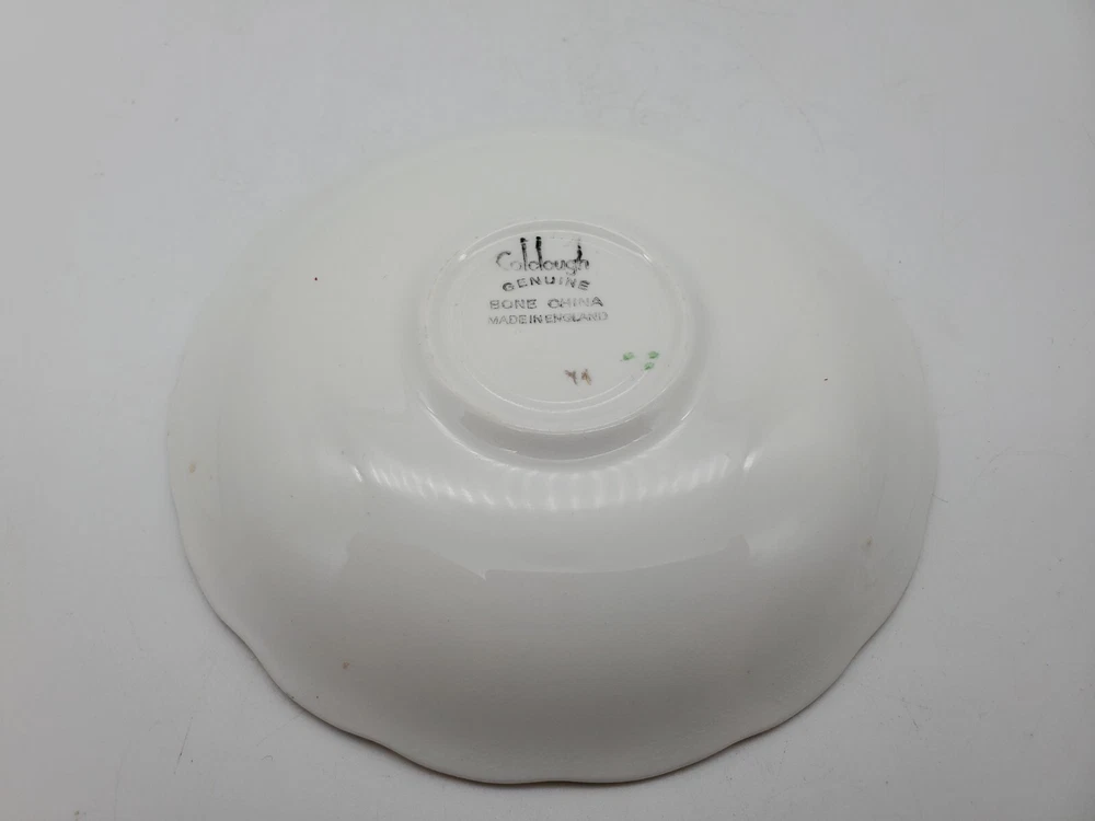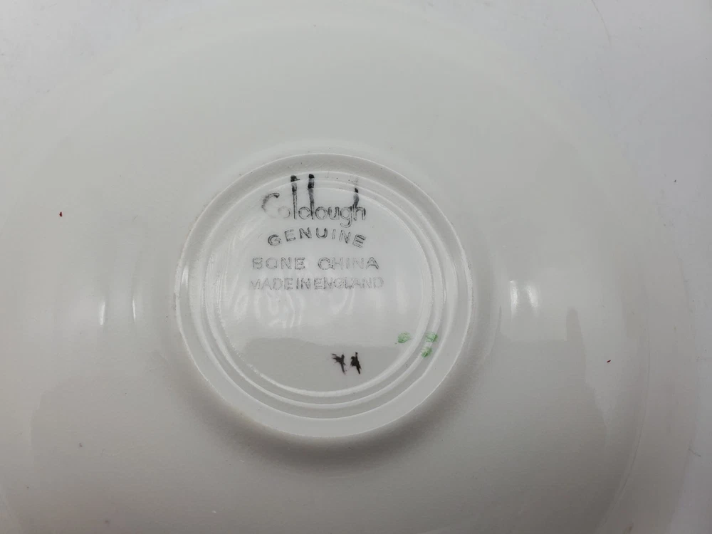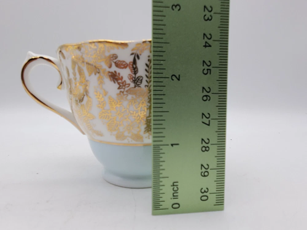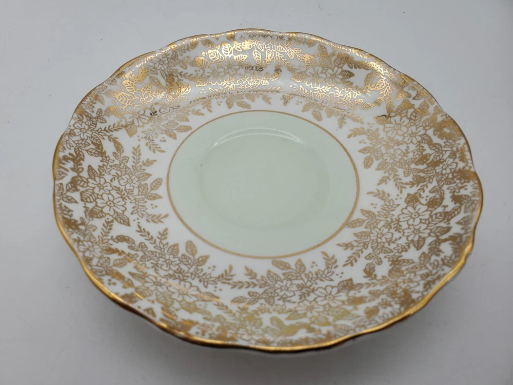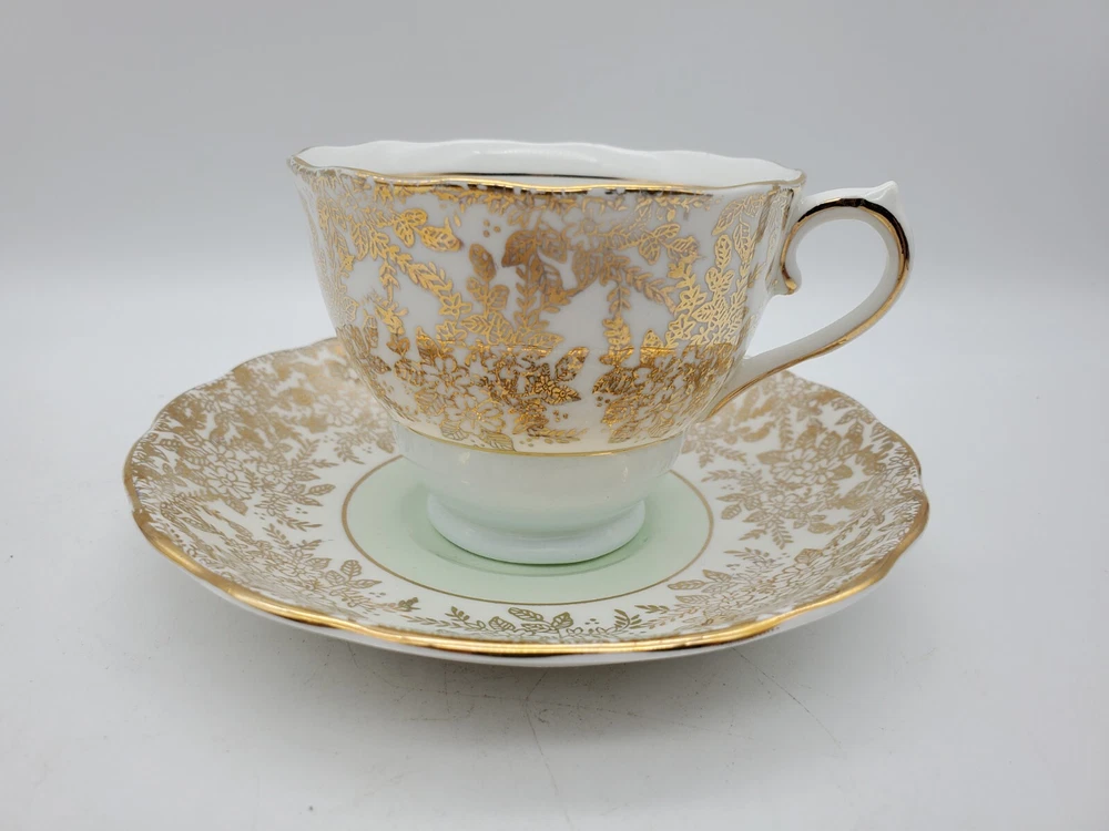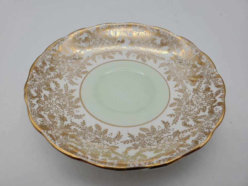 This vintage tea cup and saucer set from Colclough China features a beautiful golden floral pattern that is sure to impress. The set includes a round-shaped tea cup and saucer, both made of high-quality bone china and hand-painted with exquisite details.