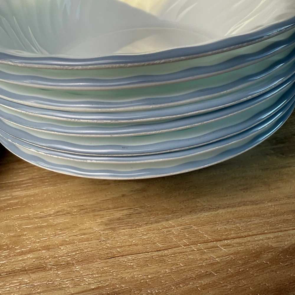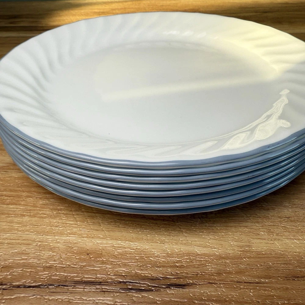 The Vintage Corelle Blue Velvet Rose 8 Cereal Soup Bowls and 8 Plates 16 Pc Set is a charming and classic dinner set for eight. Made of durable glass, these white bowls and plates feature a delicate blue velvet rose design that adds a touch of elegance to your dining table. The Corelle brand ensures that this set is both stylish and reliable for everyday use or special occasions. The timeless beauty of this set makes it a perfect addition to any kitchen or dining room. Some edges are a little rough.