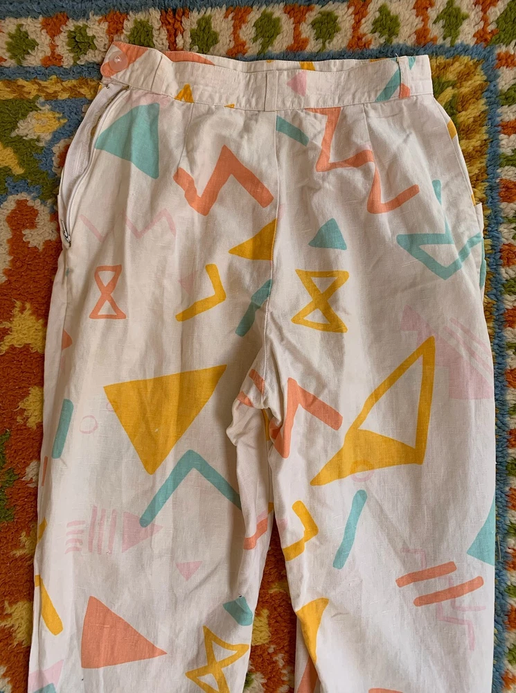 Geometric Pastel Dress Pants with Pockets Roomy comfortable Small waist - 25 - 26 Beige linen cotton Mild discoloration appropriate with age