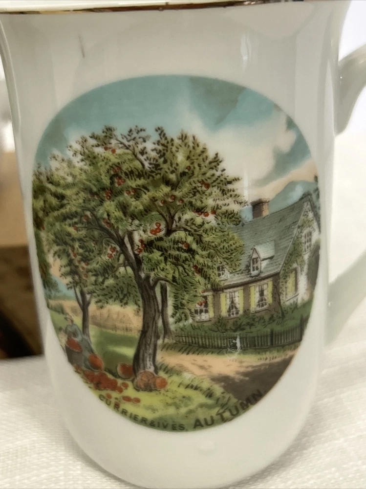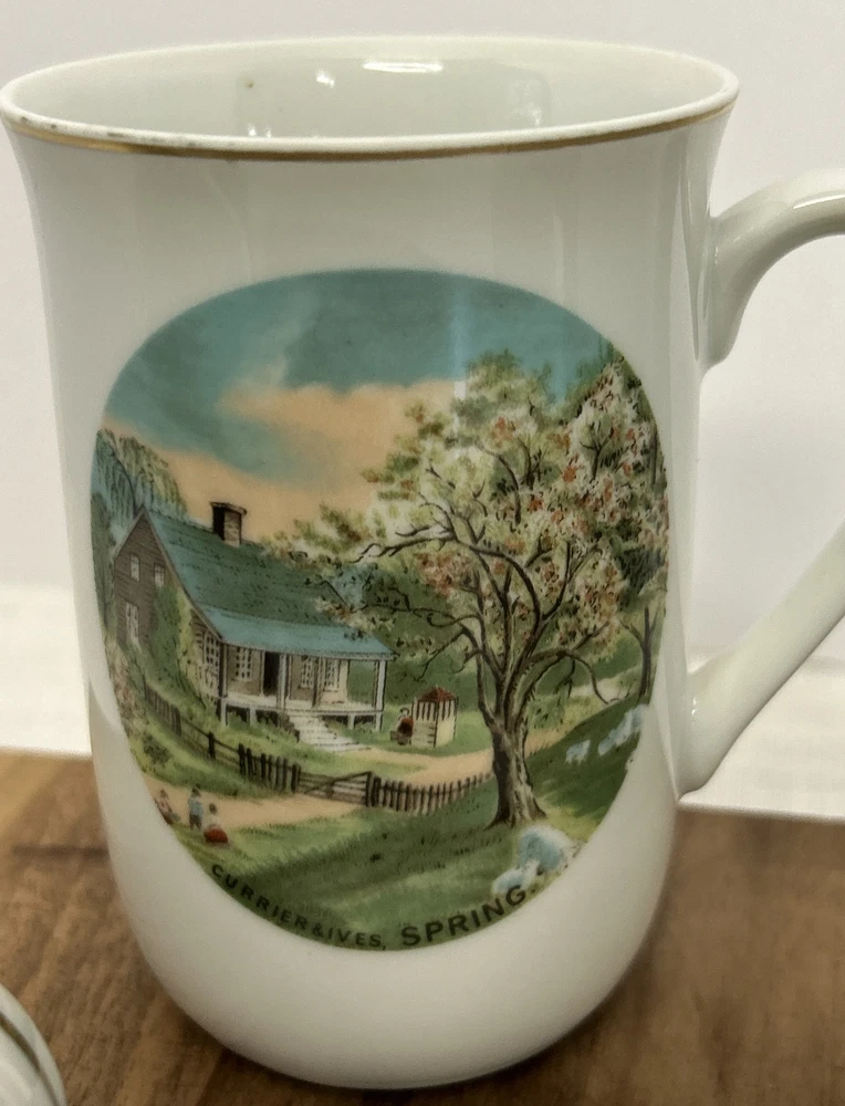 These vintage Courier & Ives set or four (4) coffee or tea mug set featuring the Four (4) (Winter/spring/Summer/Fall) Seasons will make a beautiful addition to any collection. The set includes four coffee/tea mugs, each with a unique seasonal design and gold rim. Made of durable porcelain, these mugs have a capacity of 6 to 8 ounces and stand 4 inches tall with a width of 3 inches. They are perfect for all occasions and make a great gift for any occasion including housewarming or birthday. Please note that hand washing is recommended to ensure the longevity of the beautiful designs. This vintage Set of Four (4) Seasons (Winter/Spring/Summer/Fall) Coffee/Tea Mugs by Courier & Ives and made in Japan in the 1960's are in great vintage pre-owned condition, with NO chips, cracks or repairs. However, they do show some slight minor wear consistent with their age. Please review all pictures for proper assessment of their great vintage pre-owned condition.