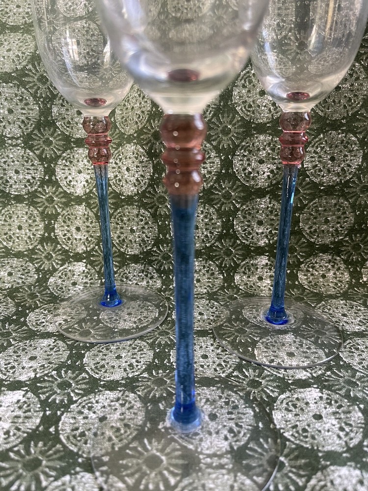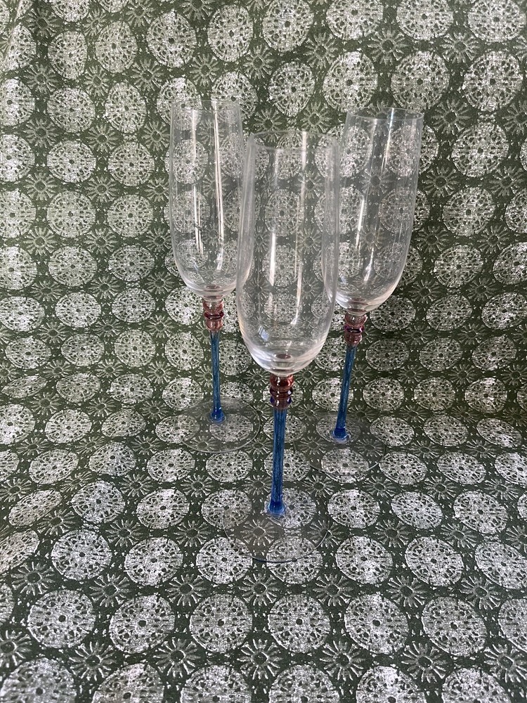 This set of three vintage Crate and Barrel champagne flutes is a stunning addition to any bar or celebration. The glasses feature a unique multicolor design, with pink and blue stems that add a touch of elegance to your sparkling wines. Each glass stands at 9 inches tall and is made of high-quality glass material, ensuring durability and longevity. The set includes three champagne flutes, perfect for toasting to your favorite moments. These glasses are ideal for those who appreciate vintage glassware and want to add a touch of sophistication to their drinkware collection. Whether you're hosting a wedding, celebrating an anniversary, or simply enjoying a night out with friends, these champagne saucers will elevate your experience.