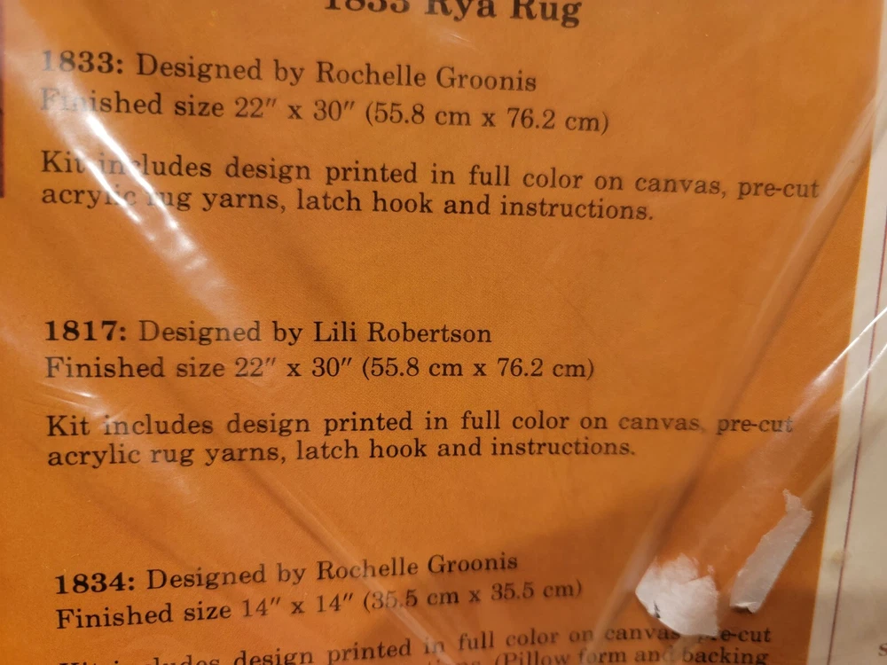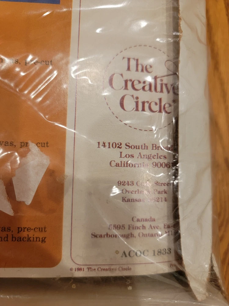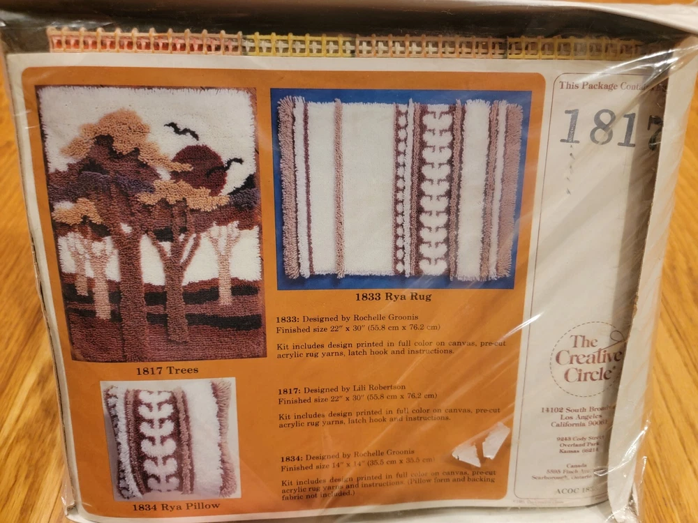 The Vintage Creative Circle Latch Hook Yarn Kit #1817 features a Trees theme, measuring 22" X 30" inches when completed. It includes Printed Canvas, Latch Hook, Instructions, Pattern/Chart, and Pre-Cut Yarn. Made in the USA, this kit is a Unit type product perfect for hobby craft enthusiasts.