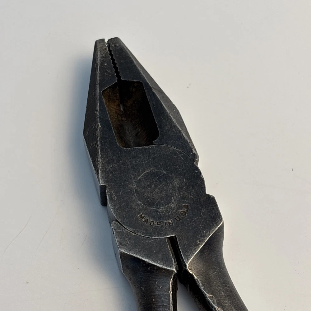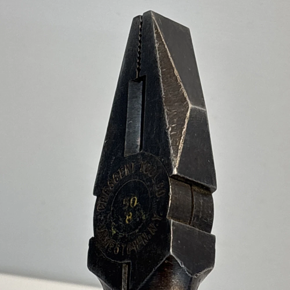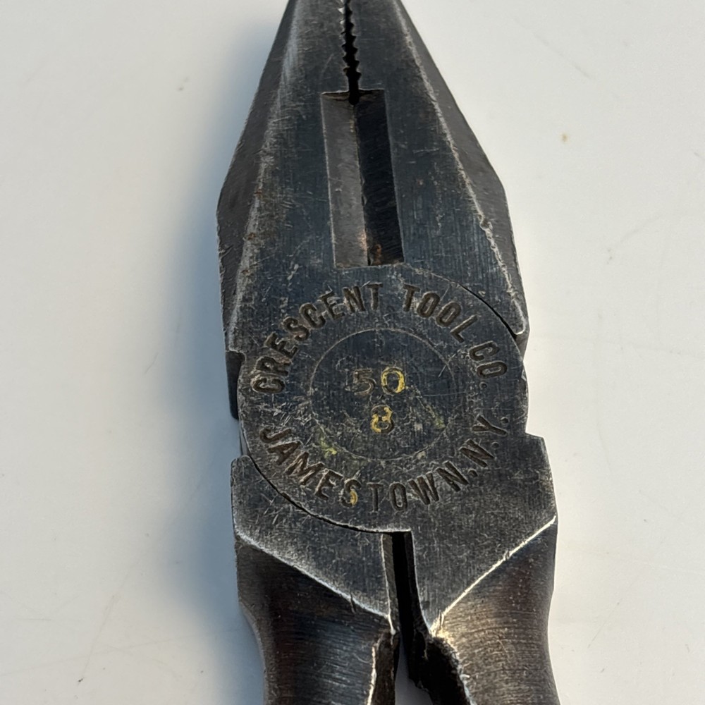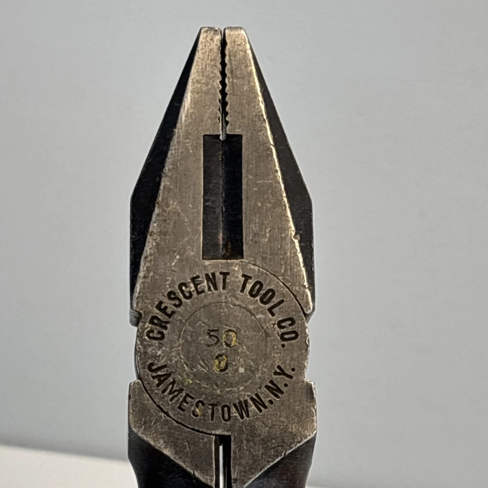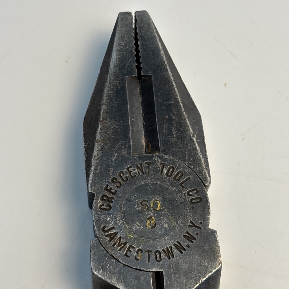 Crescent Tool Co. model 50-8 combination pliers marked Jamestown, New York USA. Forged steel construction with integrated gripping jaws, pipe grip section, and cutting edges near the pivot. Original cross-hatch grip texture on the handles. Markings are visible at the pivot. Condition Used vintage condition. Surface wear, darkened patina, and light pitting from age and use. Teeth and cutters show use but remain intact. No visible cracks or repairs.