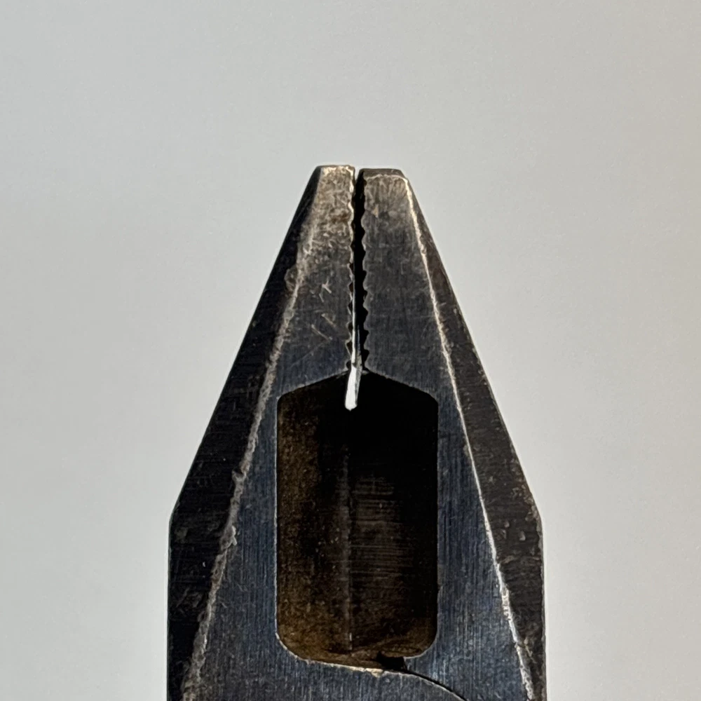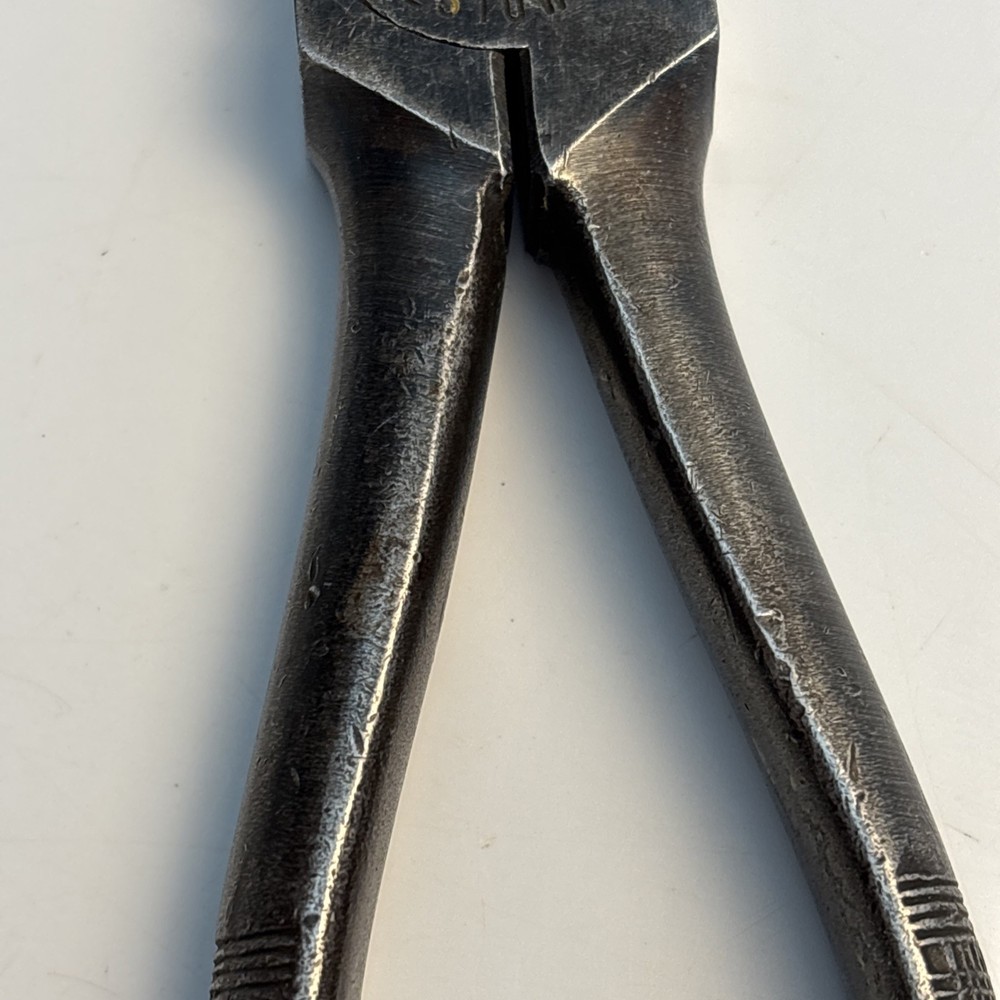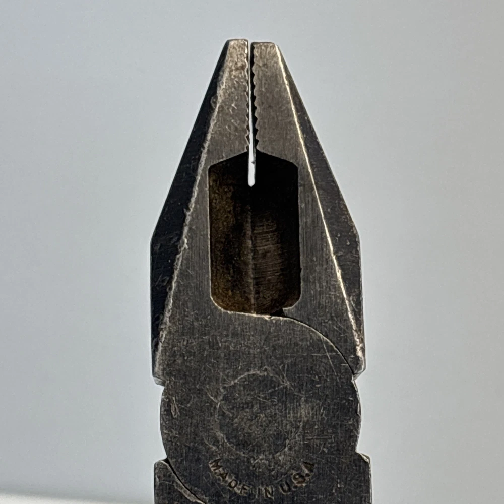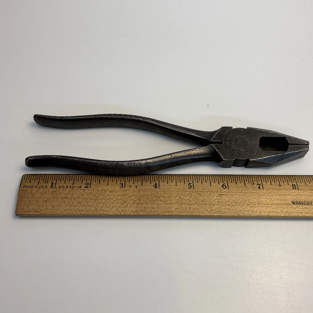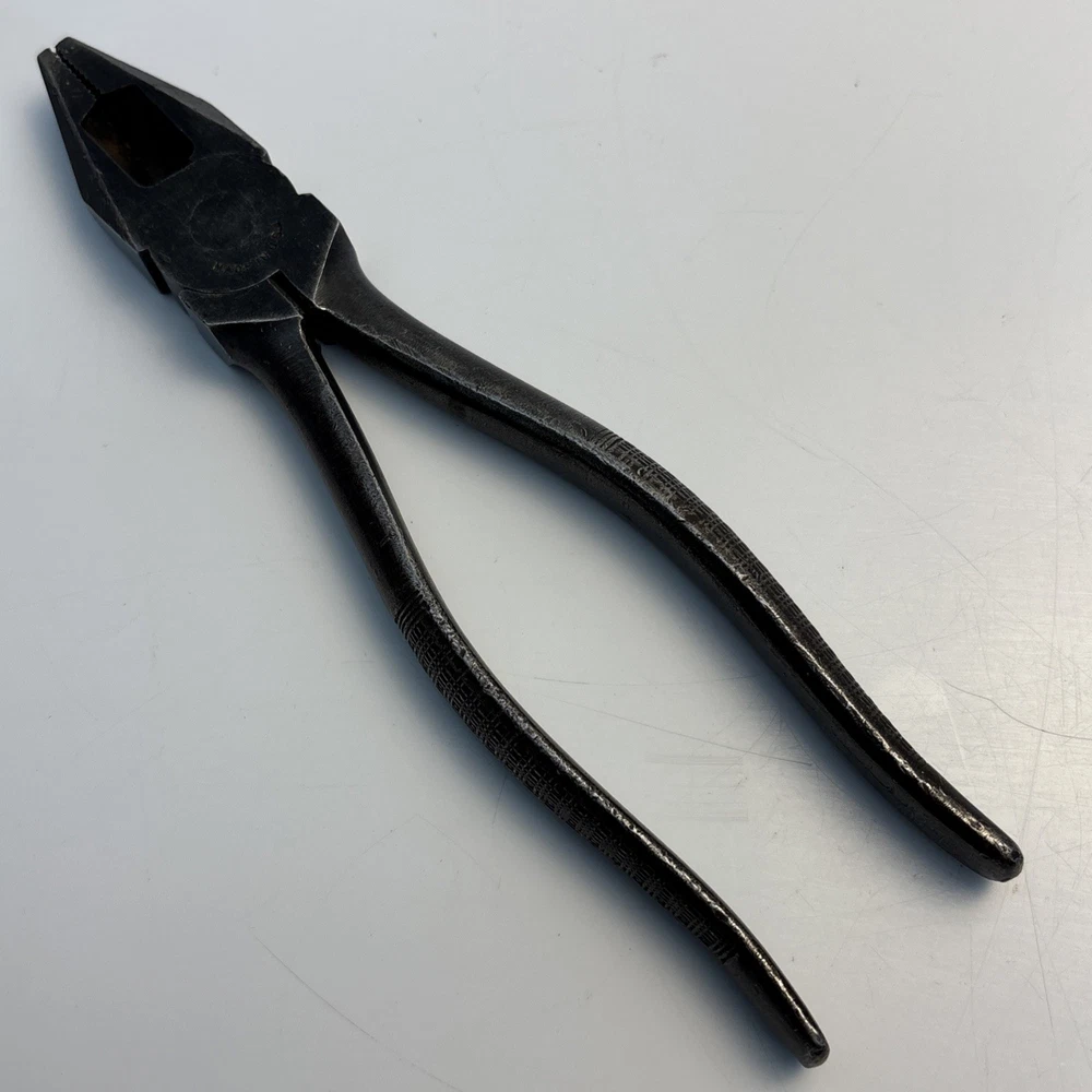 Crescent Tool Co. model 50-8 combination pliers marked Jamestown, New York USA. Forged steel construction with integrated gripping jaws, pipe grip section, and cutting edges near the pivot. Original cross-hatch grip texture on the handles. Markings are visible at the pivot. Condition Used vintage condition. Surface wear, darkened patina, and light pitting from age and use. Teeth and cutters show use but remain intact. No visible cracks or repairs.