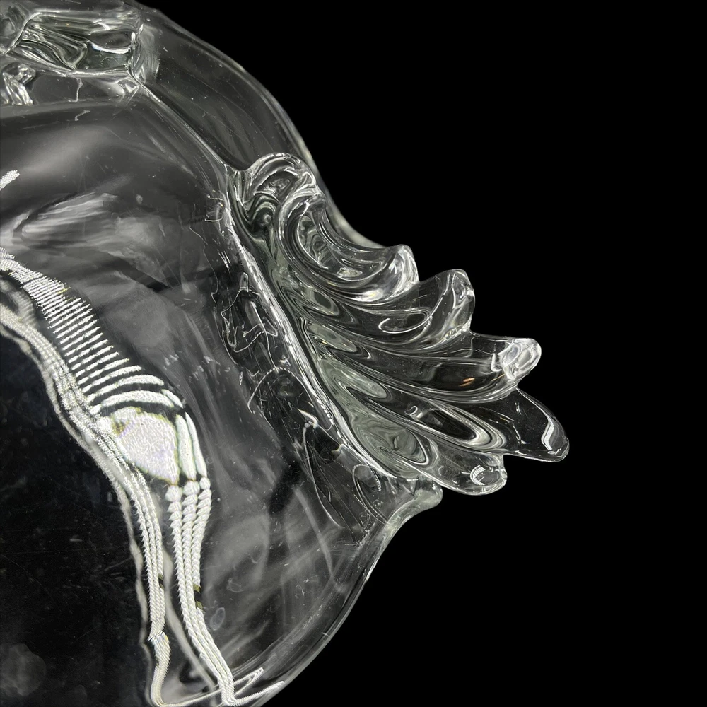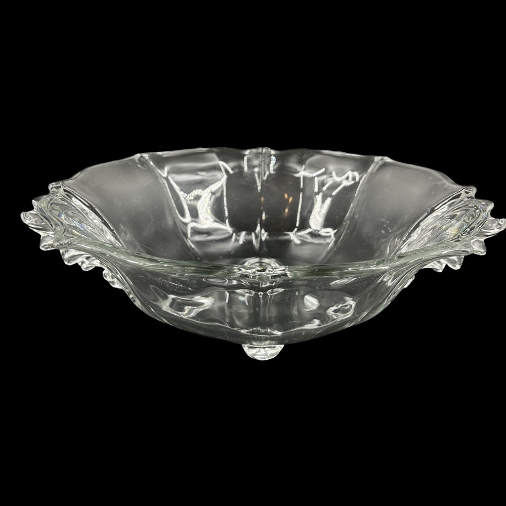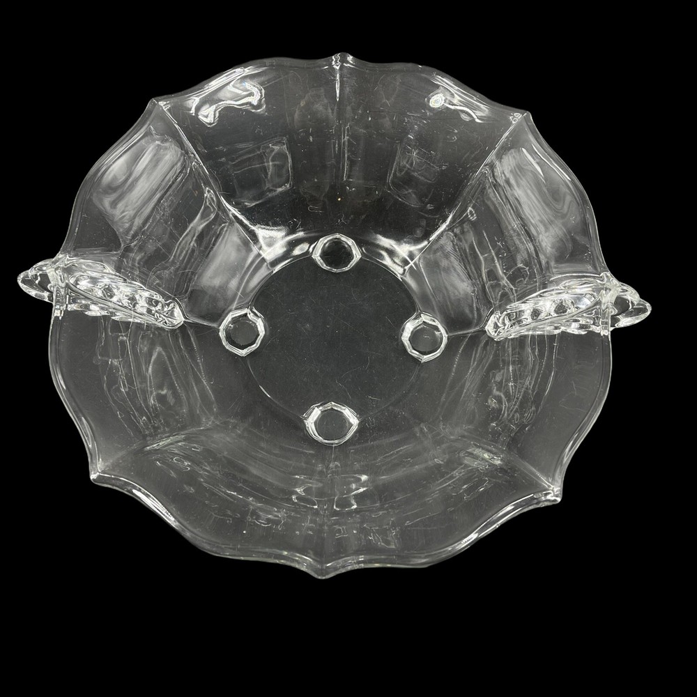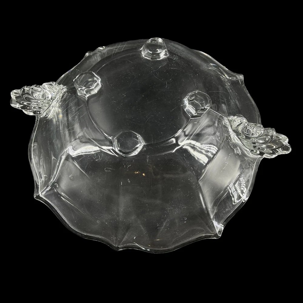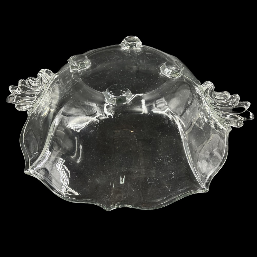 Vintage Crystal Glass 4 Footed Centerpiece Fruit Bowl 2 Handles Scalloped Edge 11" diameter at top rim. 12 5/8" across from handle tip to handle tip. 3 1/2" tall. Beautiful scrolled wing handle on each side.