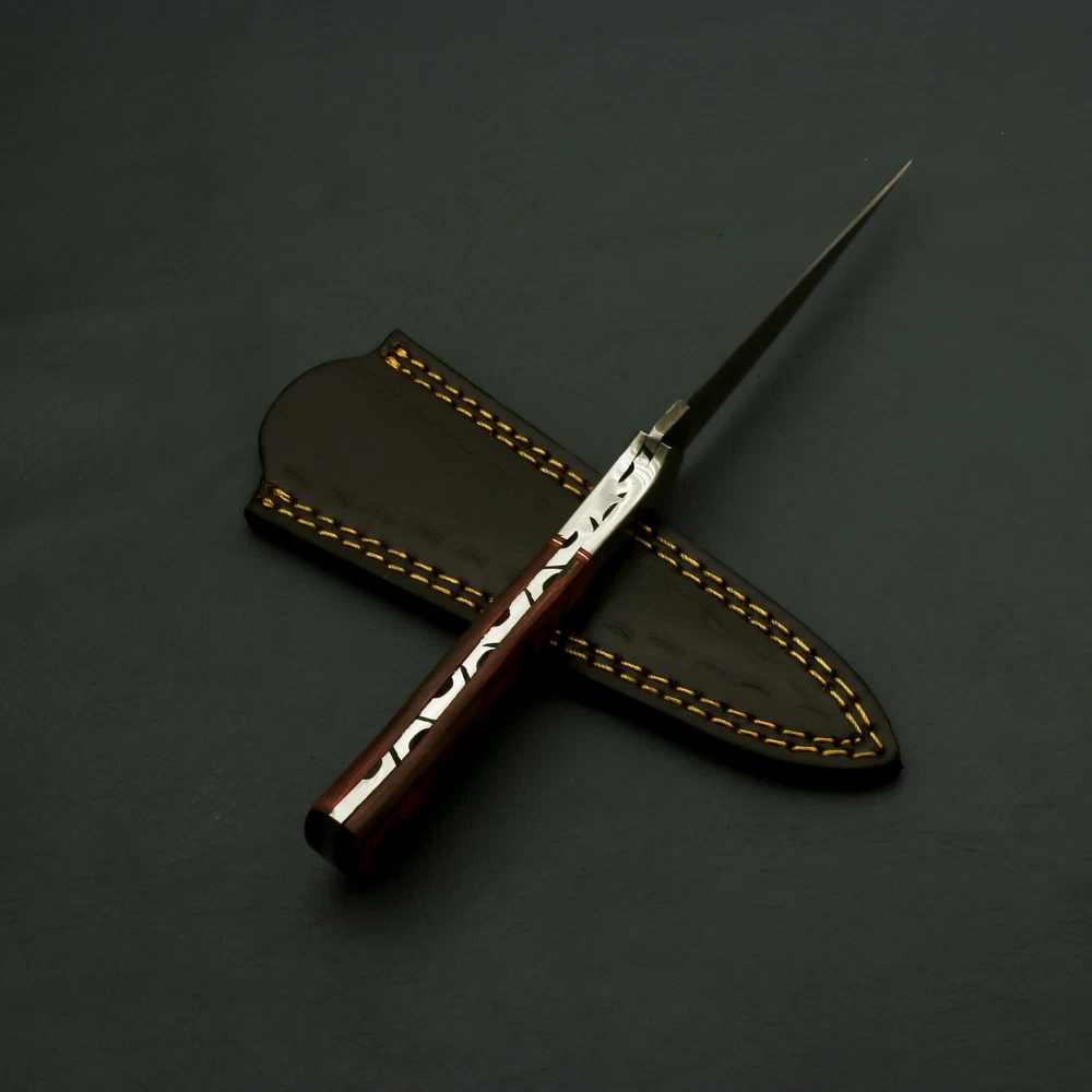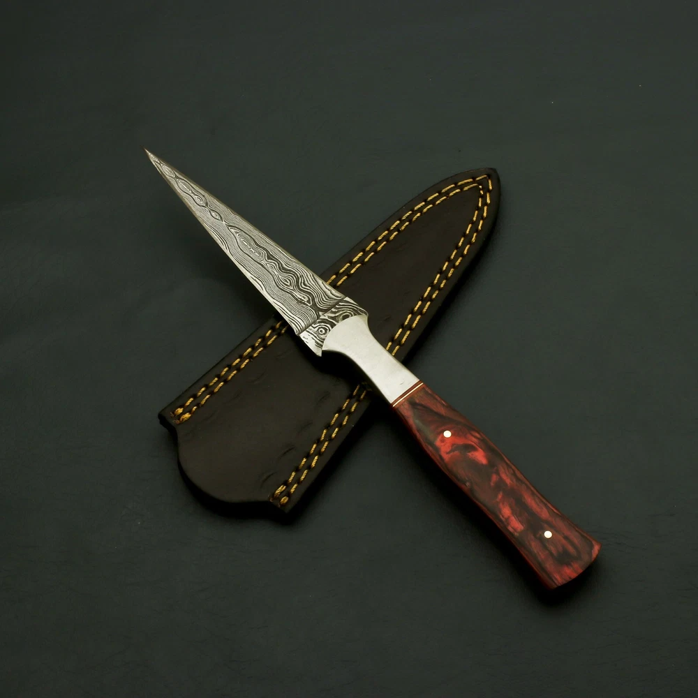 Brilliant Custom Handmade Damascus steel Hunting/Skinner handmade Knife / Sheath Behold the captivating masterpiece that is our Radiant Handmade Damascus Steel Knife with Enchanting Bolster and Custom Sheath. Immerse yourself in the enchantment of this exquisite blade, meticulously crafted to perfection with the finest materials and unparalleled craftsmanship. The heart of this extraordinary knife lies in its exceptional Damascus steel blade. Hand-forged by skilled artisans, the blade showcases the mesmerizing patterns of the Damascus technique, created by carefully layering and manipulating different types of steel. The result is a blade with striking visual appeal, as the intricate waves and ripples dance across its surface, making each knife truly one-of-a-kind. To complement its beauty and ensure its protection, this captivating knife comes with a custom sheath. Expertly tailored to fit the knife perfectly, the sheath is a testament to fine craftsmanship and attention to detail. It not only safeguards the blade but also adds an extra touch of sophistication and luxury to the ensemble. Manufactured with ultra-sharp hand forged Damascus steel cutting core at HRC58-60 hardness, this USA knife comes with unrivaled performance and incredible edge retention; Damascus steel outperforms high carbon steel in durability and is easier to sharpen as mix of high chromium steel enhance the other alloying elements. Perfect for hunting, fishing, hiking, camping, boating, backpacking, or any other outdoor adventure. It is also a key item to add to your survival tactical gear! Overall Length: 9” · Blade Length: 4.5” · Handle Length: 4.5” Handle is made of wood/rose/Pakka We do sell wholesale, please contact us for special discounts on bulk orders. FEEDBACK POLICY: YOUR FEEDBACK IS VERY IMPORTANT FOR US, IF THEIR IS ANY KIND OF PROBLEM PLEASE GIVE US OPPORTUNITY TO SORT THE ISSUE