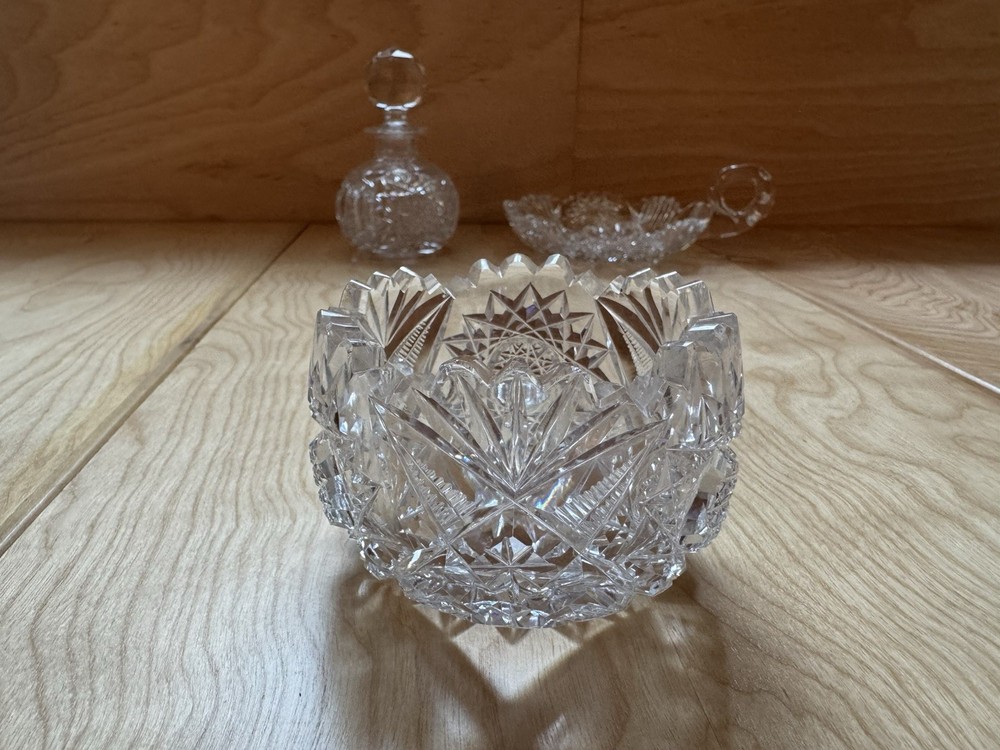 This vintage round trinket bowl showcases an intricate cut glass starburst design with a scalloped rim. A versatile piece, it measures approximately 3.5 inches in diameter and works wonderfully as a catch-all for rings, keys, or desk accessories. 🧼 No chips, cracks, or flaws — excellent vintage condition 💎 Heavy, quality feel with brilliant shine 🖼️ Final photo includes matching items — a handled dish and a perfume bottle. Check out my other listings to bundle and save on shipping!