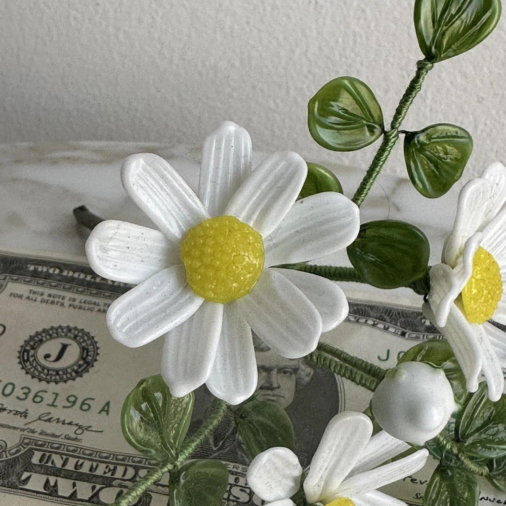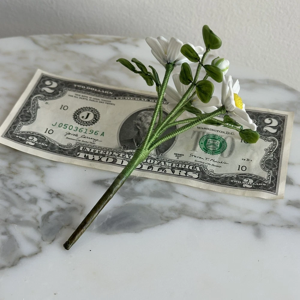 Vintage decorative flower bouquet. Glass with bendable wrapped wire construction. White flowers with green leaves. Be aware that these range in size somewhat. The bouquet pictured is approx. 4 1/4" x 3 1/2" x 5" tall. Very fine condition. Look like new!