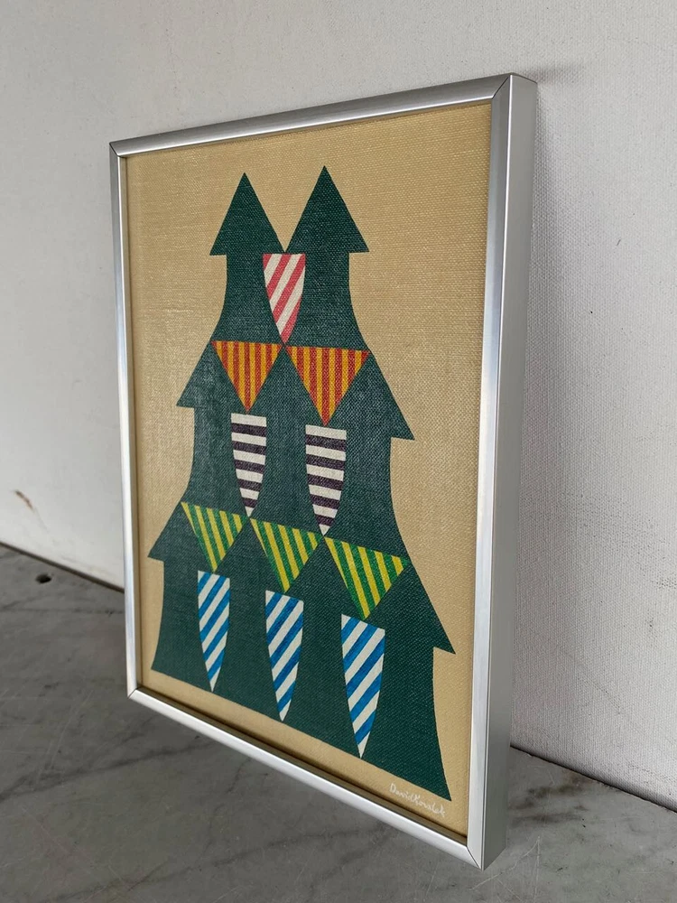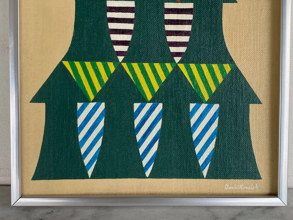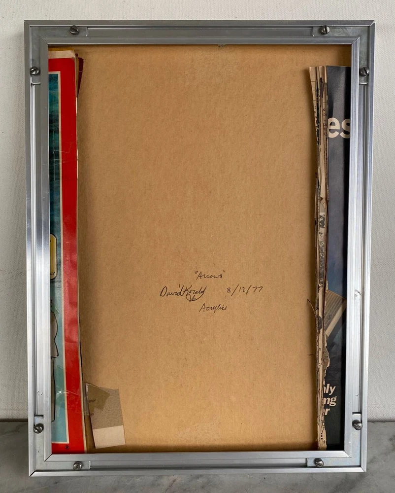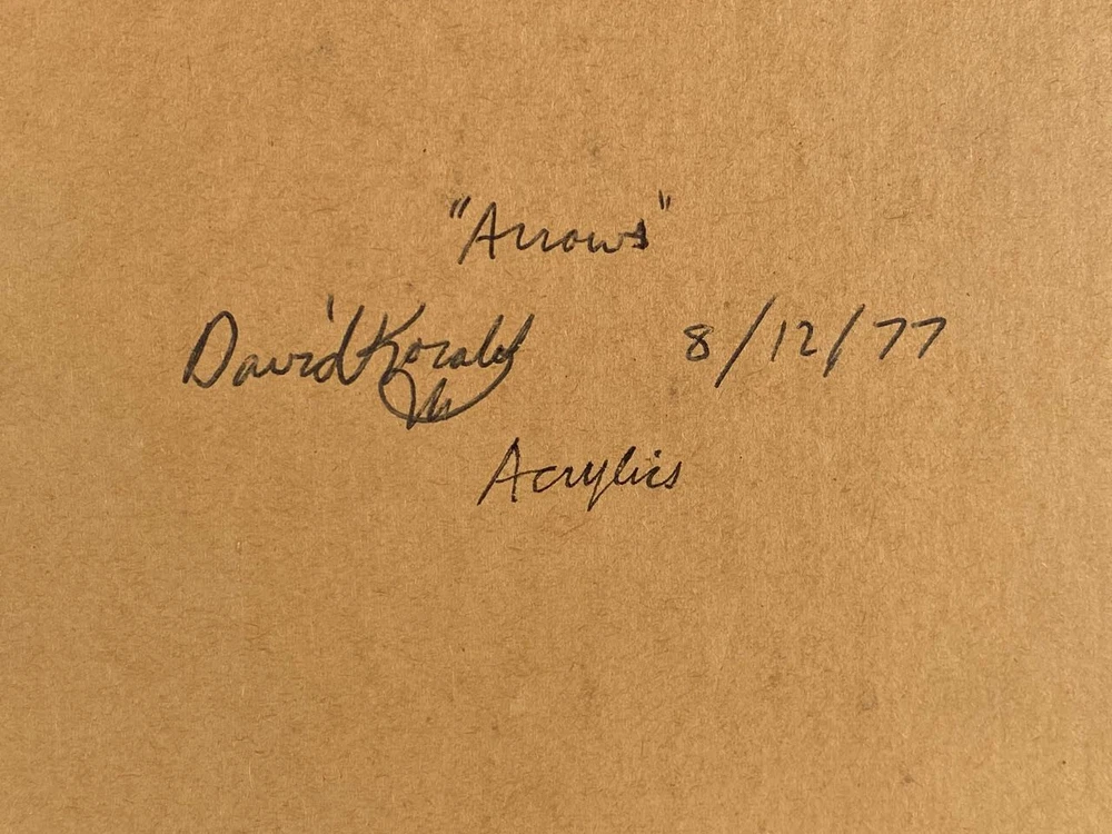 I have for sale a vintage painting by David Koralek The title of the piece is "Arrows". Executed in 8/12/77 It is a modern abstract work, that has acrylic paint on board. It shows nine arrows pointing upwards, and has colorful stripes in the negative spaces It has a careful and methodical work that has a very graphic style Signed on front and back Approximate dimensions of the frame are 12 1/4" tall, 9 1/4" wide and 3/4" deep There are some layered magazine sheets on the back—used as wedges/shims This is a finely illustrated, high quality work of art. That is in very good condition overall Thanks for looking!