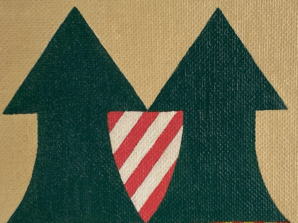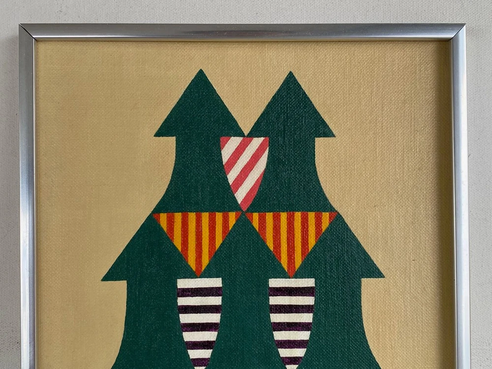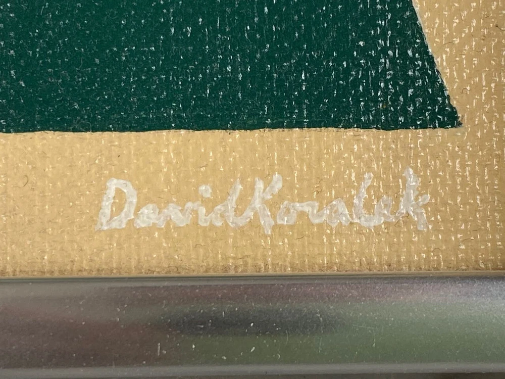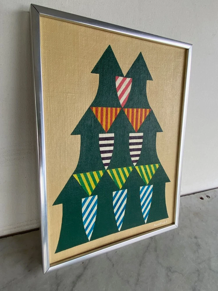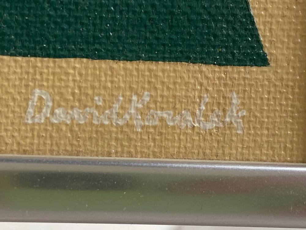 I have for sale a vintage painting by David Koralek The title of the piece is "Arrows". Executed in 8/12/77 It is a modern abstract work, that has acrylic paint on board. It shows nine arrows pointing upwards, and has colorful stripes in the negative spaces It has a careful and methodical work that has a very graphic style Signed on front and back Approximate dimensions of the frame are 12 1/4" tall, 9 1/4" wide and 3/4" deep There are some layered magazine sheets on the back—used as wedges/shims This is a finely illustrated, high quality work of art. That is in very good condition overall Thanks for looking!