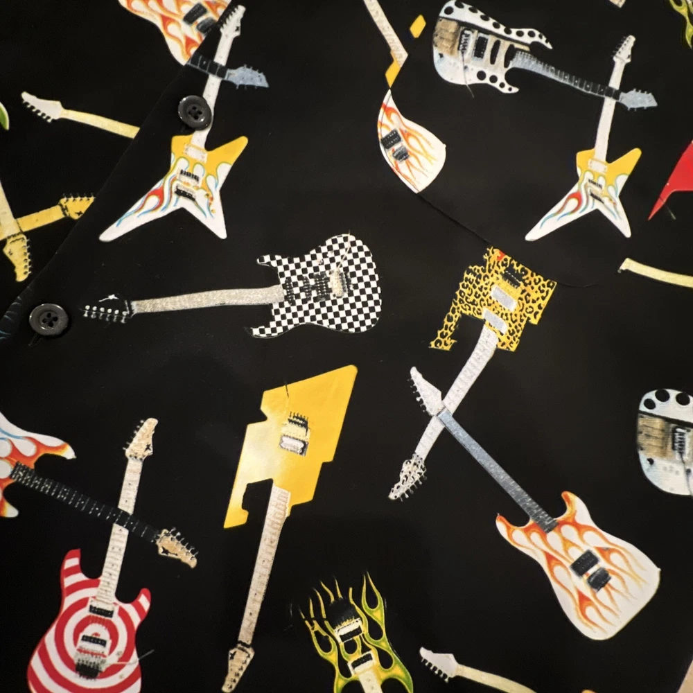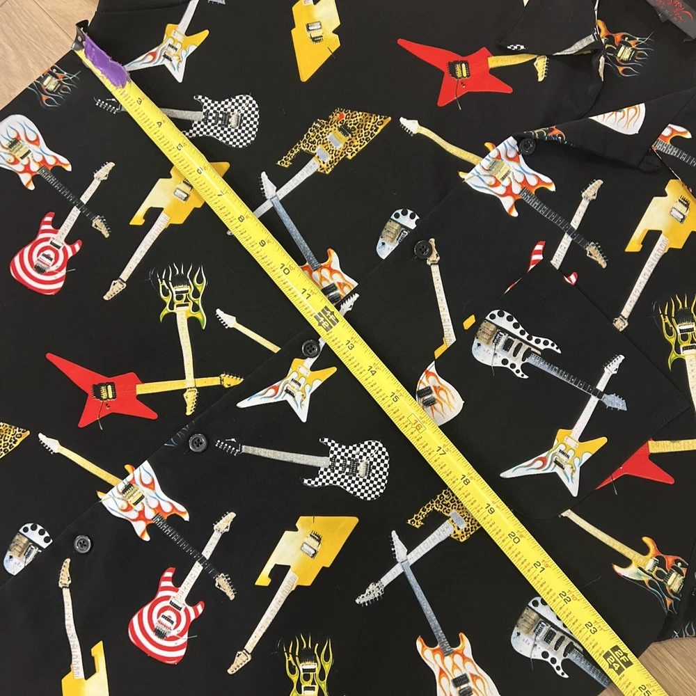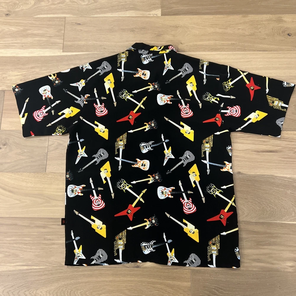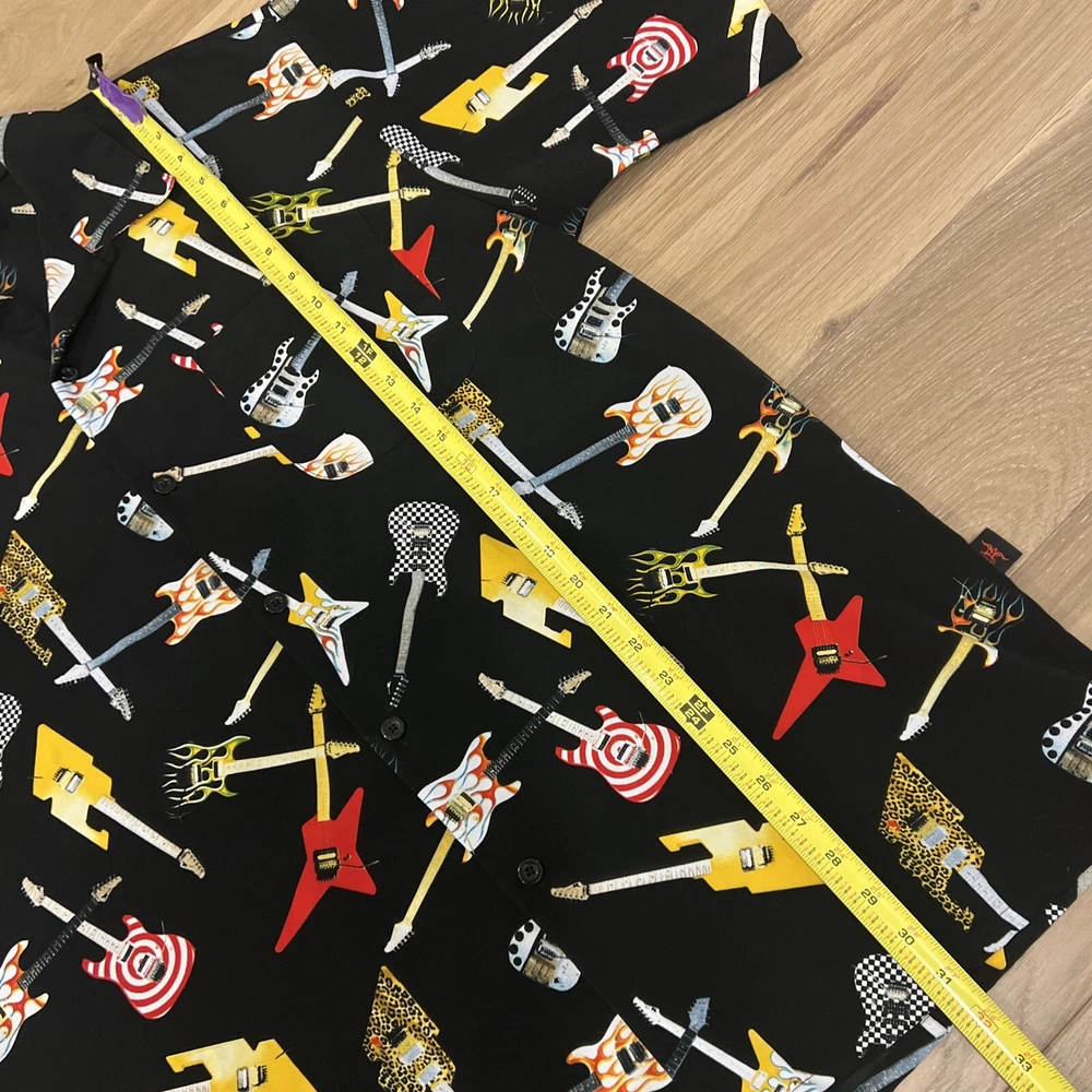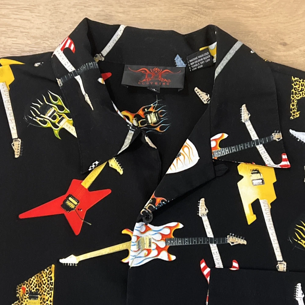Get ready to rock with this vintage DF Clothing shirt for men, featuring an electric guitar pattern. The short-sleeved button-up design is perfect for a party or casual occasion, and the spread collar adds a touch of class. Made from polyester, this shirt is easy to care for and breathable, making it ideal for summer, fall, or spring. The XL size and regular fit make it a comfortable choice for any man, while the accents and grunge theme add a touch of style. This shirt is a must-have for any 90s enthusiast and is machine washable for easy care. Don't miss out on the chance to add this unique piece to your wardrobe.