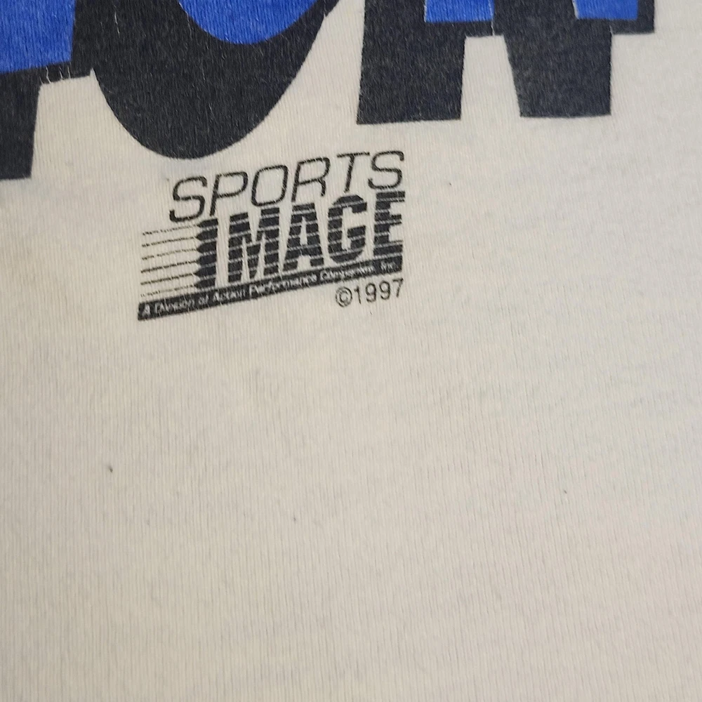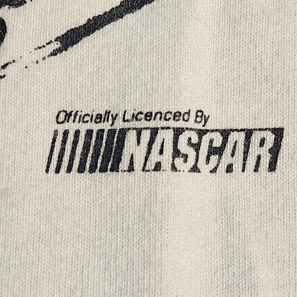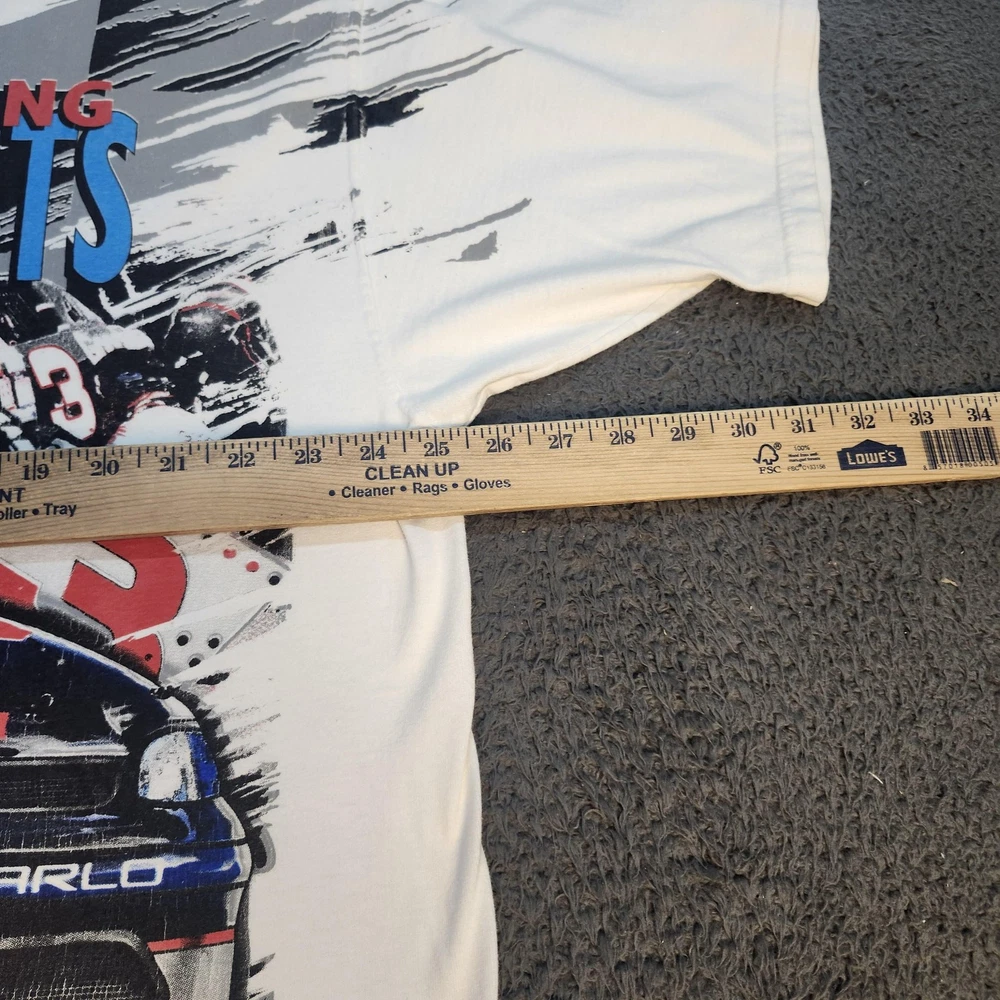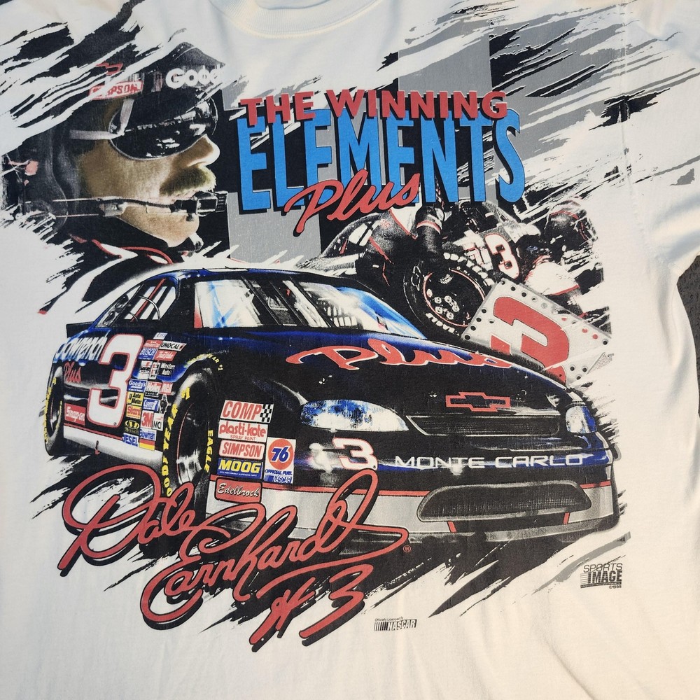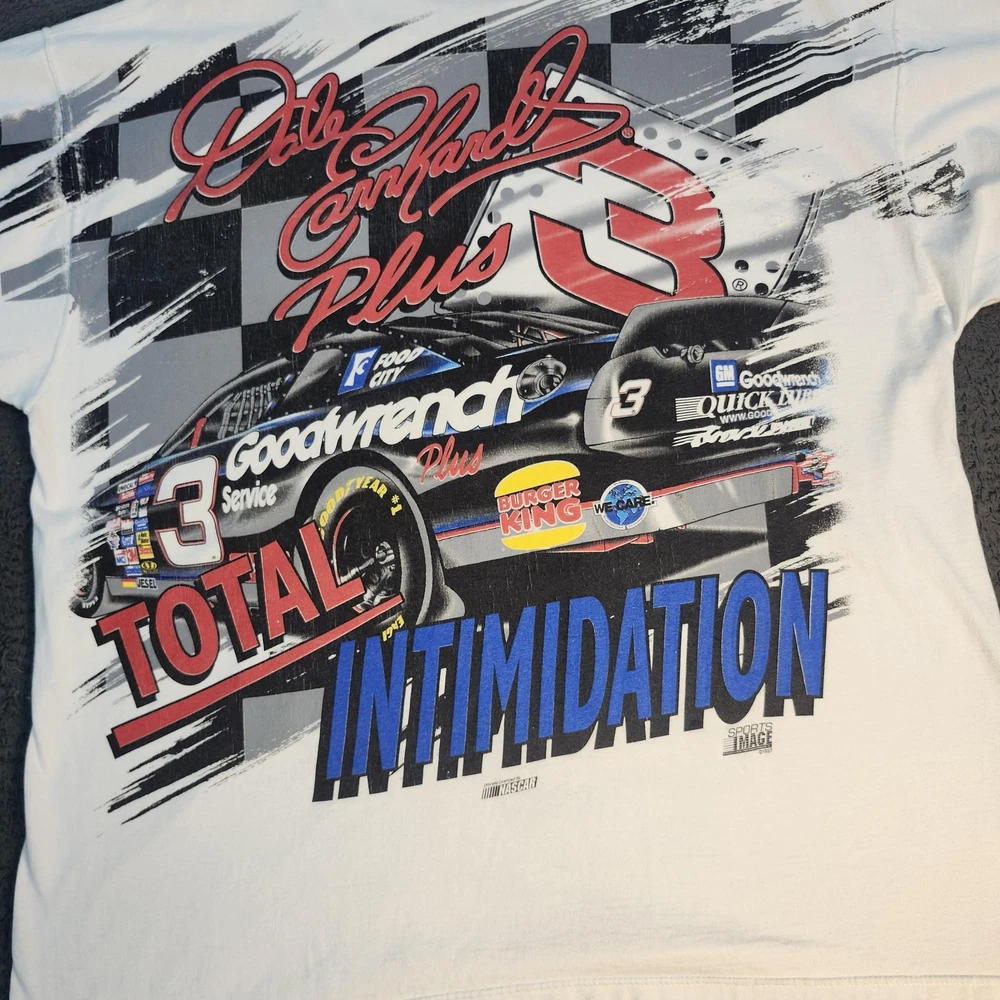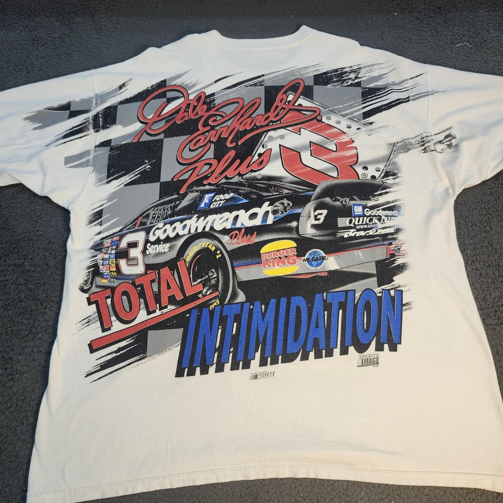 Brand: Sports Image Vintage officially licensed NASCAR Dale Earnhardt men's graphic T-shirt in white with bold multicolor print. Front design shows Dale Earnhardt portrait, his #3 Goodwrench Plus Monte Carlo car, and "The Winning Elements Plus" text with signature script. Back design features #3 Goodwrench Plus car, large "Total Intimidation" lettering, Dale Earnhardt Plus signature, checkered flag background, and sponsor logos. Tag size: Mens XL; original neck tag has been removed, size based on previous labeling and fit. Short sleeves, crew neck, double-sided racing graphic, vintage 1997–1998 Sports Image print, officially licensed by NASCAR.