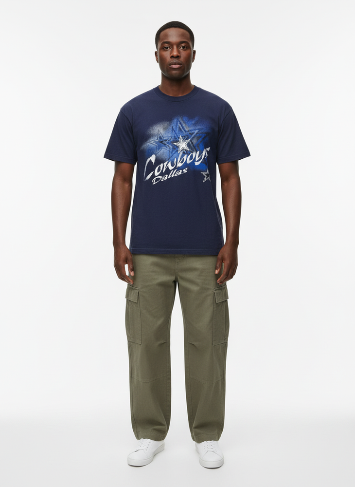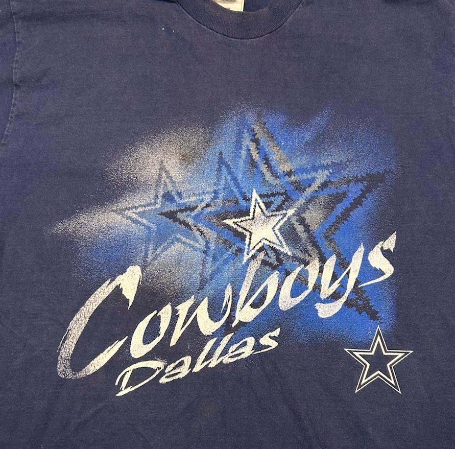 This vintage Fruit of the Loom t-shirt features a graphic print of the Dallas Cowboys NFL Football team. It is made of blue cotton material with a crew neck and short sleeves. The shirt is size L and has a regular fit. The design includes the character Stitch and has a retro 80s and 90s theme. It is machine washable and suitable for men. Has a couple spots on shirt. Check pictures for condition and measurements for size. Fits closer to a medium than a large.