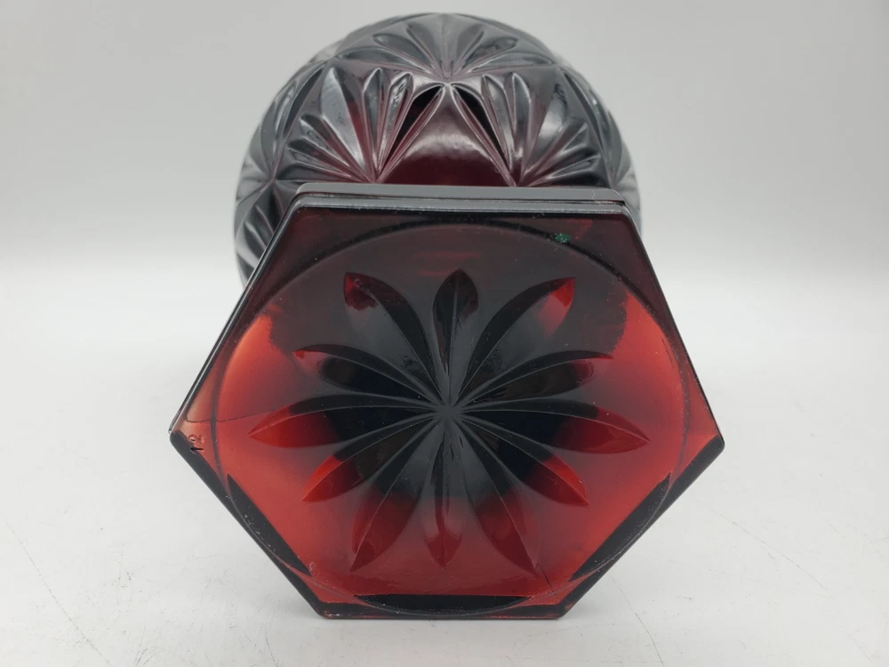The Cristal D’arques Durand Luminarc Ruby Red Glass Egg Pedestal Candy Dish Jar is a stunning antique-style collectible featuring a vibrant red glass design. Made by the reputable brand Luminarc, this original piece adds a touch of elegance to any decor with its unique egg-shaped pedestal base. Perfect for displaying candy or potpourri, this beautiful glass dish is a must-have for collectors of decorative items. Made in France circa 1984, this piece features the beautiful fanned fern pattern and stands 8.75" tall with its lid and 4.5" in diameter. The deep red color makes it great for bright holiday candy, or any time of year.