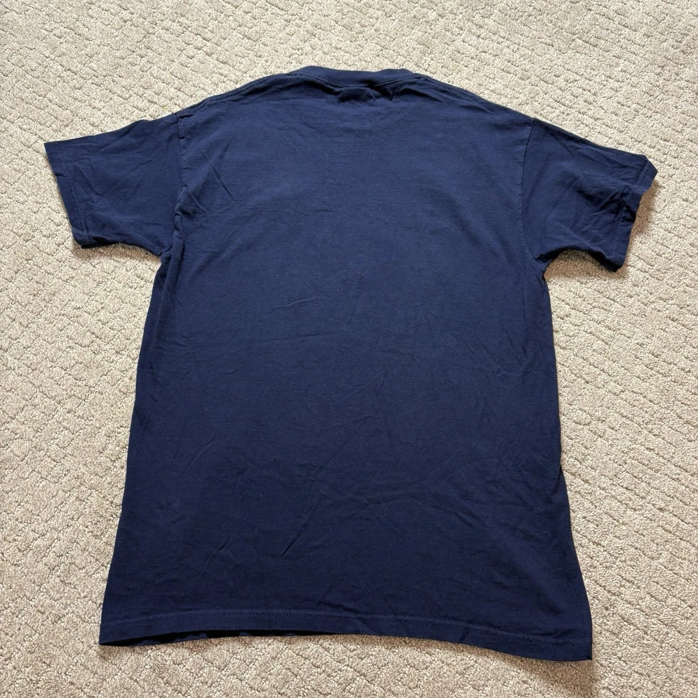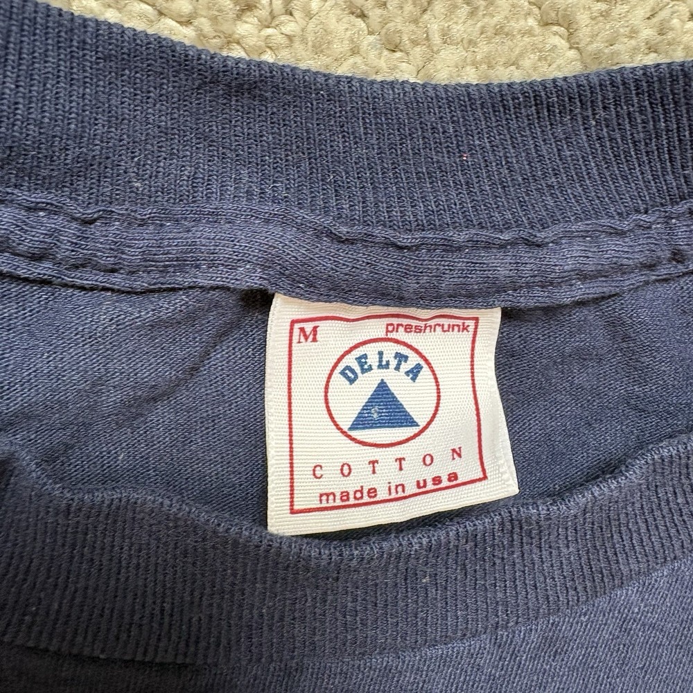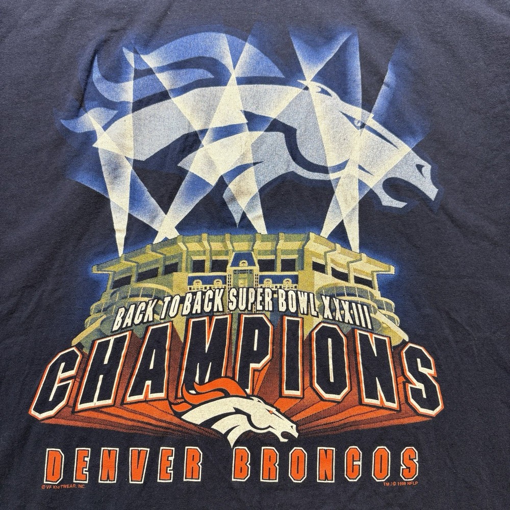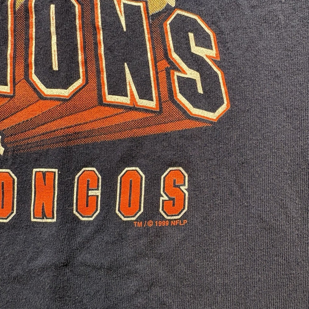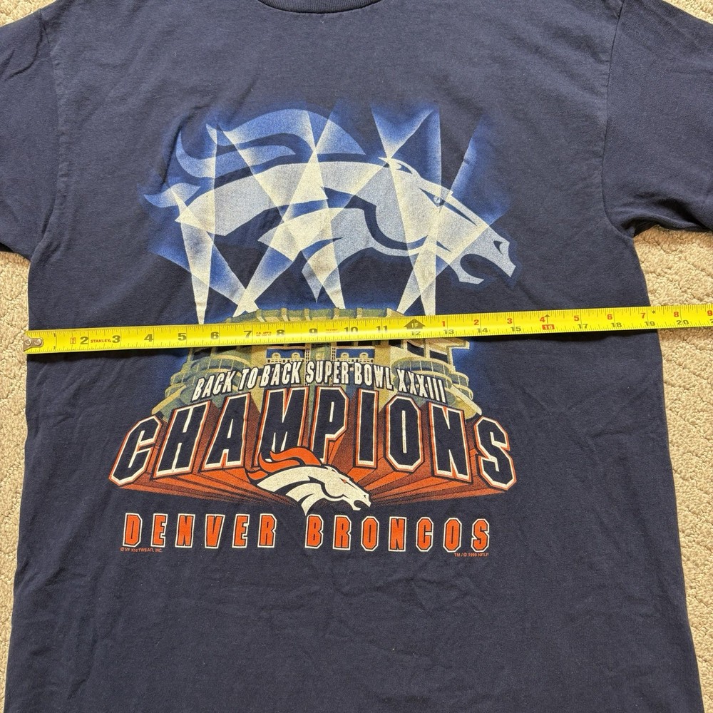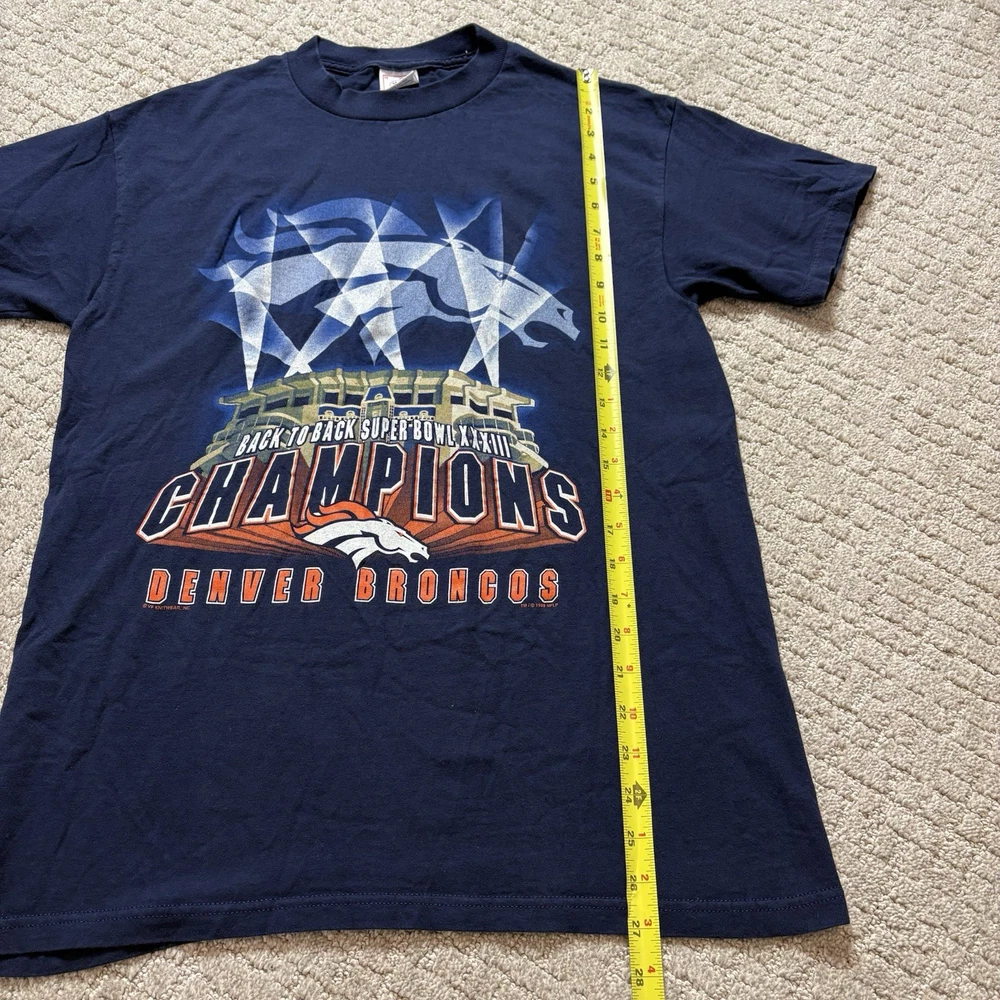 This Vintage Denver Broncos Shirt is a retro 90s NFL football tee in blue, featuring the team's logo as a graphic print on the front. Made from cotton with a microfiber fabric type, this regular fit t-shirt is machine washable and perfect for all seasons. The crew neck and short sleeves make it a comfortable and easy-care garment for any fan of the Denver Broncos or classic 90s sports apparel.