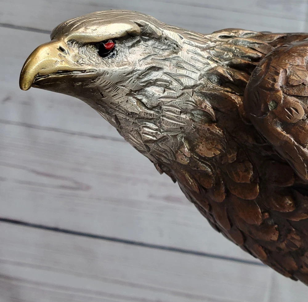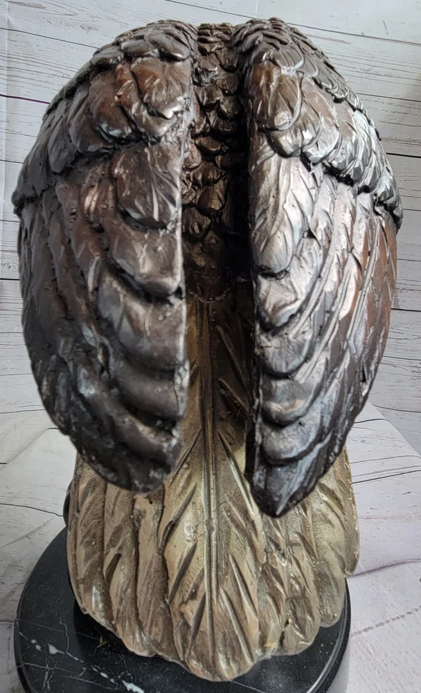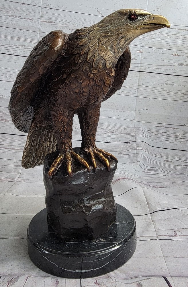 Condition : This sculpture is in perfect condition. Bronze Dimensions with Marble Base: Height 14" X Width 15" Marble Dimensions: Diameter 7" Height without base:13" Weight:20 LBS Inventory:29-5660012592 This captivating bronze sculpture portrays a magnificent bird, settling gracefully onto a rugged rock after an arduous journey away from the harsh, wintry tempests. With its powerful yet delicate presence, the bird perches majestically atop the rock, offering a panoramic view of the sprawling land below. The artist's intricate craftsmanship is reflected in the sculpture's meticulously rendered feathers, which capture the bird's beauty and grace in stunning detail, evoking a profound sense of the natural world's awe-inspiring wonder and splendor. Resting on a sleek black marble base, this sculpture stands as a testament to the artist's skillful interpretation of the avian form and the captivating allure of the wildlife it represents. The sculpture's seamless integration with the black marble base not only enhances its visual appeal but also accentuates the artwork's overall elegance and artistic significance. Crafted with meticulous attention to detail using the esteemed lost wax method, the sculpture embodies the artist's commitment to capturing the essence of the avian world and its natural magnificence. The intricate design and lifelike portrayal of the bird's form and features showcase the artist's profound understanding of the subject, elevating the sculpture to a captivating representation of the delicate balance between artistry and nature. Signed by the renowned artist Moigniez, this exceptional bronze sculpture serves as a stunning tribute to the timeless beauty and majesty of the avian realm, offering viewers a captivating glimpse into the enchanting world of wildlife and artistry. Bronze Sculpture Statue of Bald Eagle by Moigniez Marble Base Outdoor 14\" x 15\" 56600 Video will open in a new window Using the eBay App? Paste link into a browser window: [isdntekvideo]