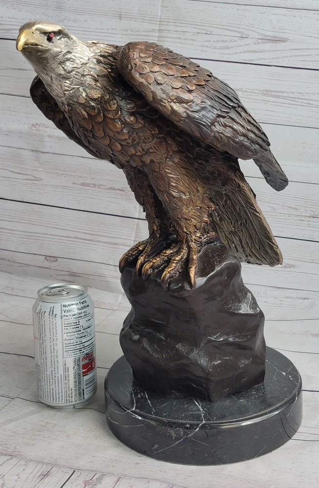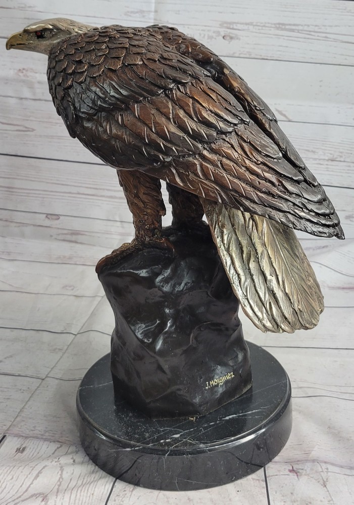 Condition : This sculpture is in perfect condition. Bronze Dimensions with Marble Base: Height 14" X Width 15" Marble Dimensions: Diameter 7" Height without base:13" Weight:20 LBS Inventory:29-5660012592 This captivating bronze sculpture portrays a magnificent bird, settling gracefully onto a rugged rock after an arduous journey away from the harsh, wintry tempests. With its powerful yet delicate presence, the bird perches majestically atop the rock, offering a panoramic view of the sprawling land below. The artist's intricate craftsmanship is reflected in the sculpture's meticulously rendered feathers, which capture the bird's beauty and grace in stunning detail, evoking a profound sense of the natural world's awe-inspiring wonder and splendor. Resting on a sleek black marble base, this sculpture stands as a testament to the artist's skillful interpretation of the avian form and the captivating allure of the wildlife it represents. The sculpture's seamless integration with the black marble base not only enhances its visual appeal but also accentuates the artwork's overall elegance and artistic significance. Crafted with meticulous attention to detail using the esteemed lost wax method, the sculpture embodies the artist's commitment to capturing the essence of the avian world and its natural magnificence. The intricate design and lifelike portrayal of the bird's form and features showcase the artist's profound understanding of the subject, elevating the sculpture to a captivating representation of the delicate balance between artistry and nature. Signed by the renowned artist Moigniez, this exceptional bronze sculpture serves as a stunning tribute to the timeless beauty and majesty of the avian realm, offering viewers a captivating glimpse into the enchanting world of wildlife and artistry. Bronze Sculpture Statue of Bald Eagle by Moigniez Marble Base Outdoor 14\" x 15\" 56600 Video will open in a new window Using the eBay App? Paste link into a browser window: [isdntekvideo]