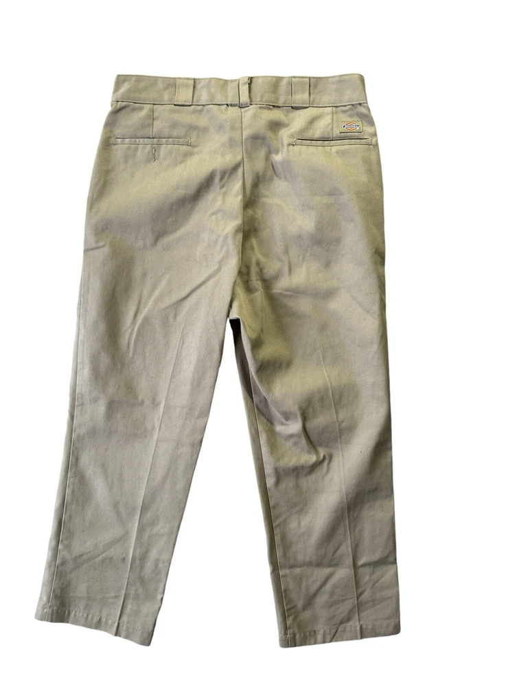 This pair of vintage Dickies pants is a must-have for any fashion-savvy man. The beige color and solid pattern make them versatile enough to wear for work or casual occasions. The pants feature a zip and hook & eye closure, with a flat front and straight leg style. Made in the USA from a blend of polyester and cotton canvas fabric, these pants are durable and machine washable. They come in a size 38 waist and 26 inseam, with pockets for added convenience. The pants also have the Dickies logo accent, adding a touch of style to the classic chino design. Perfect for winter, fall, and spring, these pants are a great addition to any wardrobe.